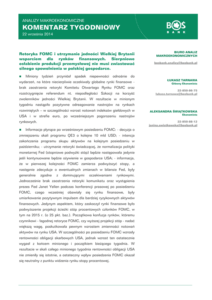 ANALIZY MAKROEKONOMICZNE KOMENTARZ TYGODNIOWY 22 września 2014 Retoryka FOMC i utrzymanie jedności Wielkiej Brytanii wsparciem dla rynków finansowych. Sierpniowe osłabienie produkcji przemysłowej nie musi zwiastować silnego spowolnienia w polskiej gospodarce. Miniony tydzień przyniósł spadek niepewności odnośnie BIURO ANALIZ MAKROEKONOMICZNYCH [email protected] do wydarzeń, na które niecierpliwie oczekiwały globalne rynki finansowe brak zaostrzenia retoryki Komitetu Otwartego Rynku FOMC oraz rozstrzygnięcie referendum nt. niepodległości Szkocji na korzyść ŁUKASZ TARNAWA Główny Ekonomista 22-850-86-75 [email protected] zwolenników jedności Wielkiej Brytanii. W rezultacie w minionym tygodniu nastąpiło pozytywne odreagowanie nastrojów na rynkach rozwiniętych – w szczególności wzrost notowań indeksów giełdowych w USA i w strefie euro, po wcześniejszym pogorszeniu nastrojów rynkowych. zmniejszeniu skali programu QE3 o kolejne 10 mld USD; - intencja zakończenia programu skupu aktywów na kolejnym posiedzeniu w październiku; - utrzymanie retoryki świadczącej, że normalizacja polityki monetarnej Fed (stopniowe podwyżki stóp) będzie następowała jedynie jeśli kontynuowane będzie ożywienie w gospodarce USA; - informacja, że w pierwszej kolejności FOMC zamierza podwyższyć stopy, a następnie zdecyduje o ewentualnych zmianach w bilansie Fed, były zgodne z dominującymi oczekiwaniami rynkowymi. Jednocześnie brak zaostrzenia retoryki komunikatu oraz wystąpienia prezes Fed Janet Yellen podczas konferencji prasowej po posiedzeniu FOMC, Ekonomista 22-850-88-12 [email protected] Informacje płynące po wrześniowym posiedzeniu FOMC: - decyzja o generalnie ALEKSANDRA ŚWIĄTKOWSKA czego wcześniej obawiały się rynku finansowe, były umiarkowanie pozytywnym impulsem dla bardziej ryzykownych aktywów finansowych. Jedynym aspektem, który zaskoczył rynki finansowe było podwyższenie projekcji ścieżki stóp procentowych członków FOMC, w tym na 2015 r. (o 25 pkt. baz.). Początkowa konfuzja rynków, któremu czynnikowi - łagodnej retoryce FOMC, czy wyższej projekcji stóp - nadać większą wagę, poskutkowała pewnym wzrostem zmienności notowań aktywów na rynku USA. W szczególności po posiedzeniu FOMC wzrosły rentowności obligacji skarbowych USA, jednak wzrost ten ostatecznie wygasł z końcem minionego i początkiem bieżącego tygodnia. W rezultacie w skali całego minionego tygodnia rentowności obligacji USA nie zmieniły się istotnie, a ostateczny wpływ posiedzenia FOMC okazał się neutralny z punktu widzenia rynku stopy procentowej. W przypadku rynku europejskiego, oprócz bardzo istotnego (i pozytywnego dla aktywów europejskich) wyniku referendum w Szkocji, oczekiwanym wydarzeniem była pierwsza operacja EBC dostarczania długoterminowego finansowania dedykowanego aktywizacji akcji kredytowej banków strefy euro (TLTRO). Mniejszy od oczekiwań popyt banków komercyjnych na środki finansowe (83 mld EUR vs. ok. 100 mld EUR oczekiwane) zinterpretowany został przez część inwestorów jako przybliżenie się perspektywy programu skupu obligacji skarbowych przez EBC. Poskutkowało to pod koniec tygodnia spadkiem rentowności 10letnich obligacji skarbowych Niemiec, który był kontynuowany na początku bieżącego tygodnia w okolice poziomu ok. 1% (choć rentowności pozostały powyżej historycznego minimum z końca sierpnia, po wystąpieniu prezesa EBC w Jackson Hole). Kontynuowane zróżnicowanie perspektyw polityki monetarnej w USA (oczekiwane stopniowe podwyżki stóp) i w strefie euro (dalsze luzowanie z nadziejami rynkowymi na QE w wykonaniu EBC) poskutkowało w minionym tygodniu dalszym osłabieniem euro wobec dolara w kierunku 1,28 dolara za euro. Równolegle w kontraście do sytuacji na rynkach rozwiniętych na większości rynkach wschodzących, w szczególności w Azji, miało miejsce pogorszenie nastrojów - m.in. spadek indeksu akcji MSCI dla rynków wschodzących. Przyczyną tego była m.in. seria gorszych od oczekiwań danych z Chin, które wskazały na spowolnienie aktywności gospodarki chińskiej. Ostatecznie czynnikiem, który złagodził negatywny wydźwięk danych była operacja dostarczania bankom płynności finansowej przeprowadzona przez chiński bank centralny, która m.in. zwiększyła nadzieje na obniżenie stóp procentowych w Chinach. Segmentem rynków wschodzących, który zachowywał się w minionym tygodniu odmiennie niż cała klasa tych aktywów był region Europy Środkowej, gdzie w ślad za rynkami rozwiniętymi nastroje rynkowe poprawiły się. Zapewne istotny udział w tej poprawie miała stabilizacja sytuacji wokół Ukrainy (tj. utrzymanie zawieszenia broni oraz brak nowych negatywnych informacji) – szczególnie, że w okresie wzrostu awersji do ryzyka wokół kryzysu Ukraina-Rosja, aktywa z tego regionu traciły silniej na tle całej grupy rynków wschodzących. Ubiegłotygodniowa sytuacja na krajowym rynku finansowym także podążała w ślad za rynkami rozwiniętymi ignorując pogorszenie nastrojów na rynkach wschodzących. W szczególności wyraźną poprawę odnotowano na rynku akcji, który wzrósł w minionym tygodniu o blisko 2% i odnotował kolejne lokalne maksimum indeksu WIG20. Uspokojenie sytuacji na Ukrainie i dalsze odreagowywanie złych nastrojów z lipca i początku sierpnia, przy pozytywnym wsparciu rynków rozwiniętych 2 2014-09-22 zapewne odegrało w tym procesie kluczową rolę, przeważając nad negatywnym wydźwiękiem publikacji nt. krajowej gospodarki wskazujących na dalsze spowolnienie dynamiki PKB w III kw. Zmiany notowań w pozostałych segmentach krajowego rynku finansowego były już mniej spektakularne. Rentowności krajowych obligacji skarbowych w skali tygodnia nie zmieniły się istotnie, niemniej w trakcie tygodnia wahały się w ślad za rynkami rozwiniętymi notując okresowy wzrost po decyzji FOMC i spadek pod koniec tygodnia w ślad za obligacjam