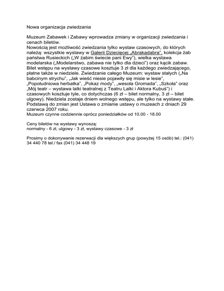 Nowa organizacja zwiedzania Muzeum Zabawek i Zabawy wprowadza zmiany w organizacji zwiedzania i cenach biletów. Nowością jest możliwość zwiedzania tylko wystaw czasowych, do których należą: wszystkie wystawy w Galerii Dziecięcej „Abrakadabra”, kolekcja żab państwa Rusieckich („W żabim świecie pani Ewy”), wielka wystawa modelarska („Modelarstwo, zabawa nie tylko dla dzieci”) oraz kącik zabaw. Bilet wstępu na wystawy czasowe kosztuje 3 zł dla każdego zwiedzającego, płatne także w niedziele. Zwiedzanie całego Muzeum: wystaw stałych („Na babcinym strychu”, „Jak wieść niesie pojawiły się misie w lesie”, „Popołudniowa herbatka”, „Pokaz mody”, „wesoła Gromada”, „Szkoła” oraz „Mój teatr – wystawa lalki teatralnej z Teatru Lalki i Aktora Kubuś”) i czasowych kosztuje tyle, co dotychczas (6 zł – bilet normalny, 3 zł – bilet ulgowy). Niedziela zostaje dniem wolnego wstępu, ale tylko na wystawy stałe. Podstawą do zmian jest Ustawa o zmianie ustawy o muzeach z dniach 29 czerwca 2007 roku. Muzeum czynne codziennie oprócz poniedziałków od 10.00 - 18.00 Ceny biletów na wystawy wynoszą: normalny - 6 zł, ulgowy - 3 zł, wystawy czasowe - 3 zł Prosimy o dokonywanie rezerwacji dla większych grup (powyżej 15 osób) tel.: (041) 34 440 78 tel./ fax (041) 34 448 19