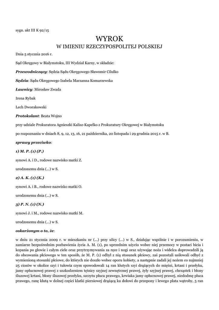 sygn. akt III K 92/15 WYROK W IMIENIU RZECZYPOSPOLITEJ POLSKIEJ Dnia 5 stycznia 2016 r. Sąd Okręgowy w Białymstoku, III Wydział Karny, w składzie: Przewodniczący: Sędzia Sądu Okręgowego Sławomir Cilulko Sędzia: Sądu Okręgowego Izabela Marzanna Komarzewska Ławnicy: Mirosław Zwada Irena Rybak Lech Dworakowski Protokolant: Beata Wojno przy udziale Prokuratora Agnieszki Kalisz-Kapelko z Prokuratury Okręgowej w Białymstoku po rozpoznaniu w dniach 8, 9, 12, 13, 16, 21 października, 20 listopada i 29 grudnia 2015 r. w B. sprawy przeciwko: 1) M. P. (1) (P.) synowi A. i D., rodowe nazwisko matki Z. urodzonemu dnia (...) w S. 2) A. K. (1) (K.) synowi A. i B., rodowe nazwisko matki O. urodzonemu dnia (...) w S. 3) P. N. (1) (N.) synowi J. i M., rodowe nazwisko matki M. urodzonemu dnia (...) w S. oskarżonym o to, że: w dniu 21 stycznia 2009 r. w mieszkaniu nr (...) przy ulicy (...) w S., działając wspólnie i w porozumieniu, w zamiarze bezpośrednim pozbawienia życia A. M. (1), po uprzednim użyciu wobec niej przemocy w postaci bicia i kopania po głowie i całym ciele oraz przytrzymywania za ręce i nogi oraz używając noża i widelca doprowadzili ją do obcowania płciowego w ten sposób, że M. P. (1) odbył z nią stosunek płciowy, zaś pozostali usiłowali odbyć z wymienioną stosunki płciowe, do których nie doszło wobec oporu kobiety, a następnie zadali jej nożem co najmniej 25 ciosów w okolice szyi i tułowia czym spowodowali 14 ran kłutych szyi drążących do mięśni, krtani i przełyku, jamy opłucnowej prawej z uszkodzeniem tętnicy szyjnej zewnętrznej prawej, żyły szyjnej prawej, chrząstek i błony śluzowej krtani, błony śluzowej przełyku, szczytu płuca prawego, krwiaka jamy opłucnowej prawej, niedodmę płuca prawego, ranę kłutą w dolnej części klatki piersiowej drążącą ku dołowi do przepony i lewego płata wątroby, 5 ran kłutych brzucha drążących do prawego płata wątroby, jelita cienkiego oraz krezki jelita cienkiego i torby sieciowej i do tkanek miękkich, krwawienie do jamy otrzewnej, liczne otarcia naskórka, podbiegnięcia krwawe w spojówkach powiek oczu z wylewem krwawych podspojówkowym w gałce ocznej lewej, rozsiane wybroczyny krwawe w skórze twarzy, drobne nacięcia skóry – powierzchowne rany kłute w skórze brzucha, podbiegnięcia krwawe i otarcia naskórka na brzuchu, przecięcia skóry na palcach ręki prawej po stronie dłoniowej, otarcia naskórka i podbiegnięcia krwawe na grzbiecie ręki lewej, podbiegnięcia krwawe na kolanie i goleni prawej, podbiegnięcia krwawe na palcach stopy prawej oraz goleni lewej, podbiegnięcia krwawe powłok miękkich czaszki w okolicach czołowo-ciemieniowej, podbiegnięcia krwawe lewego mięśnia skroniowego, które to obrażenia skutkowały wstrząsem urazowym krwotocznym powstałym w wyniku uszkodzenia narządów szyi, naczyń krwionośnych, płuca prawego i wątroby co doprowadziło do zgonu, po czym w celu przywłaszczenia zabrali laptop A. o wartości 1.999 zł na szkodę B. O. (1) i pierścionek o wartości 300 zł na szkodę E. A. (1), tj. o czyn z art. 148§2 pkt 2) k.k. w zb. z art. 197§3 pkt 1) k.k. w zb. z art. 280§2 k.k. -orzekaI. Oskarżonych M. P. (1), P. N. (1) i A. K. (1) – w ramach zarzucanego im czynu – uznaje za winnych tego, że: dwudziestego pierwszego stycznia 2009 roku w S., w mieszkaniu numer (...) znajdującym się w budynku wielorodzinnym oznaczonym numerem (...) przy ul. (...), działając wspólnie i w porozumieniu, z zamiarem bezpośrednim dopuścili się zgwałcenia i związanego z nim zabójstwa w ten sposób, że chcąc doprowadzić A. M. (1) do obcowania płciowego, używając siły fizycznej przeprowadzili ją z kuchni do pokoju, posadzili na kanapie, po czym jeden z nich chwycił ją za nogi i ściągnął na podłogę, gdzie, aby wymusić uległość, dziewczyna była bita, m.in. w głowę, podduszana, po jej twarzy przeciągnięto ostrymi zakończeniami widelca, przy czym M. P. (1) odbył z nią stosunek płciowy - w tym czasie jego wspólnicy przytrzymywali ww. kobietę – a gdy do tożsamych działań zamierzał przystąpić P. N. (1), z uwagi na utrudniające to czynności obronne ofiary – którą w tym momencie starali się „unieruchomić” trzymając ją A. K. (2) i M. P. (1) - przyniósł on z kuchni nóż, którym zadał jej rany, zaś w efekcie działań sprawców A. M. (1) doznała: - dwunastu ran kłutych szyi drążących do mięśni, krtani i przełyku, jamy opłucnowej prawej z uszkodzeniem tętnicy szyjnej zewnętrznej prawej, żyły szyjnej prawej, chrząstek i błony śluzowej krtani, błony śluzowej przełyku i szczytu płuca prawego; - rany ciętej szyi drążącej do krtani z jej nacięciem; - rany kłutej w dolnej części klatki piersiowej drążącej ku dołowi do przepony i lewego płata wątroby; - pięciu ran kłutych brzucha drążących do prawego płata wątroby, jelita cienkiego oraz krezki jelita cienkiego i torby sieciowej, a także do tkanek miękkich, krwawienia do jamy otrzewnej; - podbiegnięć krwawych i nasiąknięcia krwią tkanek miękkich szyi, krwiaka jamy opłucnowej prawej, niedodmy płuca prawego; licznych otarć naskórka, podbiegnięć krwawych i wybroczyn krwawych w skórze twarzy, wybroczyn krwawych w spojówkach powiek oczu z wylewem krwawym podspojówkowym w gałce ocznej lewej, rozsianych wybroczyn krwawych w skórze twarzy; drobnych nacięć skóry – powierzchownych ran kłutych w skórze brzucha, podbiegnięć krwawych i otarć naskórka na brzuchu, przecięcia skóry na palcach ręki prawej po stronie dłoniowej, otarcia naskórka i podbiegnięcia krwawego na grzbiecie ręki lewej, podbiegnięcia krwawego w skórze karku, otarcia naskórka i podbiegnięcia krwawego na kolanie i goleni prawej, podbiegnięcia krwawego na palcach stopy prawej oraz na goleni lewej, podbiegnięcia krwawego powłok miękkich czaszki w okolicach czołowo-ciemieniowych, podbiegnięcia krwawego 