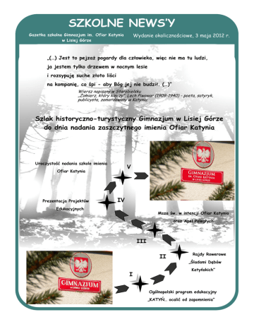 SZKOLNE NEWS’Y Gazetka szkolna Gimnazjum im. Ofiar Katynia w Lisiej Górze Wydanie okolicznościowe, 3 maja 2012 r. „(…) Jest to pejzaż pogardy dla człowieka, więc nie ma tu ludzi, ja jestem tylko drzewem w nocnym lesie i rozsypuję suche złoto liści na kompanię, co śpi - aby Bóg jej nie budził. (…)” Wiersz napisany w Starobielsku „Żołnierz, który klęczy”, Lech Piwowar (1909-1940) - poeta, satyryk, publicysta, zamordowany w Katyniu. Szlak historyczno-turystyczny Gimnazjum w Lisiej Górze do dnia nadania zaszczytnego imienia Ofiar Katynia Uroczystość nadania szkole imienia V Ofiar Katynia Prezentacja Projektów IV Edukacyjnych Msza św. w intencji Ofiar Katynia oraz Apel Poległych III II I Rajdy Rowerowe „Śladami Dębów Katyńskich” Ogólnopolski program edukacyjny „KATYŃ… ocalić od zapomnienia” Str. 2 SZKOLNE NEWS’Y „KATYŃ… ocalić od zapomnienia” „Człowiek nie może pozwolić, żeby prawda została wydarta pod pozorem niczym nieograniczonej wolności, nie można zgubić w sobie krzyku sumienia, jako głosu Prawdy, która go przerasta, ale która jednocześnie czyni go człowiekiem i stanowi o jego człowieczeństwie.” Jan Paweł II W naszej „dąbrowie katyńskiej” uhonorowani zostali: - por. Jan Stanisław Herduś - asp. PP Józef Jachym - asp. PP Tadeusz Jaworski - asp. PP Józef Kapustka - mjr Józef Karcz - asp. PP Emanuel Lip - mjr Józef Łatwajtys - asp. PP Szymon Jan Mikusz - asp. PP Ludwik Szatko - asp. PP Wojciech Wałaszek - por. Zygmunt Wiśniowski - asp. PP Franciszek Maksymilian Wróblewski - wszystkie ofiary tragedii Smoleńskiej z 10 kwietnia 2010 r. Na wiosnę 2009 roku, z inicjatywy P. dyrektor mgr Moniki Krzysztoforskiej, Gimnazjum w Lisiej Górze zgłosiło swój udział w ogólnopolskim programie edukacyjnym „KATYŃ… ocalić od zapomnienia”, zorganizowanym przez Stowarzyszenie PARAFIADA im. św. Józefa Kalasancjusza. Osobą prowadzącą ten projekt w szkole został P. mgr Hubert Żak, który razem z uczniami poszczególnych klas zdobywał informacje na temat 12-tu poległych bohaterów z tzw. „listy katyńskiej”, przydzielonych nam przez organizatora programu. Na podstawie materiałów, które udało się zdobyć podczas realizacji tego projektu sporządzono okolicznościowe plakaty, przedstawiające zebrane informacje oraz zarchiwizowano zdobyte dane w postaci elektronicznej, w celu zamieszczenia ich na portalu: katyn-pamietam.pl. Stowarzyszenie PARAFIADA, wydało Gimnazjum w Lisiej Górze 12 certyfikatów, upoważniających do zasadzenia „dębów pamięci” oraz umieszczenia przy nich pamiątkowych tablic. Analizując życiorysy 12-tu poległych, opiekunowie projektu uznali, że najlepszym miejscem na posadzenie 6-ciu „dębów pamięci” będzie teren gimnazjum, natomiast pozostałe 6 dębów znajdzie swoje miejsce na terenach przyszkolnych lub w sąsiedztwie kościołów w miejscowościach, z których wywodzili się pomordowani żołnierze, tj. w Łęgu Tarnowskim, Łukowej, Nowych Żukowicach, Pawęzowie, Starych Żukowicach oraz Śmignie. Tragedia, która miała miejsce 10 kwietnia 2010 r. pod Smoleńskiem, skłoniła dyrekcję Gimnazjum w Lisiej Górze do podjęcia inicjatywy posadzenia jeszcze jednego, 13-tego „dębu pamięci”, by uczcić pamięć wszystkich ofiar katastrofy samolotu polskiej delegacji prezydenckiej udającej się na uroczystości katyńskie. Zakończenie gimnazjalnego projektu „KATYŃ… ocalić od zapomnienia” odbyło się 7 maja 2010 r. W tym dniu o godzinie 12.00 miały miejsce uroczystości związane z posadzeniem „dębów pamięci’, w których uczestniczyło wielu znakomitych gości m. in. Wójt Gminy Lisia Góra P. inż. Stanisław Wolak i P. wizytator Władysława Śledź, zaproszeni księża oraz dyrektorzy szkół i instytucji, Rodzina P. Zofii Więckowskiej (córki ŚP asp. PP Wojciecha Wałaszka), przedstawiciele Straży Pożarnej, Rodzice i uczniowie różnych szkół. GAZETKA SZKOLNA GIMNAZJUM IM. OFIAR KATYNIA W LISIEJ GÓRZE Str. 3 Rajdy Rowerowe „Śladami Dębów Katyńskich” Tematyka zbrodni katyńskiej towarzyszy społeczności naszej szkoły już od kilku lat. Nie jest to łatwe, zwłaszcza gdy porusza się ten temat z ludźmi bardzo młodymi. Nauczyciele Gimnazjum im. Ofiar Katynia w Lisiej Górze, pragną zaszczepić w młodzieży pamięć o Bohaterach Katynia, nie mówiąc im tylko i wyłącznie o cierpieniu i bólu. Wychodząc naprzeciw oczekiwaniom młodego pokolenia pragną, aby kult Katynia, stał się dla nich czymś naturalnym i kojarzył im się również z nowatorskimi inicjatywami. Taką inicjatywą jest organizowany przez nauczycieli: P. mgr Janusza Rosoła i P. Leszka Ziółkowskiego, Rajd Rowerowy „Śladami Dębów Katyńskich”. Myślą przewodnią tego rajdu jest oddanie hołdu Bohaterom, których „dęby pamięci” zasadziliśmy realizując program „KATYŃ… ocalić od zapomnienia”. Uczestnicy przemierzając całą trasę ok. 40 km odwiedzając wszystkie miejsca gdzie zasadzone zostały nasze dęby i zapalają znicze, będące symbolem naszej pamięci. 27 października 2010 r. odbył się I Rajd Rowerowy „Śladami Dębów Katyńskich”, podczas którego grupa 12 osób przemierzyła trasę: Lisia Góra - Stare Żukowice - Nowe Żukowice - Pawęzów - Łukowa - Śmigno - Lisia Góra. Pomysł ten bardzo spodobał się młodzieży naszej szkoły, czego dowodem była liczba 32 uczestników II Rajdu Rowerowego 7 października 2011 r. Tym razem zaplanowana trasa została wydłużona o jeszcze jedną zaprzyjaźnioną miejscowość, w której również zasadzono nasz „dąb pamięci” - Łęg Tarnowski. Uczniowie pełni zapału z niecierpliwością czekają już na kolejny, III Rajd Rowerowy „Śladami Dębów Katyńskich”, do udziału w którym planujemy zaprosić uczniów zaprzyjaźnionych szkół. Wychodząc naprzeciw oczekiwaniom młodego pokolenia pragną, aby kult Katynia, stał się dla nich czym
