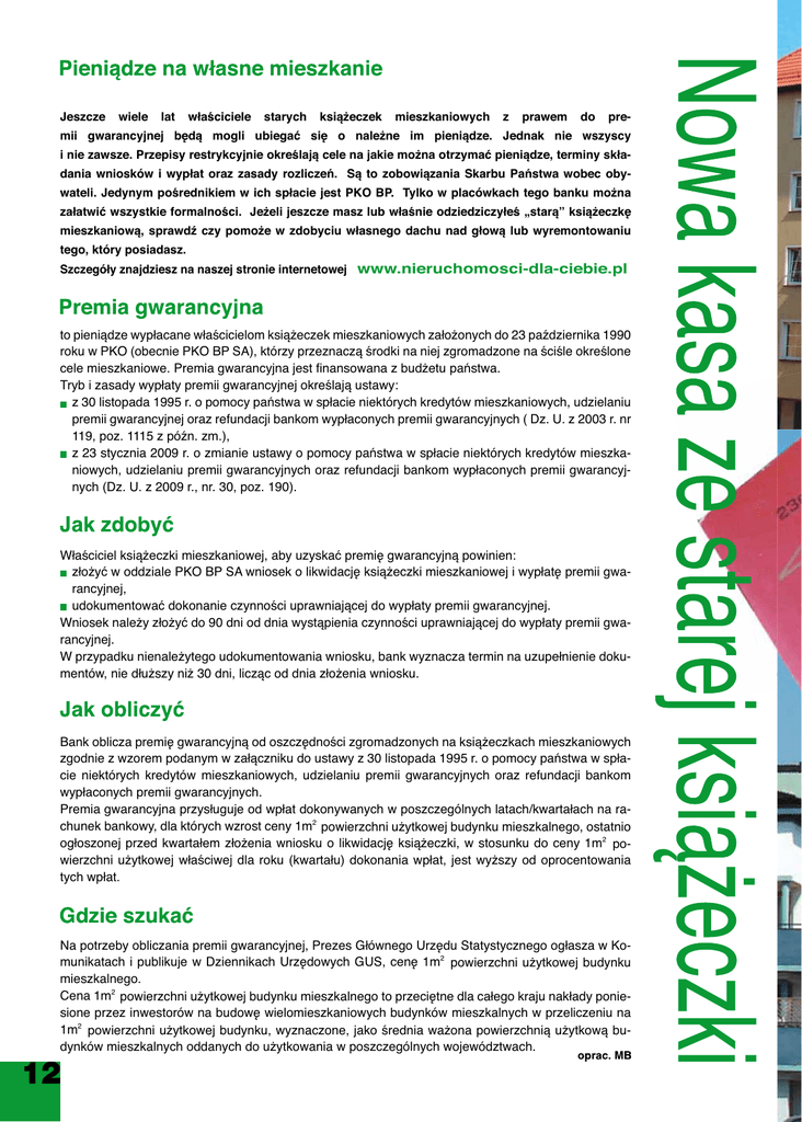 Jeszcze wiele lat właściciele starych książeczek mieszkaniowych z prawem do pre- mii gwarancyjnej będą mogli ubiegać się o należne im pieniądze. Jednak nie wszyscy i nie zawsze. Przepisy restrykcyjnie określają cele na jakie można otrzymać pieniądze, terminy składania wniosków i wypłat oraz zasady rozliczeń. Są to zobowiązania Skarbu Państwa wobec obywateli. Jedynym pośrednikiem w ich spłacie jest PKO BP. Tylko w placówkach tego banku można załatwić wszystkie formalności. Jeżeli jeszcze masz lub właśnie odziedziczyłeś „starą” książeczkę mieszkaniową, sprawdź czy pomoże w zdobyciu własnego dachu nad głową lub wyremontowaniu tego, który posiadasz. Szczegóły znajdziesz na naszej stronie internetowej www.nieruchomosci-dla-ciebie.pl to pieniądze wypłacane właścicielom książeczek mieszkaniowych założonych do 23 października 1990 roku w PKO (obecnie PKO BP SA), którzy przeznaczą środki na niej zgromadzone na ściśle określone cele mieszkaniowe. Premia gwarancyjna jest finansowana z budżetu państwa. Tryb i zasady wypłaty premii gwarancyjnej określają ustawy: z 30 listopada 1995 r. o pomocy państwa w spłacie niektórych kredytów mieszkaniowych, udzielaniu premii gwarancyjnej oraz refundacji bankom wypłaconych premii gwarancyjnych ( Dz. U. z 2003 r. nr 119, poz. 1115 z późn. zm.), z 23 stycznia 2009 r. o zmianie ustawy o pomocy państwa w spłacie niektórych kredytów mieszkaniowych, udzielaniu premii gwarancyjnych oraz refundacji bankom wypłaconych premii gwarancyjnych (Dz. U. z 2009 r., nr. 30, poz. 190). Właściciel książeczki mieszkaniowej, aby uzyskać premię gwarancyjną powinien: złożyć w oddziale PKO BP SA wniosek o likwidację książeczki mieszkaniowej i wypłatę premii gwarancyjnej, udokumentować dokonanie czynności uprawniającej do wypłaty premii gwarancyjnej. Wniosek należy złożyć do 90 dni od dnia wystąpienia czynności uprawniającej do wypłaty premii gwarancyjnej. W przypadku nienależytego udokumentowania wniosku, bank wyznacza termin na uzupełnienie dokumentów, nie dłuższy niż 30 dni, licząc od dnia złożenia wniosku. Bank oblicza premię gwarancyjną od oszczędności zgromadzonych na książeczkach mieszkaniowych zgodnie z wzorem podanym w załączniku do ustawy z 30 listopada 1995 r. o pomocy państwa w spłacie niektórych kredytów mieszkaniowych, udzielaniu premii gwarancyjnych oraz refundacji bankom wypłaconych premii gwarancyjnych. Premia gwarancyjna przysługuje od wpłat dokonywanych w poszczególnych latach/kwartałach na rachunek bankowy, dla których wzrost ceny 1m2 powierzchni użytkowej budynku mieszkalnego, ostatnio ogłoszonej przed kwartałem złożenia wniosku o likwidację książeczki, w stosunku do ceny 1m2 powierzchni użytkowej właściwej dla roku (kwartału) dokonania wpłat, jest wyższy od oprocentowania tych wpłat. Na potrzeby obliczania premii gwarancyjnej, Prezes Głównego Urzędu Statystycznego ogłasza w Komunikatach i publikuje w Dziennikach Urzędowych GUS, cenę 1m2 powierzchni użytkowej budynku mieszkalnego. Cena 1m2 powierzchni użytkowej budynku mieszkalnego to przeciętne dla całego kraju nakłady poniesione przez inwestorów na budowę wielomieszkaniowych budynków mieszkalnych w przeliczeniu na 1m2 powierzchni użytkowej budynku, wyznaczone, jako średnia ważona powierzchnią użytkową budynków mieszkalnych oddanych do użytkowania w poszczególnych województwach. Od 1 stycznia 2011 roku o premię gwarancyjną mogą się ubiegać osoby, które w PKO założyły książeczkę mieszkaniową w latach 1973 - 1975 i już wydały pieniądze na remont własnego mieszkania. Premia gwarancyjna przysługuje w przypadku: wymiany okien, instalacji gazowej, instalacji elektrycznej (wszystkie wydatki muszą być udokumentowane fakturami wystawionymi na właściciela książeczki lub współmałżonka, którzy muszą być również właścicielami remontowanej nieruchomości), wpłaty na fundusz remontowy wspólnoty mieszkaniowej lub spółdzielni mieszkaniowej kwoty należnej za okres 12 miesięcy poprzedzających miesiąc złożenia wniosku o likwidację książeczki (kwota wydatków wspólnoty mieszkaniowej lub spółdzielni mieszkaniowej poniesionych w okresie 24 miesięcy poprzedzających miesiąc złożenia wniosku o likwidację książeczki - na remont części wspólnych budynku – w części odpowiadającej udziałowi właściciela książeczki w kosztach remontów nieruchomości wspólnej, jest co najmniej równa tej wpłacie). O d 1 stycznia do 31 grudnia 2011 roku o premię gwarancyjną mogą się ubiegać osoby, które w PKO założyły książeczkę mieszkaniową w latach 1973 - 1975 i przed 1 kwietnia 2009 roku całkowicie spłaciły zadłużenie obciążające lokal, którego są właścicielami. Dotyczy to wyłącznie kredytów mieszkaniowych udzielonych i spłacanych na warunkach określonych przez Radę Ministrów (art. 1 ust. 2 ustawy z 30.11.1995 o pomocy państwa w spłacie niektórych kredytów mieszkaniowych, udzielaniu premii gwarancyjnej oraz refundacji bankom udzielanych premii gwarancyjnych). Ważne Książeczka mieszkaniowa podlega dziedziczeniu, chyba że został w książeczce uczyniony zapis na wypadek śmierci. Premia gwarancyjna przysługuje jedynie od wkładów oszczędnościowych zgromadzanych na rachunku bankowym, na które została wystawiona książeczka mieszkaniowa przed 23 października 1990 r. Z jednej książeczki mieszkaniowej może być wypłacona tylko jedna premia gwarancyjna, ale jeżeli zamierzasz kupić mieszkanie, możesz uzyskać premię gwarancyjną z więcej niż jednej książeczki na jej zakup, np. likwidując książeczkę swoją, rodziców i rodzeństwa. Premia przysługuje zarówno na zakup gotowego mieszkania, jak i na jego budowę – z deweloperem, spółdzielnią lub prywatnie. Kupując mieszkanie na współwłasność w częściach ułamkowych albo odkupując od kogoś udział t
