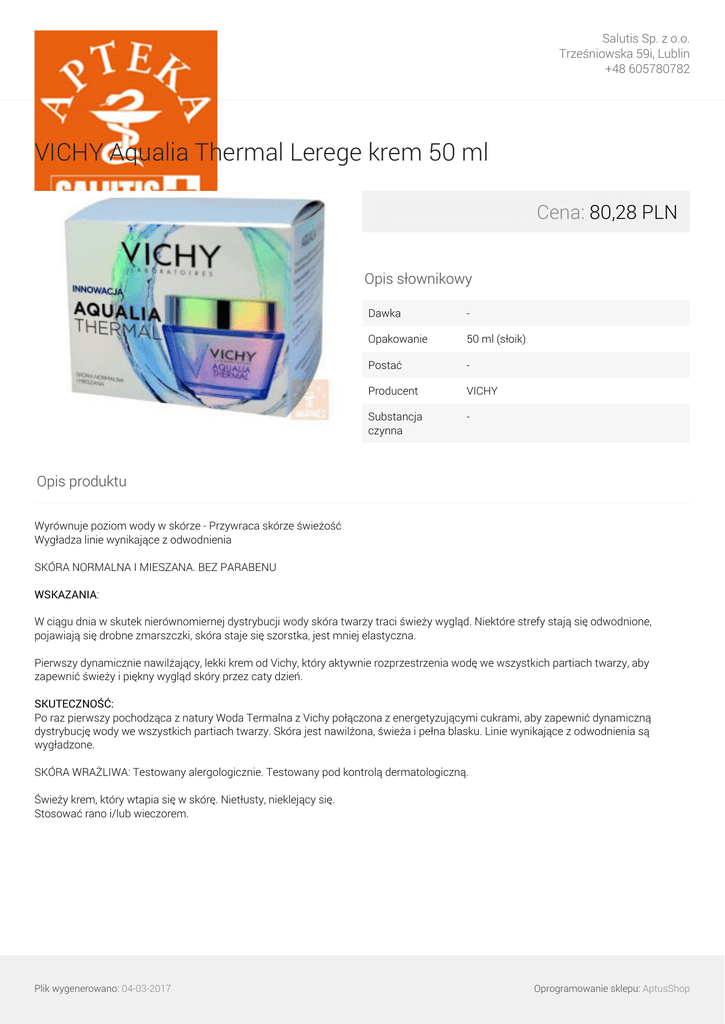 Salutis Sp. z o.o. Trześniowska 59i, Lublin +48 605780782 VICHY Aqualia Thermal Lerege krem 50 ml Cena: 80,28 PLN Opis słownikowy Dawka - Opakowanie 50 ml (słoik) Postać - Producent VICHY Substancja czynna - Opis produktu Wyrównuje poziom wody w skórze - Przywraca skórze świeżość Wygładza linie wynikające z odwodnienia SKÓRA NORMALNA I MIESZANA. BEZ PARABENU WSKAZANIA: W ciągu dnia w skutek nierównomiernej dystrybucji wody skóra twarzy traci świeży wygląd. Niektóre strefy stają się odwodnione, pojawiają się drobne zmarszczki, skóra staje się szorstka, jest mniej elastyczna. Pierwszy dynamicznie nawilżający, lekki krem od Vichy, który aktywnie rozprzestrzenia wodę we wszystkich partiach twarzy, aby zapewnić świeży i piękny wygląd skóry przez caty dzień. SKUTECZNOŚĆ: Po raz pierwszy pochodząca z natury Woda Termalna z Vichy połączona z energetyzującymi cukrami, aby zapewnić dynamiczną dystrybucję wody we wszystkich partiach twarzy. Skóra jest nawilżona, świeża i pełna blasku. Linie wynikające z odwodnienia są wygładzone. SKÓRA WRAŻLIWA: Testowany alergologicznie. Testowany pod kontrolą dermatologiczną. Świeży krem, który wtapia się w skórę. Nietłusty, nieklejący się. Stosować rano i/lub wieczorem. Plik wygenerowano: 04-03-2017 Powered by TCPDF (www.tcpdf.org) Oprogramowanie sklepu: AptusShop