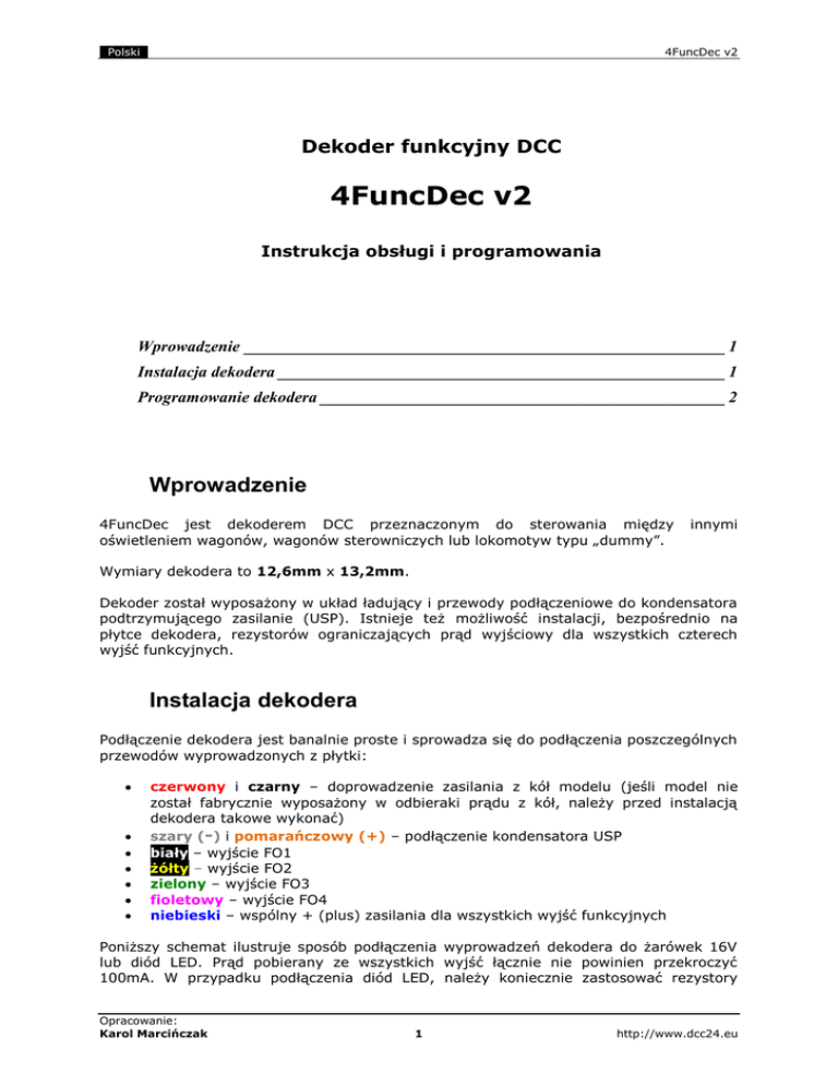 . Polski . 4FuncDec v2 Dekoder funkcyjny DCC 4FuncDec v2 Instrukcja obsługi i programowania Wprowadzenie _________________________________________________________ 1 Instalacja dekodera _____________________________________________________ 1 Programowanie dekodera ________________________________________________ 2 Wprowadzenie 4FuncDec jest dekoderem DCC przeznaczonym do sterowania między oświetleniem wagonów, wagonów sterowniczych lub lokomotyw typu „dummy”. innymi Wymiary dekodera to 12,6mm x 13,2mm. Dekoder został wyposażony w układ ładujący i przewody podłączeniowe do kondensatora podtrzymującego zasilanie (USP). Istnieje też możliwość instalacji, bezpośrednio na płytce dekodera, rezystorów ograniczających prąd wyjściowy dla wszystkich czterech wyjść funkcyjnych. Instalacja dekodera Podłączenie dekodera jest banalnie proste i sprowadza się do podłączenia poszczególnych przewodów wyprowadzonych z płytki: czerwony i czarny – doprowadzenie zasilania z kół modelu (jeśli model nie został fabrycznie wyposażony w odbieraki prądu z kół, należy przed instalacją dekodera takowe wykonać) szary (-) i pomarańczowy (+) – podłączenie kondensatora USP biały – wyjście FO1 żółty – wyjście FO2 zielony – wyjście FO3 fioletowy – wyjście FO4 niebieski – wspólny + (plus) zasilania dla wszystkich wyjść funkcyjnych Poniższy schemat ilustruje sposób podłączenia wyprowadzeń dekodera do żarówek 16V lub diód LED. Prąd pobierany ze wszystkich wyjść łącznie nie powinien przekroczyć 100mA. W przypadku podłączenia diód LED, należy koniecznie zastosować rezystory Opracowanie: Karol Marcińczak 1 http://www.dcc24.eu . Polski . 4FuncDec v2 ograniczające prąd. Wartość rezystora najlepiej dobrać eksperymentalnie do zastosowanego typu diody. W przypadku podłączenia więcej niż jednej diody do wyjścia, należy łączyć diody szeregowo. Żarówki 16V / 100mA max 1,5k2,2k 1,5k2,2k FO2 FO1 1,5k2,2k 1,5k2,2k FO4 FO3 żółty biały niebieski fioletowy szary (-) brązowy (+) czerwony czarny zielony Programowanie dekodera Poniżej opisano zasady programowania poszczególnych parametrów dekodera: a) Adres dekodera (krótki lub długi) OPIS Adres krótki, funkcjonuje gdy w CV29 parametr D został ustawiony na wartość „0” Adres długi, funkcjonuje gdy w CV29 parametr D został ustawiony na wartość „32” Opracowanie: Karol Marcińczak 2 CV CV1 CV17 CV18 i ZAKRES Do 127 DOMYŚLNA 3 Od 128 0,0 http://www.dcc24.eu . Polski . 4FuncDec v2 W przypadku adresu długiego musimy dokonać dwóch zmian (CV17 i CV18). CV17 – (nowy adres/256 = A) + 192 = B, z wyniku dzielenia (A) bierzemy tylko liczbę całkowitą. Sumę B należy wpisać do CV17. CV18 – nowy adres – (A * 256) = C, z wyniku poprzedniego dzielenia (A) bierzemy tylko liczbę całkowitą. Wynik C należy w pisać do CV18. Jeżeli wybraliśmy np. adres 1123, to jak wynika z poniższego opisu w CV17 musimy wpisać liczbę 196, a w CV18 wpisać 99. Podczas programowania przy użyciu MiniBox-a odpowiednie zmienne CV zostają ustawione automatycznie dla długich lub krótkich adresów. b) adres przy jeździe wielokrotnej (zespół pojazdów) OPIS Wpisujemy adres z zakresu adresów krótkich. Dotychczasowy adres zostaje uśpiony. CV CV19 ZAKRES Do 127 DOMYŚLNA 0 c) podstawowa konfiguracja dekodera CV29 A Kierunek jazdy normalny = 0 B 14 kroków prędkości = 0 C Tylko DCC = 0 D Adres krótki = 0 Lub Lub Lub Lub Kierunek jazdy odwrotny = 1 28/128 kroków prędkości = 2 Analog i DCC = 4 Adres długi = 32 Domyślnie wartość zaprogramowana w CV29 = 2. Przy zmianie konfiguracji dekodera do CV29 zapisujemy sumę wybranych wartości. d) funkcje F1-F8 aktywne w trybie analogowym CV13 F1 1 F2 2 F3 4 F4 8 F5 16 F6 32 F7 64 F8 128 Domyślnie 0 Do zmiennej CV13 należy wpisać wartość będącą sumą wartości przypisanych do poszczególnych funkcji, które mają być aktywne w trybie analogowym e) funkcje FL,FR oraz F9-F12 aktywne w trybie analogowym CV14 FL 1 FR 2 F9 4 F10 8 F11 16 F12 32 Domyślnie 3 Do zmiennej CV14 należy wpisać wartość będącą sumą wartości przypisanych do poszczególnych funkcji, które mają być aktywne w trybie analogowym Opracowanie: Karol Marcińczak 3 http://www.dcc24.eu . Polski . 4FuncDec v2 f) efekty specjalne na poszczególnych wyjściach dekodera Wyjście funkcyjne CV Konfiguracja efektów specjalnych Domyślnie FO1 CV33 0 FO2 FO3 FO4 CV34 CV35 CV36 0: zwykłe żarówki 1: świetlówka 2: uszkodzona świetlówka 3: uszkodzona świetlówka (końcowa faza) 4: Flash A 5: Flash A (druga faza) 6: Flash B 7: Flash B (druga faza) patrz powyżej… patrz powyżej… patrz powyżej… Wyjście funkcyjne CV Ustawienie przyciemnienia dla poszczególnych wyjść dekodera Domyślnie FO1 CV37 FO2 FO3 FO4 CV38 CV39 CV40 przyciemnienie określon w skali 1..15, gdzie: 1 - minimalna jasność, 15 - maksymalna jasność świecenia patrz powyżej… patrz powyżej… patrz powyżej… Efekt CV Inne ustawienia efektów specjalnych Flash A CV50 Flash A CV51 Flash B CV52 Flash B CV53 Czas załączenia w skali 0..255 jako wielokrotność 8ms Czas wygaszenia w skali 0..255 jako wielokrotność 8ms Czas załączenia w skali 0..255 jako wielokrotność 8ms Czas wygaszenia w skali 0..255 jako wielokrotność 8ms 0 0 0 15 15 15 15 Domyślnie 12 12 12 12 g) przypisanie wyjść do funkcji Klawisz funkcji F0 F0 F1 F1 F2 F2 F3 F3 F4 F4 F5 F5 F6 F6 F7 – – – – – – – – – – – – – – – jazda jazda jazda jazda jazda jazda jazda jazda jazda jazda jazda jazda jazda jazda jazda Opracowanie: Karol Marcińczak do do do do do do do do do do do do do do do CV przodu (FL) tyłu (FR) przodu tyłu przodu tyłu przodu tyłu przodu tyłu przodu tyłu przodu tyłu przodu CV120 CV121 CV122 CV123 CV124 CV125 CV126 CV127 CV128 CV129 CV130 CV131 CV132 CV133 CV134 4 FO1 FO2 FO3 FO4 1 1 1 1 1 1 1 1 1 1 1 1 1 1 1 2 2 2 2 2 2 2 2 2 2 2 2 2 2 2 4 4 4 4 4 4 4 4 4 4