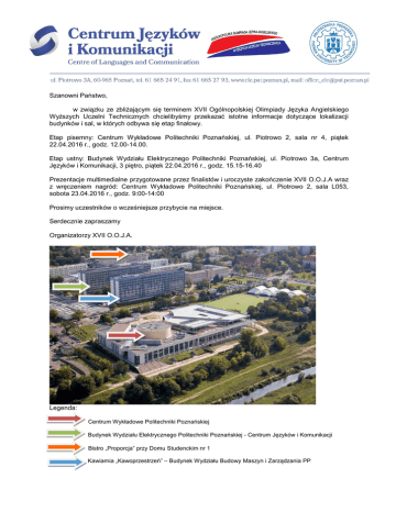 Szanowni Państwo, w związku ze zbliżającym się terminem XVII Ogólnopolskiej Olimpiady Języka Angielskiego Wyższych Uczelni Technicznych chcielibyśmy przekazać istotne informacje dotyczące lokalizacji budynków i sal, w których odbywa się etap finałowy. Etap pisemny: Centrum Wykładowe Politechniki Poznańskiej, ul. Piotrowo 2, sala nr 4, piątek 22.04.2016 r., godz. 12.00-14.00. Etap ustny: Budynek Wydziału Elektrycznego Politechniki Poznańskiej, ul. Piotrowo 3a, Centrum Języków i Komunikacji, 3 piętro, piątek 22.04.2016 r., godz. 15.15-16.40 Prezentacje multimedialne przygotowane przez finalistów i uroczyste zakończenie XVII O.O.J.A wraz z wręczeniem nagród: Centrum Wykładowe Politechniki Poznańskiej, ul. Piotrowo 2, sala L053, sobota 23.04.2016 r., godz. 9:00-14:00 Prosimy uczestników o wcześniejsze przybycie na miejsce. Serdecznie zapraszamy Organizatorzy XVII O.O.J.A. Legenda: Centrum Wykładowe Politechniki Poznańskiej Budynek Wydziału Elektrycznego Politechniki Poznańskiej - Centrum Języków i Komunikacji Bistro „Proporcja” przy Domu Studenckim nr 1 Kawiarnia „Kawoprzestrzeń” – Budynek Wydziału Budowy Maszyn i Zarządzania PP