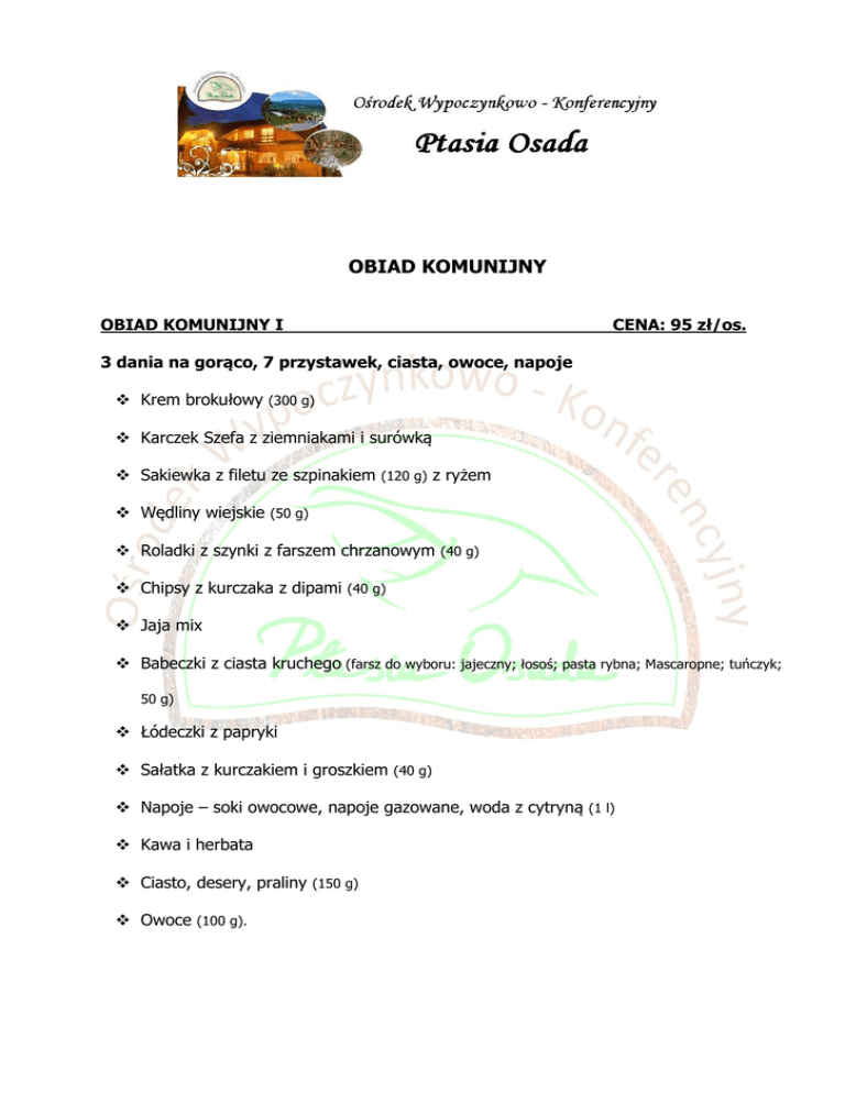 OBIAD KOMUNIJNY OBIAD KOMUNIJNY I CENA: 95 zł/os. 3 dania na gorąco, 7 przystawek, ciasta, owoce, napoje Krem brokułowy (300 g) Karczek Szefa z ziemniakami i surówką Sakiewka z filetu ze szpinakiem (120 g) z ryżem Wędliny wiejskie (50 g) Roladki z szynki z farszem chrzanowym (40 g) Chipsy z kurczaka z dipami (40 g) Jaja mix Babeczki z ciasta kruchego (farsz do wyboru: jajeczny; łosoś; pasta rybna; Mascaropne; tuńczyk; 50 g) Łódeczki z papryki Sałatka z kurczakiem i groszkiem (40 g) Napoje – soki owocowe, napoje gazowane, woda z cytryną (1 l) Kawa i herbata Ciasto, desery, praliny (150 g) Owoce (100 g). OBIAD KOMUNIJNY II CENA: 95 zł/os. 3 dania na gorąco, 7 przystawek, ciasta, owoce, napoje Rosół z makaronem (300 g) Filet w śmietanie z ryżem i warzywami z wody Żeberka w miodzie z kopytkami Wędliny wiejskie (50 g) Schab po warszawsku (40 g) Tortilla z szynką z dipami (40 g) Tymbaliki drobiowe Jaja mix Pomidor nadziewany Sałatka grecka z fetą (40 g) Napoje – soki owocowe, napoje gazowane, woda z cytryną (1 l) Kawa i herbata Ciasto, desery, praliny (150 g) Owoce (100 g). OBIAD KOMUNIJNY III CENA: 95 zł/os. 3 dania na gorąco, 7 przystawek, ciasta, owoce, napoje Krem pomidorowy (300 g) Zrazy wołowe z ziemniakami i surówką Udka faszerowane z warzywami z wody Wędliny wiejskie (50 g) Deska serów (20 g) Kaczka faszerowana (40 g) Tortilla z łososiem z dipami (40 g) Jaja mix Pieczarki faszerowane Sałatka brokułowa (40 g) Napoje – soki owocowe, napoje gazowane, woda z cytryną (1 l) Kawa i herbata Ciasto, desery, praliny (150 g) Owoce (100 g). ATRAKCJE DLA DZIECI: - KĄCIK DZIECIĘCY - PIASKOWNICA, ZJEŻDŻALNIA - BOISKO DO GRY W PIŁKĘ PLAŻOWĄ, BADMINTON - ANIMACJE (powyżej 40 osób gratis) Ośrodek Wypoczynkowo – Konferencyjny Ptasia Osada 17-100 Ploski, gm. Bielsk Podlaski, Tel. 85 731 73 99 Kom. 691 112 393, 691 112 391 E-mail: [email protected] Strona : www.ptasiaosada.pl