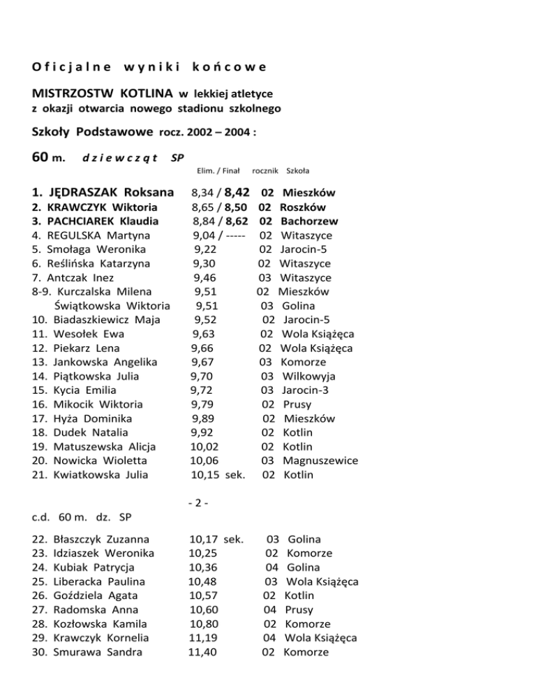 Oficjalne wyniki końcowe MISTRZOSTW KOTLINA w lekkiej atletyce z okazji otwarcia nowego stadionu szkolnego Szkoły Podstawowe rocz. 2002 – 2004 : 60 m. dziewcząt SP Elim. / Finał 1. JĘDRASZAK Roksana 2. KRAWCZYK Wiktoria 3. PACHCIAREK Klaudia 4. REGULSKA Martyna 5. Smołaga Weronika 6. Reślińska Katarzyna 7. Antczak Inez 8-9. Kurczalska Milena Świątkowska Wiktoria 10. Biadaszkiewicz Maja 11. Wesołek Ewa 12. Piekarz Lena 13. Jankowska Angelika 14. Piątkowska Julia 15. Kycia Emilia 16. Mikocik Wiktoria 17. Hyża Dominika 18. Dudek Natalia 19. Matuszewska Alicja 20. Nowicka Wioletta 21. Kwiatkowska Julia 8,34 / 8,42 8,65 / 8,50 8,84 / 8,62 9,04 / ----9,22 9,30 9,46 9,51 9,51 9,52 9,63 9,66 9,67 9,70 9,72 9,79 9,89 9,92 10,02 10,06 10,15 sek. rocznik Szkoła 02 Mieszków 02 Roszków 02 Bachorzew 02 Witaszyce 02 Jarocin-5 02 Witaszyce 03 Witaszyce 02 Mieszków 03 Golina 02 Jarocin-5 02 Wola Książęca 02 Wola Książęca 03 Komorze 03 Wilkowyja 03 Jarocin-3 02 Prusy 02 Mieszków 02 Kotlin 02 Kotlin 03 Magnuszewice 02 Kotlin -2c.d. 60 m. dz. SP 22. 23. 24. 25. 26. 27. 28. 29. 30. Błaszczyk Zuzanna Idziaszek Weronika Kubiak Patrycja Liberacka Paulina Goździela Agata Radomska Anna Kozłowska Kamila Krawczyk Kornelia Smurawa Sandra 10,17 sek. 10,25 10,36 10,48 10,57 10,60 10,80 11,19 11,40 03 02 04 03 02 04 02 04 02 Golina Komorze Golina Wola Książęca Kotlin Prusy Komorze Wola Książęca Komorze 31. Walerowicz Patrycja 60 m. chłopców 12,33 sek. 04 Magnuszewice SP Czas: Elim. / Finał 1. STACHOWIAK Jakub 8,68 / 8,51 2. JUSZCZAK Szymon 8,70 / 8,54 3. PADROK Krzysztof 8,88 / 8,59 4. JANUSZEWSKI Patryk 8,82 / 8,70 5. Alankiewicz Mateusz 8,90 6. Nagorzycki Kordian 8,93 7. Matuszewski Piotr 8,94 8. Roguszczak Norbert 9,02 9. Paterczyk Dominik 9,03 10. Studziński Dawid 9,09 11. Wiśniewski Przemysław 9,10 12. Szymkowiak Radosław 9,18 sek. rocz. Szkoła: 02 03 02 02 02 02 02 02 02 02 02 02 Mieszków Komorze Bachorzew Jarocin-5 Wola Książęca Jarocin-5 Kotlin Wola Książęca Jarocin-5 Mieszków Jarocin-3 Wola Książęca -3c.d. 60 m. chł. SP 13. 14. 15. 16. 17. 18. 19. 20. 21. 22. 23. 24. 25. 26. 27. 28. 29. 30. Pieniawski Patryk Urbaniak Marcin Patoka Miłosz Andrzejczak Mikołaj Matuszak Mateusz Szmytka Alan Jędraszak Emil Poczta Arkadiusz Gozdowiak Igor Sopniewski Denis Kaczmarek Szymon Mądrakiewicz Marcin Staniewski Paweł Grajek Tomasz Niemier Łukasz Bogaczyk Szymon Rydian Daniel Wawszków Jakub 9,25 sek. 9,42 9,54 9,59 9,61 9,62 9,64 9,82 9,84 9,89 9,93 10,08 10,13 10,21 10,34 10,44 10,99 11,43 sek. 02 Komorze 03 Jarocin-3 02 Golina 03 Prusy 03 Golina 02 Kotlin 04 Mieszków 03 Magnuszewice 03 Witaszyce 02 Prusy 03 Kotlin 03 Magnuszewice 03 Magnuszewice 03 Wilkowyja 03 Komorze 03 Wilkowyja 04 Magnuszewice 04 Prusy 200 m. dziewcząt SP Czas rocz. Szkoła: 1. IGNASIAK Marta 31,51 sek. 2. 3. 4. 5. 31,84 33,26 34,58 34,84 -4- REGUS Klaudia PLUTA Daria Biskupska Martyna Szymanowska Anna 02 02 03 02 03 Witaszyce Jarocin-5 Golina Wilkowyja Witaszyce c.d. 200 m. dz. SP 6. Król Angelika 7. Naskręt Weronika 8. Siejak Oliwia 9. Chrobot Zuzanna 10. Zdrojowa Zuzanna Kujawa Martyna Strugała Eliza Szymczak Anna 200 m. 35,83 sek. 36,24 36,54 38,28 38,96 sek. 04 Golina 03 Golina 03 Jarocin-3 04 Prusy 04 Jarocin-3 02 Jarocin-5 02 Jarocin-5 03 Magnuszewice SP chłopców czas: rocz. 1. BANASZAK Tomasz 26,64 sek. 2. STACHOWIAK Jakub 3. DRAŃCZAREK Kacper 4. Wawrzyniak Gabriel 5. Like Piotr 6. Biernacki Igor 7. Nagorzycki Martyn 8. Lamprecht Wojciech 9. Kaczmarek Szymon 10. Grobelny Bartosz 11. Kierzkowski Kamil Jacoszek Korneliusz Niemier Łukasz Kantek Krzysztof Kwieciński Marcel 29,23 30,22 30,81 31,22 32,07 32,68 33,27 34,93 35,65 36,00 Szkoła: 02 Jarocin-5 02 Mieszków 02 Jarocin-5 02 Witaszyce 04 Mieszków 04 Witaszyce 03 Jarocin-5 04 Witaszyce 03 Kotlin 02 Prusy 03 Kotlin 02 Komorze 03 Komorze 03 Kotlin 02 Wilkowyja -5- 400 m. dziewcząt SP Czas: rocz. Szkoła: 1. MRÓWCZYŃSKA Marlena 1:07,03 sek. 2. PAWEŁCZYK Julia 1:15,66 3. STRZELECKA Aleksandra 1:15,85 4. Kurczalska Milena 1:16,08 5. Ciszak Dominika 1:18,99 6. Piekarz Lena 1:21,34 7. Wesołek Ewa 1:22,30 8. Jelak Kulia 1:22,87 9. Handke Julia 1:43,96 sek. Grzeluszka Martyna Regus Klaudia Hojak Marta Kujawa Martyna Cieślak Maja Krawczyk Kornelia 800 m. chłopców 02 Jarocin-3 02 Mieszków 04 Wilkowyja 02 Mieszków 02 Golina 02 Wola Książęca 02 Wola Książęca 04 Golina 04 Jarocin-3 03 Witaszyce 02 Jarocin-5 02 Jarocin-5 02 Jarocin-5 04 Jarocin-3 04 Wola Książęca SP Czas: rocz. Szkoła: 1. ORZŁOWSKI Jakub 2:31,56 sek. 02 Jarocin-5 2. 3. 4. 5. 6. 7. 2:38,70 2:39,89 2:40,38 2:41,85 2:44,88 2:45,07 -6- 03 04 02 02 03 02 Witaszyce Witaszyce Witaszyce Mieszków Witaszyce Jarocin-5 2:48,86 sek. 2:48,90 2:55,23 2:59,24 3:03,41 3:04,88 3:05,75 3:08,30 3:31,14 02 02 03 03 02 02 04 02 03 Wola Książęca Jarocin-5 Jarocin-3 Kotlin Wola Książęca Golina Wilkowyja Kotlin Kotlin JANKOWIAK Kacper WALCZAK Adam Politowicz Maks Stempiński Eryk Leczykiewicz Michał Nagorzycki Kordian c.d. 800 m. chł. SP 8. Skowron Dawid 9. Królikowski Jakub 10. Szymczak Szymon 11. Błaszczyk Artur 12. Borowczyk Przemysław 13. Staniewski Maksymilian 14. Golec Bartek 15. Sroczyński Adam 16. Kantek Krzysztof Skok w dal dziewcząt SP Wynik: 1.JĘDRASZAK Roksana 2. PACHCIAREK Klaudia 3. HYŻA Dominika 4. Ignasiak Marta 5. Regus Klaudia 6. Regulska Martyna 7. Światkowska Wiktoria 8. Mikocik Wiktoria 9. Smołaga Weronika 10. Kujawa Martyna 11. Jankowska Angelika 12. Piątkowska Julia 13. Błaszczyk Zuzanna 14. Pluta Daria rocz. Szkoła: 4.90 m. 4.50 4.40 4.17 4.00 3.90 3.85 3.75 3.70 3.65 / 3.64 3.65 / 3.62 3.65 / 3,60 3.62 3.54 -7- 02 Mieszków 02 Bachorzew 02 Mieszków 02 Witaszyce 02 Jarocin-5 02 Witaszyce 03 Golina 02 Prusy 02 Jarocin-5 02 Jarocin-5 03 Komorze 03 Wilkowyja 03 Golina 03 Golina c.d. skok w dal dz. SP 15. 16. 17. 18. 19. 20. 21. 22. 23. 24. 25. Szymanek Julia Zdrojowa Zuzanna Kycia Emilia Chrobot Zuzanna Radomska Anna Kozłowska Kam