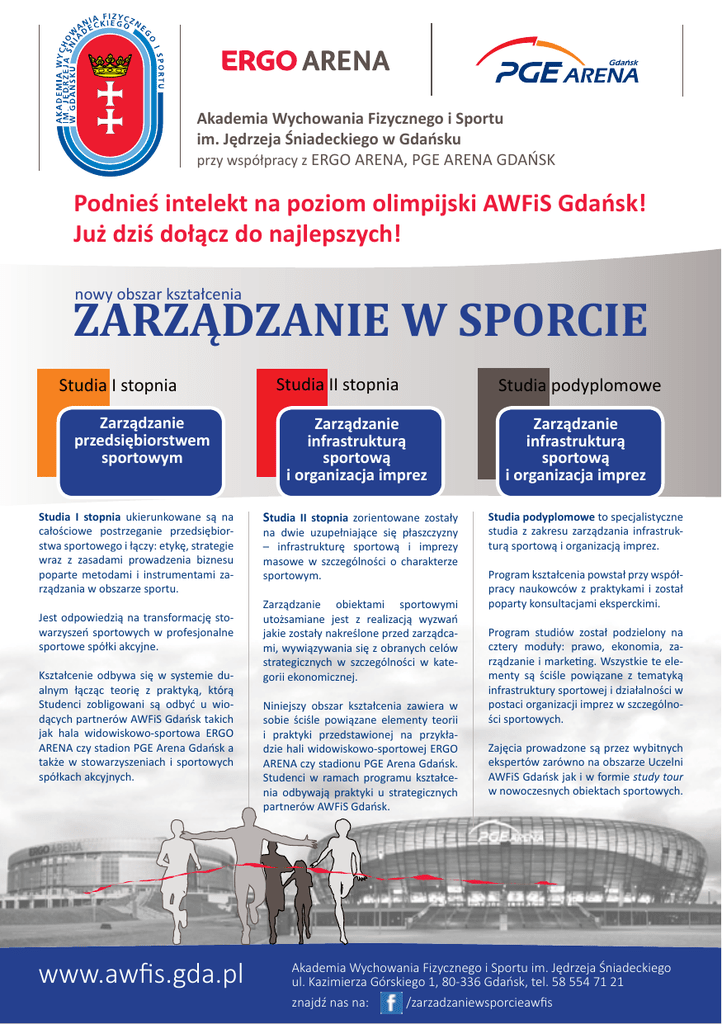 Akademia Wychowania Fizycznego i Sportu im. Jędrzeja Śniadeckiego w Gdańsku przy współpracy z ERGO ARENA, PGE ARENA GDAŃSK Podnieś intelekt na poziom olimpijski AWFiS Gdańsk! Już dziś dołącz do najlepszych! nowy obszar kształcenia ZARZĄDZANIE W SPORCIE Studia I stopnia Zarządzanie przedsiębiorstwem sportowym Studia I stopnia ukierunkowane są na całościowe postrzeganie przedsiębiorstwa sportowego i łączy: etykę, strategie wraz z zasadami prowadzenia biznesu poparte metodami i instrumentami zarządzania w obszarze sportu. Jest odpowiedzią na transformację stowarzyszeń sportowych w profesjonalne sportowe spółki akcyjne. Kształcenie odbywa się w systemie dualnym łącząc teorię z praktyką, którą Studenci zobligowani są odbyć u wiodących partnerów AWFiS Gdańsk takich jak hala widowiskowo-sportowa ERGO ARENA czy stadion PGE Arena Gdańsk a także w stowarzyszeniach i sportowych spółkach akcyjnych. www.awfis.gda.pl Studia II stopnia Zarządzanie infrastrukturą sportową i organizacja imprez Studia II stopnia zorientowane zostały na dwie uzupełniające się płaszczyzny – infrastrukturę sportową i imprezy masowe w szczególności o charakterze sportowym. Zarządzanie obiektami sportowymi utożsamiane jest z realizacją wyzwań jakie zostały nakreślone przed zarządcami, wywiązywania się z obranych celów strategicznych w szczególności w kategorii ekonomicznej. Niniejszy obszar kształcenia zawiera w sobie ściśle powiązane elementy teorii i praktyki przedstawionej na przykładzie hali widowiskowo-sportowej ERGO ARENA czy stadionu PGE Arena Gdańsk. Studenci w ramach programu kształcenia odbywają praktyki u strategicznych partnerów AWFiS Gdańsk. Studia podyplomowe Zarządzanie infrastrukturą sportową i organizacja imprez Studia podyplomowe to specjalistyczne studia z zakresu zarządzania infrastrukturą sportową i organizacją imprez. Program kształcenia powstał przy współpracy naukowców z praktykami i został poparty konsultacjami eksperckimi. Program studiów został podzielony na cztery moduły: prawo, ekonomia, zarządzanie i marketing. Wszystkie te elementy są ściśle powiązane z tematyką infrastruktury sportowej i działalności w postaci organizacji imprez w szczególności sportowych. Zajęcia prowadzone są przez wybitnych ekspertów zarówno na obszarze Uczelni AWFiS Gdańsk jak i w formie study tour w nowoczesnych obiektach sportowych. Akademia Wychowania Fizycznego i Sportu im. Jędrzeja Śniadeckiego ul. Kazimierza Górskiego 1, 80-336 Gdańsk, tel. 58 554 71 21 znajdź nas na: /zarzadzaniewsporcieawfis Gdańsk University of Physical Education and Sport in cooperation with the ERGO ARENA, the PGE ARENA GDAŃSK Elevate your intellect to the Olympic level of Gdańsk University of Physical Education and Sport. Join the best today! A new educational area MANAGEMENT IN SPORT Undergraduate studies Managing a sports enterprise First-cycle studies (undergraduate studies) target a holistic perception of a sports enterprise and combine: ethics and strategies together with the principles of running a business supported by techniques and instruments of business management in the area of sport. Graduate studies Management of sports facilities and organisation of sport events Second-cycle studies (graduate studies) have been directed towards two complementary levels-sport infrastructure and mass events, in particular of a sports nature. It is a response to the transformation of sports associations into professional sports joint-stock companies. Management of sports facilities is identified with meeting the challenges which have been outlined for managers and with fulfilling with strategic objectives, in particular of the financial nature. Education takes place in the dual system combining theory with practice, which Students are required to take with the leading partners of Gdansk AWFiS, such as the sports and show hall ERGO ARENA, the PGE Arena Gdańsk Stadium as well as in sports associations and in sports joint-stock companies. This educational area includes the closely related elements of theory and practice shown on the example of the sports and show hall ERGO ARENA or the PGE Arena Gdańsk Stadium. As part of the curriculum students have professional practice with AWFiS Gdańsk strategic partners. www.awfis.gda.pl Postgraduate studies Management of sports facilities and organisation of sport events Postgraduate studies are specialist courses in the field of Management of sports facilities and organisation of sport events. The curriculum has been developed in collaboration of scholars and practitioners and has been supported by expert consultations. The curriculum has been divided into four modules: law, economics, management and marketing. All these elements are closely related to the theme of the sports infrastructure and activity of organizing events, especially sports events. Classes are conducted by eminent experts both within the University and in the form of study tours in modern sports facilities. Gdańsk University of Physical Education and Sport (Akademia Wychowania Fizycznego i Sportu im. Jędrzeja Śniadeckiego) ul. Kazimierza Górskiego 1, 80-336 Gdańsk, tel. 58 554 71 21 Find us on: /zarzadzaniewsporcieawfis