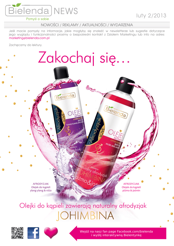 NEWS luty 2/2013 NOWOŚCI / REKLAMY / AKTUALNOŚCI / WYDARZENIA Jeśli macie pomysły na informacje, jakie mogłyby się znaleźć w newsletterze lub sugestie dotyczące jego wyglądu i funkcjonalności prosimy o bezpośredni kontakt z Działem Marketingu lub info na adres: [email protected] Zachęcamy do lektury. Zakochaj się… AFRODYZJAK Olejek do kąpieli ylang-ylang & róża AFRODYZJAK Olejek do kąpieli piżmo & jaśmin Olejki do kąpieli zawierają naturalny afrodyzjak Wejdź na nasz fan page Facebook.com/bielenda i wyślij interaktywną Bielentynkę KONKURS SMSOWY Ogólnopolski KONKURS SMSowy – ATRAKCYJNE NAGRODY ! Już od 1 lutego firma Bielenda rusza z Ogólnopolskim KONKURSEM SMSowym dla Klientów sklepów. Akcja obejmuje wszystkie produkty z linii Biotechnologia, które to zostaną oznaczone dodatkowymi konkursowymi naklejkami. N KLEJKA K OA NKUR SOWA nia konkursu Przez cały czas trwa będą w prasie i internecie y o nim pojawiać się reklam informujące. Czas trwania akcji: 1.02.-31.03.2013. Konkurs dla Klientów jest też szansą na odsprzedaż produktów Biotechnologia Ciekłokrystaliczna 7D z półek sklepów! Mechanizm konkursu: Klient powinien kupić dowolne produkty z linii Biotechnologia Ciekłokrystaliczna 7D za minimum 25 zł i zachować paragon. Należy wysłać SMS pod numer 7155, w którym trzeba dokończyć zdanie: NAGRODY do wygrania: „Uwielbiam Bielendę, bo…” Intensywne wsparcie sprzedaży: ORZECH & BURSZTYN NAJLEPSZYM KOSMETYKIEM DO CIAŁA 2013! 11 stycznia 2013 roku w Warszawie odbyła się uroczysta gala wręczenia nagród ELLE Polska KOSMETYK ROKU 2013. Co ważne, konkurs jest międzynarodowy i jego zadaniem było wyłonie- nie spośród wszystkich dostępnych na ogólnoświatowych rynkach kosmetyków, tych najciekawszych, najbardziej innowacyjnych i dających największą satysfakcję z aplikacji. Z polskich marek wyróżniono jedynie cztery, a wśród nich właśnie Bielendę i jej Orzech & Bursztyn Mus do ciała ze złotą perłą. Produkt ten doceniono za piękny odcień opalenizny jaki pozostawia na skórze, brak smug i przebarwień oraz orzechową nutę zapachową, która sprawia że jest to produkt unikatowy wśród typowych samoopalaczy. To wyróżnienie jest dla nas piękną inspiracją do dalszych poszukiwań najlepszych rozwiązań pielęgnacyjnych. POMARAŃCZOWA SKÓRKA GÓRĄ Peeling cukrowy W ostatnim czasie doceniono również nasz z serii Pomarańczowa Skórka. W kategorii Kosmetyków ujędrniających i wyszczuplających, zdobył brązowy medal w badaniu konsumenckim i uzyskał tytuł: Najlepszy Produkt – Wybór Konsumentów 2013. We wtorek 15 stycznia 2013 roku podczas konferencji w hotelu Westin w Warszawie ogłoszono wyniki badania konsumenckiego Najlepszy Produkt Wybór Konsumentów 2013, polskiej edycji organizowanego od 13 lat, prestiżowego niemieckiego rankingu Produkt des Jahres. Tytuł Najlepszy Produkt Wybór Konsumentów 2013 przyznano 192 nowym produktom FMCG polskich i międzynarodowych marek w 64 kategoriach (artykuły spożywcze, chemia gospodarcza i kosmetyki). Laureatów badania wyłonił instytut badawczy GfK Polonia w toku przeprowadzonego w grudniu 2012 roku badania konsumenckiego. Organizatorem badania Najlepszy Produkt Wybór Konsumentów 2013 jest Wydawnictwo Gospodarcze, wydawca miesięczników „Wiadomości Handlowe” i „Wiadomości Kosmetyczne”, liderów na rynku prasy branżowej w swoich kategoriach. „Najlepszy Produkt 2013” to ogólnopolskie badanie konsumenckie, którego celem jest wyłonienie najlepszych nowych produktów spożywczych, chemicznych i kosmetycznych wprowadzonych na rynek w okresie od 30 września 2011 do 1 września 2012 roku. NOWE EKSPOZYTORY Właściwa eskpozycja kosmetyków ma kluczowe znaczenie w procesie odsprzedaży, pozytywnie wpływa zarówno na wizerunek sklepu jak i producenta. W lutym Bielenda proponuje Państwu niezwykle efektowne i estetyczne ekspozytory naladowe, które pomogą podjąć Klientom decyzję zakupową. NOWA LINIA PROFESSIONAL FORMULA to wyjątkowe innowacyjne maseczki i peelingi w saszetkach, oparte na formułach stosowanych w gabinetach kosmetycznych. Te nowatorskie kosmetyki do zadań specjalnych w szybki i wygodny sposób pozwalają osiągnąć efekty porównywalne z zabiegami profesjonalnymi i mogą stanowić alternatywę dla wizyt w salonach piękności. Pełna linia zawiera: > PROFESSIONAL FORMULA Hydrożelowa maseczka ultra nawilżająca EFEKT MEZOTERAPII 2 x 5g > PROFESSIONAL FORMULA Błyskawicznie napinająca maseczka koktajlowa EFEKT LIFTINGU WOLUMETRYCZNEGO 2 x 5g > PROFESSIONAL FORMULA Dotleniająco - nawilżająca maseczka enzymatyczna EFEKT REWITALIZUJĄCY 2 x 5g 29,5 cm > PROFESSIONAL FORMULA Energizująca maseczka dodająca blasku EFEKT SILNIE ROZŚWIETLAJĄCY 2 x 5g > PROFESSIONAL FORMULA Oczyszczająca maseczka wygładzająca EFEKT DETOKSYKUJĄCY 2 x 5g > PROFESSIONAL FORMULA Peeling drobnoziarnisty EFEKT DIAMENTOWEJ MIKRODERMABRAZJI 2 x 5g > PROFESSIONAL FORMULA Enzymatyczny peeling dotleniający EFEKT AQUA-OXYBRAZJI 2 x 5g > PROFESSIONAL FORMULA Peeling Gruboziarnisty EFEKT DIAMENTOWEJ MIKRODERMABRAZJI 2 x 5g 17,5 c m Pakiet startowy z zatowarowanym ekspozytorem dostępny na stronie 7. 34,5 cm NOWE KREMY BB 26 cm od Bielenda to wyjątkowa propozycja na polskim rynku - poza dotychczasowym Nawilżającym kremem udoskonalającym z lekkim podkładem 5 w 1 z serii Orzech&Bursztyn, od lutego możemy zaproponować dwa nowe kremy tego typu dla cery mieszanej i tłustej z linii Ogórek & Limonka oraz dwa kremy dla cery naczynkowej z linii Kasztan. Kremy występują w odcieniu jasnym i ciemniejszym. Mając na uwadze fakt, że produkty fluidowe wymagają doboru koloru do cery, Bielenda proponuje Państwu wyjątkowe ekspozytory, które zawierają testery wszystkich kremów BB z naszej oferty oraz pełnowartościowe produkty do odsprzedaży. Pakiet startowy z zatowarowanym ekspozytorem dostępny na stronie 6. 37 18,5 c m cm AZJA NAJLEPSZA