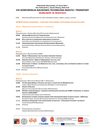Politechnika Warszawska, 27 marca 2014 r. Plac Politechniki 1, Gmach Główny, Mała Aula VIII KONFERENCJA NAUKOWO-TECHNICZNA MIASTO i TRANSPORT MOBILNOŚC W MIASTACH 9:30 REJESTRACJA/POCZĘSTUNEK DLA GOŚCI KONFERENCJI (KAWA, HERBATA, NAPOJE, CIASTKA) 10:00 OTWARCIE KONFERENCJI - POWITANIE UCZESTNIKÓW I WYSTĄPIENIA OFICJALNYCH GOŚCI 10:15 WRĘCZENIE NAGRÓD MIASTO I TRANSPORT SESJA 1. PRZEWODNICZĄCY: ANDRZEJ BRZEZIŃSKI (POLITECHNIKA WARSZAWSKA) 10:30 WYMIAR MIEJSKI POLITYKI TRANSPORTOWEJ AGNIESZKA DAWYDZIK (MINISTERSTWO INFRASTRUKTURY I ROZWOJU) 10:50 ROLA LOGISTYKI W ZARZĄDZANIU MOBILNOŚCIĄ W MIASTACH JACEK SZOŁTYSEK (UNIWERSYTET EKONOMICZNY W KATOWICACH) 11:10 UWARUNKOWANIA PRZESTRZENNE ZRÓWNOWAŻONEJ MOBILNOŚCI ALEKSANDRA FARON, ANDRZEJ RUDNICKI (POLITECHNIKA KRAKOWSKA) 11:30 DYSKUSJA SESJA 2. PRZEWODNICZĄCY: WIESŁAW WITEK (ZTM) 11:50 MOBILITY MANAGEMENT AND THE URBAN TRANSPORT PROBLEM GIULIANO MINGARDO (UNIWERSYTET ERAZMA W ROTTERDAMIE) 12:10 SMARTER CHOICES - MOBILITY MANAGEMENT ON LOCAL LEVEL HELEN OSBORN, SIAN THOMAS (CENTRO BIRMINGHAM) 12:30 FROM CHAOS TO ORDER: THE MANIFESTO FOR A SAFE, SUSTAINABLE AND AUTONOMOUS MOBILITY IN HOMETO-SCHOOL ROUTES ALESSANDRO MEGGIATO (REGGIO EMILIA) 12:50 DYSKUSJA 13:00 PRZERWA OBIADOWA SESJA 3. PRZEWODNICZĄCY: MIECZYSŁAW REKSNIS (M.ST. WARSZAWA) 14:00 THE EU URBAN MOBILITY PACKAGE AND WHAT IT MEANS FOR THE MEMBER STATES ISABELLE MAËS (EUROPEAN COMMISSION DG MOBILITY AND TRANSPORT) 14:20 PROJEKT CH4LLENGE WOJCIECH SUCHORZEWSKI (POLITECHNIKA WARSZAWSKA) 14:30 GŁÓWNE UWARUNKOWANIA I ZAŁOŻENIA WPROWADZENIA METODOLOGII SUMP W KRAKOWIE, W RAMACH PROJEKTU CH4LLENGE”. TOMASZ ZWOLIŃSKI (URZĄD MIASTA KRAKÓW) 14:50 DETERMINANTY WYBORU SPOSOBU PODRÓŻY PRZEZ MIESZKAŃCÓW GDYNI W ŚWIETLE BADAŃ Z 2013 ROKU KATARZYNA HEBEL, OLGIERD WYSZOMIRSKI (UNIWERSYTET GDAŃSKI/ZKM W GDYNI) 15:10 SPOSÓB NA ZMNIEJSZENIE ILOŚCI SAMOCHODÓW W MIASTACH – CARSHARING W EUROPIE I NA ŚWIECIE TAMAS DOMBI (ZTM WARSZAWA) 15:30 DYSKUSJA 15:55 PODSUMOWANIE KONFERENCJI ANDRZEJ BRZEZIŃSKI (POLITECHNIKA WARSZAWSKA)