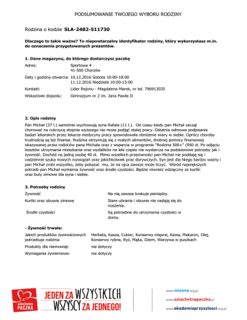 PODSUMOWANIE TWOJEGO WYBORU RODZINY Rodzina o kodzie SLA-2482-511730 Dlaczego to takie ważne? To niepowtarzalny identyfikator rodziny, który wykorzystasz m.in. do oznaczenia przygotowanych prezentów. 1. Dane magazynu, do którego dostarczysz paczkę Adres: Sportowa 4 41-500 Chorzów Daty i godziny otwarcia: 10.12.2016 Sobota 10:00-18:00 11.12.2016 Niedziela 10:00-15:00 Kontakt: Lider Rejonu - Magdalena Marek, nr tel. 796913035 Wskazówki dojazdu: Gimnazjum nr 2 im. Jana Pawła II 2. Opis rodziny Pan Michał (37 l.) samotnie wychowuję syna Rafała (11 l.). Od czasu kiedy pan Michał zaczął chorować na cukrzycę stopnia wyższego nie może podjąć stałej pracy. Ostatnia odmowa podpisania badań lekarskich przez lekarza medycyny pracy spowodowała obniżenie wiary w siebie. Oprócz choroby trudnością są też finanse. Rodzina utrzymuję się z małych alimentów, drobnej pomocy finansowej okazywanej przez rodziców pana Michała oraz z wsparcia w programie "Rodzina 500+" (950 zł. Po odjęciu kosztów utrzymania mieszkania oraz wydatków na leki często nie wystarcza na podstawowe potrzeby jak i żywność. Dochód na jedną osobę 40 zł. Mimo wszelkich przeciwności pan Michał nie poddaję się i codziennie szuka nowych rozwiązań oraz jakichkolwiek prac dorywczych. Syn jest dla Niego bardzo ważny i pan Michał zrobi wszystko, żeby pokazać mu, że na ojca zawsze może liczyć. Wśród największych potrzeb pan Michał wymienia żywność oraz środki czystości. Będzie również wdzięczny za kurtki oraz buty zimowe dla syna i siebie. 3. Potrzeby rodziny Żywność Na nią zawsze brakuje pieniędzy. Kurtki oraz obuwie zimowe Stare ubrania i obuwie nie nadają się do noszenia. Środki czystości Są potrzebne do utrzymania czystości w domu. - Żywność trwała: Jakich produktów żywnościowych potrzebuje rodzina: Herbata, Kasza, Cukier, Konserwy mięsne, Kawa, Makaron, Olej, Konserwy rybne, Ryż, Mąka, Dżem, Warzywa w puszkach Produkty dla niemowląt: nie dotyczy Wymagania żywieniowe: nie dotyczy PODSUMOWANIE TWOJEGO WYBORU RODZINY Rodzina o kodzie SLA-2482-511730 Inne produkty żywnościowe: nie dotyczy - Środki czystości Jakich środków czystości potrzebuje rodzina: Proszek do prania, Płyn do mycia naczyń, Mydło/żel myjący, Pasta do zębów, Płyny czyszczące, Szampon, Szczoteczka do zębów Artykuły dziecięce: nie dotyczy Inne: nie dotyczy - Odzież Michał Kontny Rodzaj odzieży: zimowa Kategoria: kurtka Rozmiar: L Sylwetka: szczupły Uwagi: Rafał Kontny Rodzaj odzieży: zimowa Kategoria: kurtka Rozmiar: XL Sylwetka: Uwagi: - Obuwie Michał Kontny Rodzaj obuwia: zimowe Kategoria: Rozmiar: 40 Uwagi: Rafał Kontny Rodzaj obuwia: zimowe Kategoria: Rozmiar: 41 PODSUMOWANIE TWOJEGO WYBORU RODZINY Rodzina o kodzie SLA-2482-511730 Uwagi: - Pomoce szkolne Jakich pomocy szkolnych potrzebuje rodzina? Zeszyty, Farbki, Papier kolorowy, Plecak, Bloki, Klej, Nożyczki, Przybory do pisania, Kredki, Plastelina, Piórnik Inne: nie dotyczy - Wyposażenie mieszkania Jakiego wyposażenia mieszkania potrzebuje rodzina: Kołdra, Koc, Ręczniki, Pościel, Poduszka Inne: nie dotyczy Brakujące sprzęty: nie dotyczy - Specjalne upominki Pan Michał- kosmetyki. Rafał- kosmetyki, gry planszowe, zabawki 4. Osoby opiekujące sie rodziną - Wolontariusz opiekun rodziny Imię i nazwisko: Natalia Chudy E-mail: [email protected] Telefon: 504869445 Preferowana forma kontaktu: kontakt telefoniczny, e-mailowy - Lider Rejonu Imię i nazwisko: Magdalena Marek 5. Mamy dla Ciebie kilka wskazówek, ważnych w przygotowaniu Paczki. * Paczki możesz dostarczyć wyłącznie do tego magazynu, z którego wybrana została rodzina. Wyjątkiem jest sytuacja, kiedy wybierzesz rodzinę z innego województwa, wtedy możesz dostarczyć paczkę do Magazynu Zastępczego znajdującego się w Twoim województwie (dane adresowe zamieszczone są na stronie wyboru rodziny). * Pamiętaj, że po wybraniu przez Ciebie rodziny nikt inny nie będzie już dla niej przygotowywał paczki. PODSUMOWANIE TWOJEGO WYBORU RODZINY Rodzina o kodzie SLA-2482-511730 * Nie musisz zakupić wszystkich rzeczy z listy. Pamiętaj jednak, że wybierając rodzinę decydujesz się w pierwszej kolejności zaspokoić 3 najważniejsze potrzeby, które rodzina wymieniła w opisie. Zwróć jednak uwagę, że wszystkie wymienione rzeczy są dla rodziny bardzo ważne. * Rzeczy, które podarujesz rodzinie powinny być dla niej prezentem. Nie muszą być one nowe, a jeśli są używane – niech będą zadbane. Paczka przygotowywana jest z myślą o drugim człowieku – jest jak prezent. Przygotuj paczkę tak, by podniosła poczucie własnej wartości u obdarowanych przez Ciebie osób. * Paczki powinny być podzielone na kilka, poręcznych, niezbyt ciężkich pudeł, prosimy nie dostarczać do magazynu produktów zapakowanych w reklamówki czy worki foliowe. * Każde pudło powinno być opisane kodem rodziny oraz opatrzone numerem, pudła należy numerować według klucza: np. 1 z 5, 2 z 5 itd. * W Paczce powinny znaleźć się suche i trwałe artykuły spożywcze. Prosimy, aby nie pakować do pudeł produktów, które łatwo ulegają uszkodzeniu, wylaniu, rozgnieceniu. * Aby prezent nabrał świątecznego charakteru można owinąć pudła świątecznym papierem! Warto też dodać kilka słów od siebie dla rodziny – chociażby na świątecznej kartce, czy w liście. 6. Aby cała Polska mogła na żywo śledzić wyniki SZLACHETNEJ PACZKI… … w trakcie finału w magazynach będziemy wybierali informacje o wartości Paczki i liczbie osób zaangażowanych w jej przygotowanie. Jednak nie uda nam się to bez Twojego wsparcia. Możesz sprawić, że przekazywane w świat wyniki będą prawdziwe i ucieszą całą Polskę. Prosimy – w czasie wizyty w magazynie wypełnij kartę i wrzuć do pudełka. Badanie jest anonimowe, a jego wynik analizowany będzie jedynie w zbiorczym zestawieniu. Razem zmieniamy świat na lepsze!