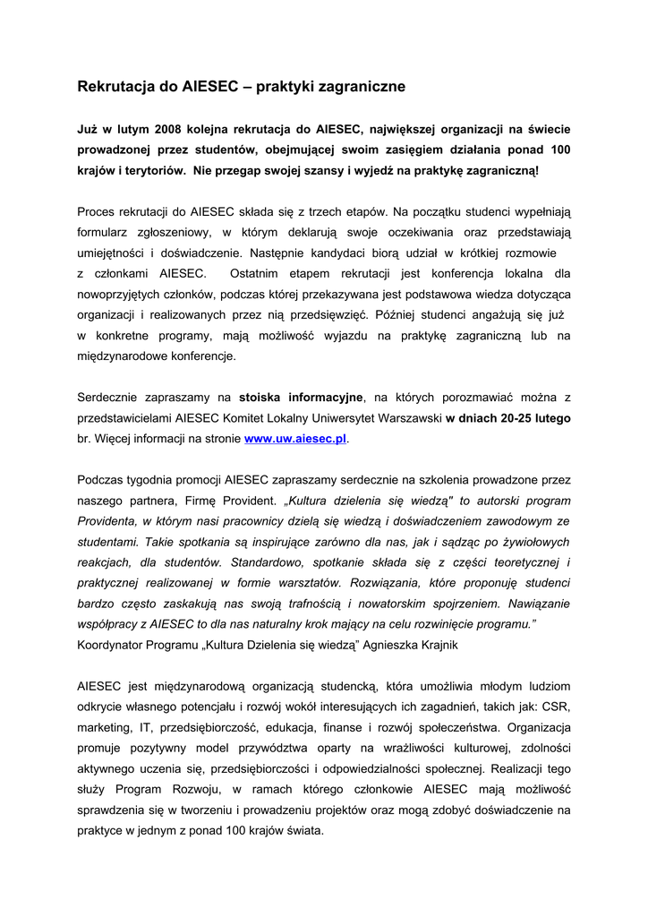 Rekrutacja do AIESEC – praktyki zagraniczne Już w lutym 2008 kolejna rekrutacja do AIESEC, największej organizacji na świecie prowadzonej przez studentów, obejmującej swoim zasięgiem działania ponad 100 krajów i terytoriów. Nie przegap swojej szansy i wyjedź na praktykę zagraniczną! Proces rekrutacji do AIESEC składa się z trzech etapów. Na początku studenci wypełniają formularz zgłoszeniowy, w którym deklarują swoje oczekiwania oraz przedstawiają umiejętności i doświadczenie. Następnie kandydaci biorą udział w krótkiej rozmowie z członkami AIESEC. Ostatnim etapem rekrutacji jest konferencja lokalna dla nowoprzyjętych członków, podczas której przekazywana jest podstawowa wiedza dotycząca organizacji i realizowanych przez nią przedsięwzięć. Później studenci angażują się już w konkretne programy, mają możliwość wyjazdu na praktykę zagraniczną lub na międzynarodowe konferencje. Serdecznie zapraszamy na stoiska informacyjne, na których porozmawiać można z przedstawicielami AIESEC Komitet Lokalny Uniwersytet Warszawski w dniach 20-25 lutego br. Więcej informacji na stronie www.uw.aiesec.pl. Podczas tygodnia promocji AIESEC zapraszamy serdecznie na szkolenia prowadzone przez naszego partnera, Firmę Provident. „Kultura dzielenia się wiedzą" to autorski program Providenta, w którym nasi pracownicy dzielą się wiedzą i doświadczeniem zawodowym ze studentami. Takie spotkania są inspirujące zarówno dla nas, jak i sądząc po żywiołowych reakcjach, dla studentów. Standardowo, spotkanie składa się z części teoretycznej i praktycznej realizowanej w formie warsztatów. Rozwiązania, które proponuję studenci bardzo często zaskakują nas swoją trafnością i nowatorskim spojrzeniem. Nawiązanie współpracy z AIESEC to dla nas naturalny krok mający na celu rozwinięcie programu.” Koordynator Programu „Kultura Dzielenia się wiedzą” Agnieszka Krajnik AIESEC jest międzynarodową organizacją studencką, która umożliwia młodym ludziom odkrycie własnego potencjału i rozwój wokół interesujących ich zagadnień, takich jak: CSR, marketing, IT, przedsiębiorczość, edukacja, finanse i rozwój społeczeństwa. Organizacja promuje pozytywny model przywództwa oparty na wrażliwości kulturowej, zdolności aktywnego uczenia się, przedsiębiorczości i odpowiedzialności społecznej. Realizacji tego służy Program Rozwoju, w ramach którego członkowie AIESEC mają możliwość sprawdzenia się w tworzeniu i prowadzeniu projektów oraz mogą zdobyć doświadczenie na praktyce w jednym z ponad 100 krajów świata. Kontakt do AIESEC Komitet Lokalny Uniwersytet Warszawski Hanna Żywiołowska Wiceprezydent ds. Komunikacji Marketingowej AIESEC Polska Komitet Lokalny Uniwersytet Warszawski tel. kom.: +48 604 783 782 mail: [email protected]