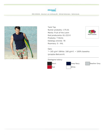 RRG DESIGN - Abraham van stolkweg 86 - 3041JA Rotterdam - Netherlands Tank Top Numer produktu: 175.01 Marka: Fruit of the Loom Kod producenta: 61-222-0 Produkty: T-Shirts Katalogu stronie: 78 Rozmiary: S - XXL Opis: "• 165 g/m² (White: 160 g/m²) • 100% bawełna (przędza Belcoro®) Dostępne kolory: Black Deep Navy Red White Heather Grey
