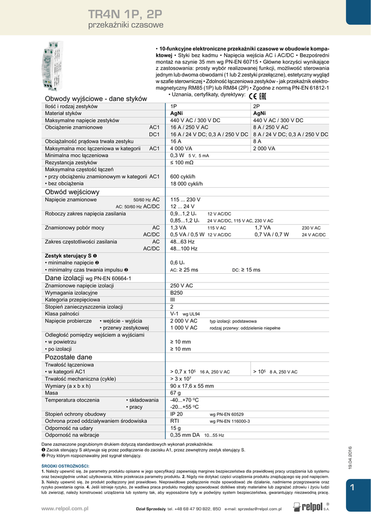 TR4N 1P, 2P przekaźniki czasowe Ilość i rodzaj zestyków Materiał styków Maksymalne napięcie zestyków Obciążenie znamionowe AC1 DC1 Obciążalność prądowa trwała zestyku Maksymalna moc łączeniowa w kategorii AC1 Minimalna moc łączeniowa Rezystancja zestyków Maksymalna częstość łączeń • przy obciążeniu znamionowym w kategorii AC1 • bez obciążenia 1P AgNi 440 V AC / 300 V DC 16 A / 250 V AC 16 A / 24 V DC; 0,3 A / 250 V DC 16 A 4 000 VA 0,3 W 5 V, 5 mA ≤ 100 mΩ Napięcie znamionowe 50/60 Hz AC AC: 50/60 Hz AC/DC Roboczy zakres napięcia zasilania 115 ... 230 V 12 ... 24 V 0,9...1,2 Un 12 V AC/DC 0,85...1,2 Un 24 V AC/DC, 115 V AC, 230 V AC 1,3 VA 115 V AC 1,7 VA 0,5 VA / 0,5 W 12 V AC/DC 0,7 VA / 0,7 W 48...63 Hz 48...100 Hz Obwód wejściowy Znamionowy pobór mocy AC AC/DC Zakres częstotliwości zasilania AC AC/DC Zestyk sterujący S ❶ • minimalne napięcie ❷ • minimalny czas trwania impulsu ❷ Dane izolacji wg PN-EN 60664-1 Znamionowe napięcie izolacji Wymagania izolacyjne Kategoria przepięciowa Stopień zanieczyszczenia izolacji Klasa palności Napięcie probiercze • wejście - wyjścia • przerwy zestykowej Odległość pomiędzy wejściem a wyjściami • w powietrzu • po izolacji Pozostałe dane Trwałość łączeniowa • w kategorii AC1 Trwałość mechaniczna (cykle) Wymiary (a x b x h) Masa Temperatura otoczenia • składowania • pracy Stopień ochrony obudowy Ochrona przed oddziaływaniem środowiska Odporność na udary Odporność na wibracje 2P AgNi 440 V AC / 300 V DC 8 A / 250 V AC 8 A / 24 V DC; 0,3 A / 250 V DC 8 A 2 000 VA 600 cykli/h 18 000 cykli/h 0,6 Un AC: ≥ 25 ms 250 V AC B250 III 2 V-1 wg UL94 2 000 V AC 1 000 V AC DC: 230 V AC 24 V AC/DC ≥ 15 ms typ izolacji: podstawowa rodzaj przerwy: oddzielenie niepełne ≥ 10 mm ≥ 10 mm > 0,7 x 105 16 A, 250 V AC > 105 8 A, 250 V AC > 3 x 107 90 x 17,6 x 55 mm 67 g -40...+70 oC -20...+55 oC IP 20 wg PN-EN 60529 RTI wg PN-EN 116000-3 15 g 0,35 mm DA 10...55 Hz Dane zaznaczone pogrubionym drukiem dotyczą standardowych wykonań przekaźników. ❶ Zacisk sterujący S aktywuje się przez podłączenie do zacisku A1, przez zewnętrzny zestyk sterujący S. ❷ Przy którym rozpoznawalny jest sygnał sterujący. ŚRODKI OSTROŻNOŚCI: 1. Należy upewnić się, że parametry produktu opisane w jego specyfikacji zapewniają margines bezpieczeństwa dla prawidłowej pracy urządzenia lub systemu oraz bezwzględnie unikać użytkowania, które przekracza parametry produktu. 2. Nigdy nie dotykać części urządzenia produktu znajdującego się pod napięciem. 3. Należy upewnić się, że produkt podłączony jest prawidłowo. Nieprawidłowe podłączenie może spowodować złe działanie, nadmierne przegrzewanie oraz ryzyko powstania ognia. 4. Jeśli istnieje ryzyko, że wadliwa praca produktu mogłaby spowodować dotkliwe straty materialne lub zagrażać zdrowiu i życiu ludzi lub zwierząt, należy konstruować urządzenia lub systemy tak, aby wyposażone były w podwójny system bezpieczeństwa, gwarantujący niezawodną pracę. www.relpol.com.pl Dzia³ Sprzeda¿y tel. +48 68 47 90 822, 850 • e-mail: [email protected] 19.04.2016 Obwody wyjściowe - dane styków •10-funkcyjne elektroniczne przekaźniki czasowe w obudowie kompa ktowej • Styki bez kadmu • Napięcia wejścia AC i AC/DC • Bezpośredni montaż na szynie 35 mm wg PN-EN 60715 • Główne korzyści wynikające z zastosowania: prosty wybór realizowanej funkcji, możliwość sterowania jednym lub dwoma obwodami (1 lub 2 zestyki przełączne), estetyczny wygląd w szafie sterowniczej • Zdolność łączeniowa zestyków - jak przekaźnik elektro magnetyczny RM85 (1P) lub RM84 (2P) • Zgodne z normą PN-EN 61812-1 • Uznania, certyfikaty, dyrektywy: 1 TR4N 1P, 2P przekaźniki czasowe Dane modułu czasowego Funkcje E, Wu, Bp, Bi, PWM, R, Ws, Wa, Esa, B ON / OFF - stałe załączenie / wyłączenie 1 s ❸; 10 s; 1 min.; 10 min.; 1 h; 10 h; 1 d; 10 d płynna - (0,1...1) x zakres czasowy ± 5% (liczona od końcowych wartości zakresów) ❸ ± 0,5% ❸ ± 0,01% / °C 80 ms dioda LED zielona - sygnalizacja napięcia zasilania U dioda LED żółta - sygnalizacja odmierzania czasu T oraz stanu wyjść po zakończeniu odmierzania czasu T ❹ Zakresy czasowe Nastawa czasu Dokładność nastawienia Powtarzalność Wpływ temperatury Czas regeneracji Wyświetlanie ❸ Dla pierwszego zakresu (1 s) dokładność nastawienia oraz powtarzalność są mniejsze niż podano w danych technicznych (znaczący wpływ czasu zadziałania przekaźnika wykonawczego). Zaleca się nastawienie odmierzanego czasu w sposób doświadczalny. ❹ Dioda LED żółta - odmierzanie czasu T (świecenie pulsujące); wzbudzony przekaźnik wykonawczy, czas nie odmierzany (świecenie ciągłe); odwzbudzony przekaźnik wykonawczy, czas nie odmierzany (brak świecenia). Wymiary Opis panelu czołowego Pokrętło nastawy zakresu czasu oraz funkcji ON / OFF Pokrętło nastawy czasu Pokrętło nastawy funkcji Dioda LED zielona Dioda LED żółta Prąd łączeniowy [A] Prąd łączeniowy [A] 19.04.2016 Liczba łączeń Trwałość łączeniowa w funkcji prądu obciążenia. Wykres 2 Częstość łączeń: 600 cykli/h - TR4N 2P Liczba łączeń Trwałość łączeniowa w funkcji prądu obciążenia. Wykres 1 Częstość łączeń: 600 cykli/h - TR4N 1P N 2P N 1P 2 www.relpol.com.pl Dzia³ Sprzeda¿y tel. +48 68 47 90 822, 850 • e-mail: [email protected] TR4N 1P, 2P przekaźniki czasowe Funkcje czasowe E - Opóźnione załączenie. R - Opóźnione wyłączenie sterowane zestykiem S. Włączenie napięcia zasilania U rozpoczyna odmierzenie nastawionego czasu T - opóźnienia załączenia przekaźnika wykonawczego R. Po odmierzeniu czasu T przekaźnik wykonawczy R załącza się i pozostaje załączony do momentu wyłączenia zasilania U. Wejście przekaźnika czasowego jest zasilane napięciem U w sposób ciągły. Zamknięcie zestyku sterującego S 