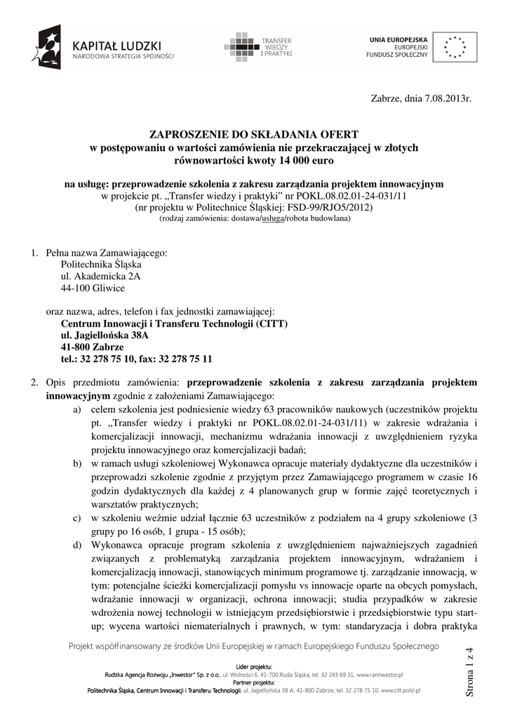 Zabrze, dnia 7.08.2013r. ZAPROSZENIE DO SKŁADANIA OFERT w postępowaniu o wartości zamówienia nie przekraczającej w złotych równowartości kwoty 14 000 euro na usługę: przeprowadzenie szkolenia z zakresu zarządzania projektem innowacyjnym w projekcie pt. „Transfer wiedzy i praktyki” nr POKL.08.02.01-24-031/11 (nr projektu w Politechnice Śląskiej: FSD-99/RJO5/2012) (rodzaj zamówienia: dostawa/usługa/robota budowlana) 1. Pełna nazwa Zamawiającego: Politechnika Śląska ul. Akademicka 2A 44-100 Gliwice oraz nazwa, adres, telefon i fax jednostki zamawiającej: Centrum Innowacji i Transferu Technologii (CITT) ul. Jagiellońska 38A 41-800 Zabrze tel.: 32 278 75 10, fax: 32 278 75 11 Projekt współfinansowany ze środków Unii Europejskiej w ramach Europejskiego Funduszu Społecznego Lider projektu: Rudzka Agencja Rozwoju „Inwestor” Sp. Sp. z o.o., o.o. ul. Wolności 6, 41-700 Ruda Śląska, tel. 32 243 69 31, www.rarinwestor.pl Partner projektu: Politechnika Śląska, Centrum Innowacji i Transferu Technologii, Technologii ul. Jagiellońska 38 A, 41-800 Zabrze, tel. 32 278 75 10, www.citt.polsl.pl Strona 1 z 4 2. Opis przedmiotu zamówienia: przeprowadzenie szkolenia z zakresu zarządzania projektem innowacyjnym zgodnie z założeniami Zamawiającego: a) celem szkolenia jest podniesienie wiedzy 63 pracowników naukowych (uczestników projektu pt. „Transfer wiedzy i praktyki nr POKL.08.02.01-24-031/11) w zakresie wdrażania i komercjalizacji innowacji, mechanizmu wdrażania innowacji z uwzględnieniem ryzyka projektu innowacyjnego oraz komercjalizacji badań; b) w ramach usługi szkoleniowej Wykonawca opracuje materiały dydaktyczne dla uczestników i przeprowadzi szkolenie zgodnie z przyjętym przez Zamawiającego programem w czasie 16 godzin dydaktycznych dla każdej z 4 planowanych grup w formie zajęć teoretycznych i warsztatów praktycznych; c) w szkoleniu weźmie udział łącznie 63 uczestników z podziałem na 4 grupy szkoleniowe (3 grupy po 16 osób, 1 grupa - 15 osób); d) Wykonawca opracuje program szkolenia z uwzględnieniem najważniejszych zagadnień związanych z problematyką zarządzania projektem innowacyjnym, wdrażaniem i komercjalizacją innowacji, stanowiących minimum programowe tj. zarządzanie innowacją, w tym: potencjalne ścieżki komercjalizacji pomysłu vs innowacje oparte na obcych pomysłach, wdrażanie innowacji w organizacji, ochrona innowacji; studia przypadków w zakresie wdrożenia nowej technologii w istniejącym przedsiębiorstwie i przedsiębiorstwie typu startup; wycena wartości niematerialnych i prawnych, w tym: standaryzacja i dobra praktyka e) f) g) h) i) j) k) Warunki płatności: przelew bankowy do 15-go następnego miesiąca po wykonaniu przedmiotu zamówienia i wystawieniu rachunku lub do 14 dni od otrzymania poprawnie wystawionej faktury. Podstawą do wystawienia rachunku lub faktury jest podpisany przez obydwie strony protokół, bez uwag i zastrzeżeń Zamawiającego. Zamawiający dopuszcza możliwość płatności częściowych, nie częściej jednak niż w okresach miesięcznych. Płatność może ulec opóźnieniu w sytuacji opóźnienia Projekt współfinansowany ze środków Unii Europejskiej w ramach Europejskiego Funduszu Społecznego Lider projektu: Rudzka Agencja Rozwoju „Inwestor” Sp. Sp. z o.o., o.o. ul. Wolności 6, 41-700 Ruda Śląska, tel. 32 243 69 31, www.rarinwestor.pl Partner projektu: Politechnika Śląska, Centrum Innowacji i Transferu Technologii, Technologii ul. Jagiellońska 38 A, 41-800 Zabrze, tel. 32 278 75 10, www.citt.polsl.pl Strona 2 z 4 3. procesu wyceny, ćwiczenia w zakresie doboru i zastosowania metod wyceny; ryzyko w projekcie innowacyjnym, w tym: ćwiczenia w oparciu o metodyki ERM oraz normy ISO 31000; koszty i finanse, w tym: estymacja kosztów innowacji, analiza rentowności projektu, audyt wewnętrzny; zarządzanie zespołem w projekcie innowacyjnym, w tym: diagnoza strategii kreatywności, metody twórczego i kreatywnego myślenia, rozwiązywanie problemów w konkretnych sytuacjach, zespołowe techniki myślenia kreatywnego. Program szkolenia należy dołączyć do dokumentacji ofertowej; dokumentacja związana z realizacją usługi szkoleniowej, w tym materiały dydaktyczne, muszą być oznaczone zgodnie z wymogami programów współfinansowanych z Europejskiego Funduszu Społecznego według wzorów dokumentów przekazanych przez Zamawiającego; zajęcia będą prowadzone zgodnie z harmonogramem w terminach zaakceptowanych przez obydwie strony z zastrzeżeniem, że usługa szkoleniowa musi być zrealizowana w całości najpóźniej do 31.12.2013r.; po zakończeniu każdej edycji szkolenia Wykonawca przekaże uczestnikom imienny certyfikat/zaświadczenie potwierdzające udział w szkoleniu; Zamawiający zapewni infrastrukturę niezbędną do organizacji szkolenia, tj. salę wykładową wraz z wyposażeniem: projektor multimedialny, ekran projekcyjny, tablice dydaktyczne. Szkolenia odbędą się w siedzibie Zamawiającego – w budynku Centrum Innowacji i Transferu Technologii Politechniki Śląskiej w Zabrzu przy ul. Jagiellońskiej 38A; odbiór przedmiotu zamówienia odbędzie się na podstawie protokołu odbioru podpisanego przez obydwie strony, w szczególności bez uwag lub zastrzeżeń Zamawiającego; w razie płatności częściowych będą sporządzane okresowe protokoły odbioru, stanowiące podstawę do wystawienia częściowych faktur/rachunków; należność określona w złożonej ofercie musi uwzględniać wszystkie koszty związane z realizacją przedmiotu zamówienia tj. przygotowanie materiałów dydaktycznych, przeprowadzenie szkolenia, wynagrodzenie wykwalifikowanego wykładowcy/trenera, pokrycie kosztów dojazdu i ewentualnego noclegu wykładowcy/trenera; Oferent musi wykazać przygotowanie merytoryczne i doświadczenie w realizacji podobnych usług spełniając następujące wymagania: i. posiadać co najmniej trzyletnie doświadczenie w realizacji usł