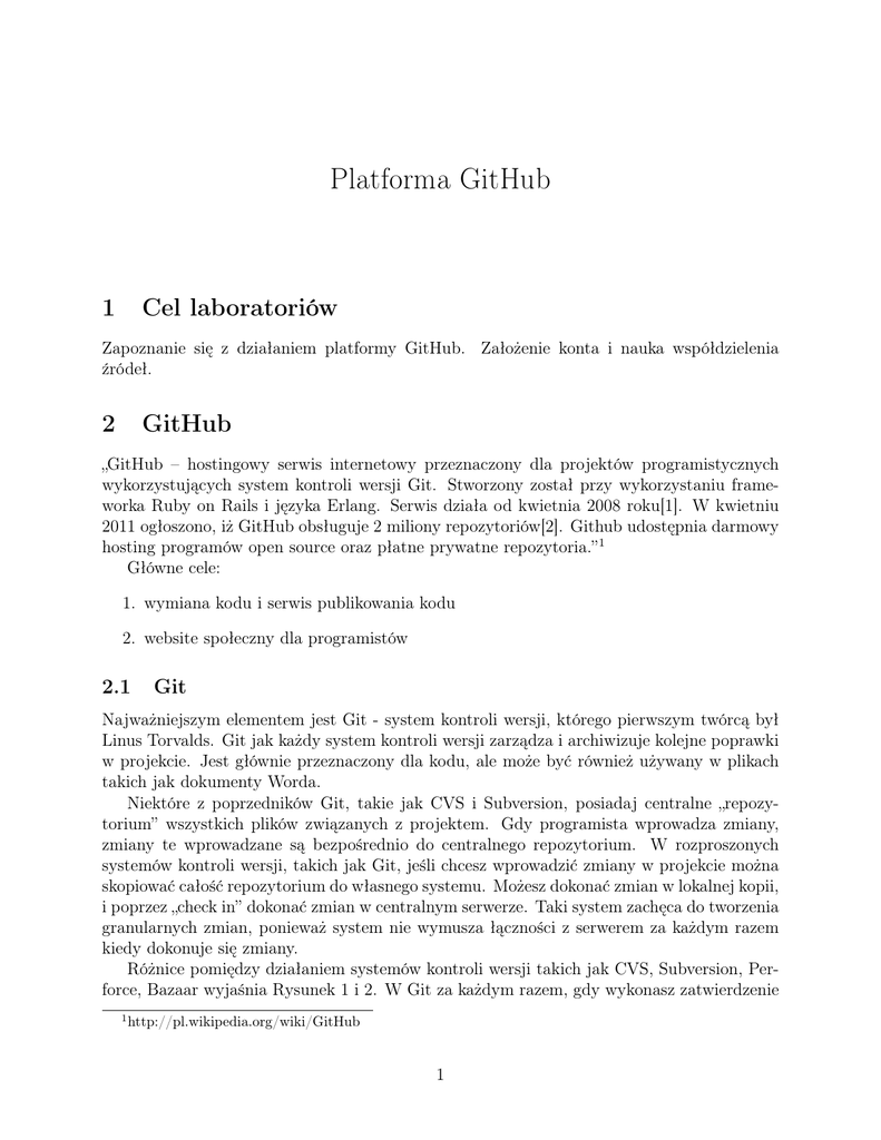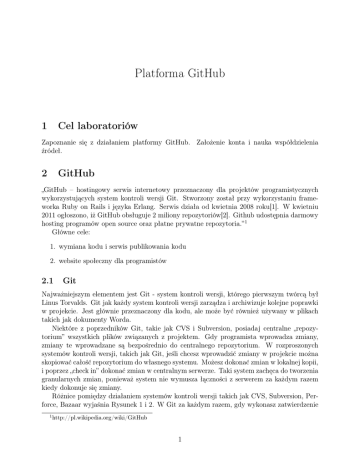 Platforma GitHub 1 Cel laboratoriów Zapoznanie się z działaniem platformy GitHub. Założenie konta i nauka współdzielenia źródeł. 2 GitHub „GitHub – hostingowy serwis internetowy przeznaczony dla projektów programistycznych wykorzystujących system kontroli wersji Git. Stworzony został przy wykorzystaniu frameworka Ruby on Rails i języka Erlang. Serwis działa od kwietnia 2008 roku[1]. W kwietniu 2011 ogłoszono, iż GitHub obsługuje 2 miliony repozytoriów[2]. Github udostępnia darmowy hosting programów open source oraz płatne prywatne repozytoria.” 1 Główne cele: 1. wymiana kodu i serwis publikowania kodu 2. website społeczny dla programistów 2.1 Git Najważniejszym elementem jest Git - system kontroli wersji, którego pierwszym twórcą był Linus Torvalds. Git jak każdy system kontroli wersji zarządza i archiwizuje kolejne poprawki w projekcie. Jest głównie przeznaczony dla kodu, ale może być również używany w plikach takich jak dokumenty Worda. Niektóre z poprzedników Git, takie jak CVS i Subversion, posiadaj centralne „repozytorium” wszystkich plików związanych z projektem. Gdy programista wprowadza zmiany, zmiany te wprowadzane są bezpośrednio do centralnego repozytorium. W rozproszonych systemów kontroli wersji, takich jak Git, jeśli chcesz wprowadzić zmiany w projekcie można skopiować całość repozytorium do własnego systemu. Możesz dokonać zmian w lokalnej kopii, i poprzez „check in” dokonać zmian w centralnym serwerze. Taki system zachęca do tworzenia granularnych zmian, ponieważ system nie wymusza łączności z serwerem za każdym razem kiedy dokonuje się zmiany. Różnice pomiędzy działaniem systemów kontroli wersji takich jak CVS, Subversion, Perforce, Bazaar wyjaśnia Rysunek 1 i 2. W Git za każdym razem, gdy wykonasz zatwierdzenie 1 http://pl.wikipedia.org/wiki/GitHub 1 Rysunek 1: Kontrola wersji jako lista zmian w plikach źródłowych: źródło:http://gitscm.com/book/en/v2/Getting-Started-Git-Basics Rysunek 2: Kontrola wersji w Git: źródło:http://git-scm.com/book/en/v2/Getting-StartedGit-Basics zmian „commit” lub zapiszesz projekt Git zapamiętuje stan (jako migawkę) wszystkich plików w tym momencie. Jeżeli plik się nie zmienił, przechowuje się tylko link do pliku, który był już zapisany wcześniej. Główne cechy GIT to: 1. Prawie wszystkie operacje wykonywane są lokalnie — historia zmian jest przechowywana lokalnie, porównania plików z poprzednich wersji 2. Integralność — każda operacja jest związana z generowaniem sumy kontrolnej (SHA-1) na pliku. Suma ma format 40 znakowe ciągu heksadecymalnego np. 24b9da6552252987aa493b52f 8696cd6d3b00373 3. Dodawanie — Git głównie dodaje elementy, usuwanie jest wieloetapowym zadaniem i zabezpiecza przed utratą danych. 4. Trzy stany — pliki mogą się znajdować w jednym z trzech stanów: zmodyfikowany, staged (plik został zmodyfikowany i czeka by przenieść bazy zmian) i commited (pliki zapisane w bazie zmian) (rysunek 3). 2 Rysunek 3: Trzy stany pliku. źródło:http://git-scm.com/book/en/v2/Getting-Started-GitBasics 2.2 GitHub GitHub jest usługą hostingową dla repozytorium Git i dodaje wiele własnych elementów. Git jest narzędziem obsługiwanym z linii komend, GitHub zapewnia graficzny interfejs webowy. Zapewnia również kontrolę dostępu i kilka możliwości współpracy, takich jak wiki i podstawowe narzędzia zarządzania zadaniami dla każdego projektu. Flagową funkcjonalnością GitHub jest „forking” - kopiowanie repozytorium z konta jednego użytkownika do drugiego. Umożliwia to wykorzystanie projektu, do którego nie masz dostępu do zapisu i możesz modyfikować go na swoim koncie. Jeśli dokonasz zmian, które chcesz udostępnić, możesz wysłać zgłoszenie zwane „pull request” do pierwotnego właściciela. Właściciel może następnie, za pomocą kliknięcia, scalić zmiany znalezionych w twoim repo z oryginalnym repo. Dotychczas, jeżeli chciało się włączyć do projektu open source trzeba było ręcznie pobrać kod źródłowy projektu, wprowadź zmiany lokalnie, następnie utworzyć listę zmian zwanych „patch”, a następnie wysłać mailem do opiekuna projektu. Opiekun musiał ocenić tę poprawkę, czasami wysłany przez zupełnie nieznanego kodera, i zdecydować, czy do zmiany nadają się do scalenia. W środowisku sieciowym jakim jest GitHub ta procedura wygląda inaczej. Kiedy koder złoży „pull request”, opiekun projektu może zobaczyć jego profil, który obejmuje wkład w projekty zapisane w GitHub. Jeśli poprawka zostanie przyjęta, można uzyskać kredyt od opiekuna, i to widać w profilu. GitHub jest jak CV, które pomaga określić dorobek programisty. Im więcej ludzi i projektów na GitHub, tym lepszy obraz daje to opiekunom projektów. Poprawki mogą być publicznie dyskutowane. 3 3 Zadania do wykonania Celem zadań jest nauka wykorzystania Git i GitHub wraz z założeniem konta. 3.1 Git - instalacja i konfiguracja 1. Przejdź do strony: http://git-scm.com/downloads lub https://git-for-windows. github.io. Drugi adres zawiera narzędzia okienkowe do obsługi Git. 2. Zainstaluj Git 3. Otwórz Git Bash, który jest CLI (Command Line Interface). Przetestować w nim polecenia: pwd, clear, ls, ls -l, ls -a, ls -al, cd .., cd, mkdir, touch, cp, rm, mv, echo, date. 4. Każde zatwiedzenie zmian „commit” jest będzie oznaczone nazwą użytkownika i adresem e-mail. Dlatego wykonaj następujące polecenia $git config --global $git config --global user.name ,,Your name here’’ user.email ,,Your email here’’ Wykonanie polecenia po raz kolejny doprowadzi do zmiany tych danych. 5. Sprawdź zmiany $git config --list 6. Aby wyjść z basha wpisz: $exit 3.2 GitHub - założenie konta i konfiguracja 1. Przejdź do strony: https://github.com/ 2. Wprowadź: username, email i password i kliknij „Sign up for GitHub” 3. Uwaga: użyj tego samego adresu, który został użyt