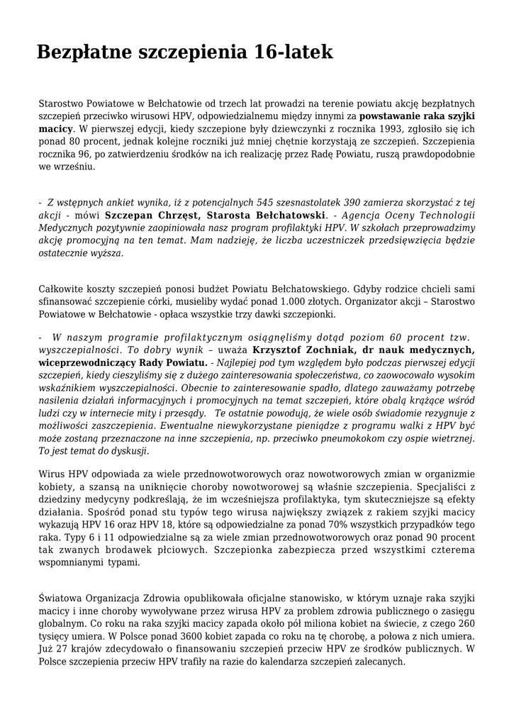 Bezpłatne szczepienia 16-latek Starostwo Powiatowe w Bełchatowie od trzech lat prowadzi na terenie powiatu akcję bezpłatnych szczepień przeciwko wirusowi HPV, odpowiedzialnemu między innymi za powstawanie raka szyjki macicy. W pierwszej edycji, kiedy szczepione były dziewczynki z rocznika 1993, zgłosiło się ich ponad 80 procent, jednak kolejne roczniki już mniej chętnie korzystają ze szczepień. Szczepienia rocznika 96, po zatwierdzeniu środków na ich realizację przez Radę Powiatu, ruszą prawdopodobnie we wrześniu. - Z wstępnych ankiet wynika, iż z potencjalnych 545 szesnastolatek 390 zamierza skorzystać z tej akcji - mówi Szczepan Chrzęst, Starosta Bełchatowski. - Agencja Oceny Technologii Medycznych pozytywnie zaopiniowała nasz program profilaktyki HPV. W szkołach przeprowadzimy akcję promocyjną na ten temat. Mam nadzieję, że liczba uczestniczek przedsięwzięcia będzie ostatecznie wyższa. Całkowite koszty szczepień ponosi budżet Powiatu Bełchatowskiego. Gdyby rodzice chcieli sami sfinansować szczepienie córki, musieliby wydać ponad 1.000 złotych. Organizator akcji – Starostwo Powiatowe w Bełchatowie - opłaca wszystkie trzy dawki szczepionki. - W naszym programie profilaktycznym osiągnęliśmy dotąd poziom 60 procent tzw. wyszczepialności. To dobry wynik – uważa Krzysztof Zochniak, dr nauk medycznych, wiceprzewodniczący Rady Powiatu. - Najlepiej pod tym względem było podczas pierwszej edycji szczepień, kiedy cieszyliśmy się z dużego zainteresowania społeczeństwa, co zaowocowało wysokim wskaźnikiem wyszczepialności. Obecnie to zainteresowanie spadło, dlatego zauważamy potrzebę nasilenia działań informacyjnych i promocyjnych na temat szczepień, które obalą krążące wśród ludzi czy w internecie mity i przesądy. Te ostatnie powodują, że wiele osób świadomie rezygnuje z możliwości zaszczepienia. Ewentualne niewykorzystane pieniądze z programu walki z HPV być może zostaną przeznaczone na inne szczepienia, np. przeciwko pneumokokom czy ospie wietrznej. To jest temat do dyskusji. Wirus HPV odpowiada za wiele przednowotworowych oraz nowotworowych zmian w organizmie kobiety, a szansą na uniknięcie choroby nowotworowej są właśnie szczepienia. Specjaliści z dziedziny medycyny podkreślają, że im wcześniejsza profilaktyka, tym skuteczniejsze są efekty działania. Spośród ponad stu typów tego wirusa największy związek z rakiem szyjki macicy wykazują HPV 16 oraz HPV 18, które są odpowiedzialne za ponad 70% wszystkich przypadków tego raka. Typy 6 i 11 odpowiedzialne są za wiele zmian przednowotworowych oraz ponad 90 procent tak zwanych brodawek płciowych. Szczepionka zabezpiecza przed wszystkimi czterema wspomnianymi typami. Światowa Organizacja Zdrowia opublikowała oficjalne stanowisko, w którym uznaje raka szyjki macicy i inne choroby wywoływane przez wirusa HPV za problem zdrowia publicznego o zasięgu globalnym. Co roku na raka szyjki macicy zapada około pół miliona kobiet na świecie, z czego 260 tysięcy umiera. W Polsce ponad 3600 kobiet zapada co roku na tę chorobę, a połowa z nich umiera. Już 27 krajów zdecydowało o finansowaniu szczepień przeciw HPV ze środków publicznych. W Polsce szczepienia przeciw HPV trafiły na razie do kalendarza szczepień zalecanych. Krzysztof Borowski Rzecznik prasowy Starostwo Powiatowe w Bełchatowie