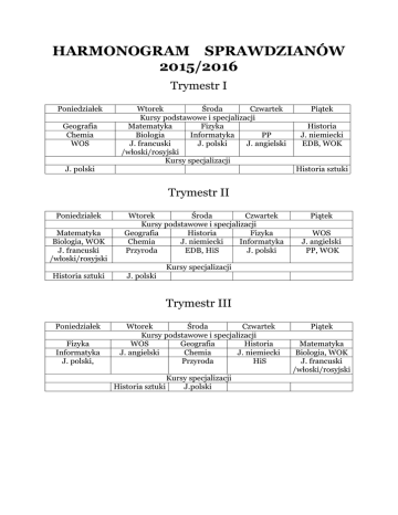 HARMONOGRAM SPRAWDZIANÓW 2015/2016 Trymestr I Poniedziałek Geografia Chemia WOS Wtorek Środa Czwartek Kursy podstawowe i specjalizacji Matematyka Fizyka Biologia Informatyka PP J. francuski J. polski J. angielski /włoski/rosyjski Kursy specjalizacji J. polski Piątek Historia J. niemiecki EDB, WOK Historia sztuki Trymestr II Poniedziałek Matematyka Biologia, WOK J. francuski /włoski/rosyjski Wtorek Środa Czwartek Kursy podstawowe i specjalizacji Geografia Historia Fizyka Chemia J. niemiecki Informatyka Przyroda EDB, HiS J. polski Piątek WOS J. angielski PP, WOK Kursy specjalizacji Historia sztuki J. polski Trymestr III Poniedziałek Fizyka Informatyka J. polski, Wtorek Środa Czwartek Kursy podstawowe i specjalizacji WOS Geografia Historia J. angielski Chemia J. niemiecki Przyroda HiS Kursy specjalizacji Historia sztuki J.polski Piątek Matematyka Biologia, WOK J. francuski /włoski/rosyjski