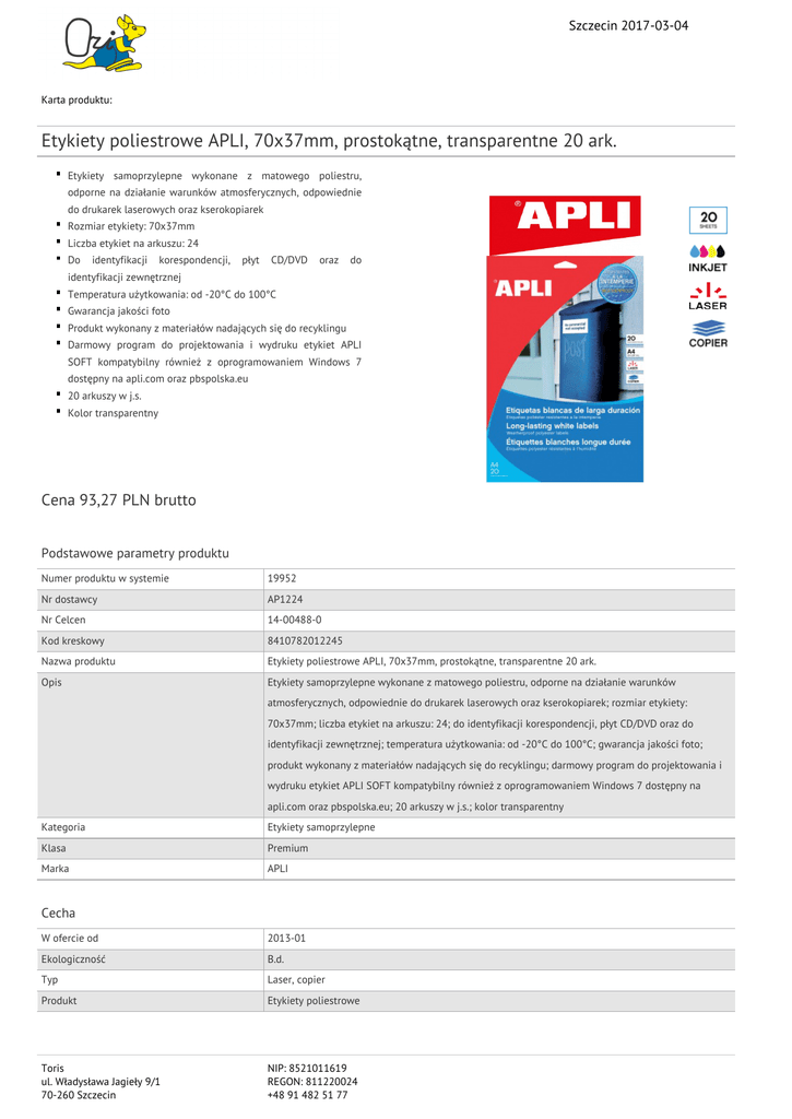 Szczecin 2017-03-04 Karta produktu: Etykiety poliestrowe APLI, 70x37mm, prostokątne, transparentne 20 ark. Etykiety samoprzylepne wykonane z matowego poliestru, odporne na działanie warunków atmosferycznych, odpowiednie do drukarek laserowych oraz kserokopiarek Rozmiar etykiety: 70x37mm Liczba etykiet na arkuszu: 24 Do identyfikacji korespondencji, płyt CD/DVD oraz do identyfikacji zewnętrznej Temperatura użytkowania: od -20°C do 100°C Gwarancja jakości foto Produkt wykonany z materiałów nadających się do recyklingu Darmowy program do projektowania i wydruku etykiet APLI SOFT kompatybilny również z oprogramowaniem Windows 7 dostępny na apli.com oraz pbspolska.eu 20 arkuszy w j.s. Kolor transparentny Cena 93,27 PLN brutto Podstawowe parametry produktu Numer produktu w systemie 19952 Nr dostawcy AP1224 Nr Celcen 14-00488-0 Kod kreskowy 8410782012245 Nazwa produktu Etykiety poliestrowe APLI, 70x37mm, prostokątne, transparentne 20 ark. Opis Etykiety samoprzylepne wykonane z matowego poliestru, odporne na działanie warunków atmosferycznych, odpowiednie do drukarek laserowych oraz kserokopiarek; rozmiar etykiety: 70x37mm; liczba etykiet na arkuszu: 24; do identyfikacji korespondencji, płyt CD/DVD oraz do identyfikacji zewnętrznej; temperatura użytkowania: od -20°C do 100°C; gwarancja jakości foto; produkt wykonany z materiałów nadających się do recyklingu; darmowy program do projektowania i wydruku etykiet APLI SOFT kompatybilny również z oprogramowaniem Windows 7 dostępny na apli.com oraz pbspolska.eu; 20 arkuszy w j.s.; kolor transparentny Kategoria Etykiety samoprzylepne Klasa Premium Marka APLI Cecha W ofercie od 2013-01 Ekologiczność B.d. Typ Laser, copier Produkt Etykiety poliestrowe Toris ul. Władysława Jagieły 9/1 70-260 Szczecin NIP: 8521011619 REGON: 811220024 +48 91 482 51 77 Szczecin 2017-03-04 Karta katalogowa produktu cd. Etykiety poliestrowe APLI, 70x37mm, prostokątne, transparentne 20 ark. Kształt Prostokątne Materiał Papier Wymiary Wymiary (mm) 70x37 Gramatura (g/m2) B.d. Wspólny słownik zamówień CPV 30192800-9 Etykiety samoprzylepne Certyfikaty Nowy produkt w ofercie Standard Hit Standard Ilość Ilość arkuszy 20 Ilość etykiet na arkuszu 24 Kolor Kolor Transparentny Pozostałe zdjęcia produktu Serdecznie zapraszamy do współpracy Toris zespół. Toris ul. Władysława Jagieły 9/1 70-260 Szczecin NIP: 8521011619 REGON: 811220024 +48 91 482 51 77