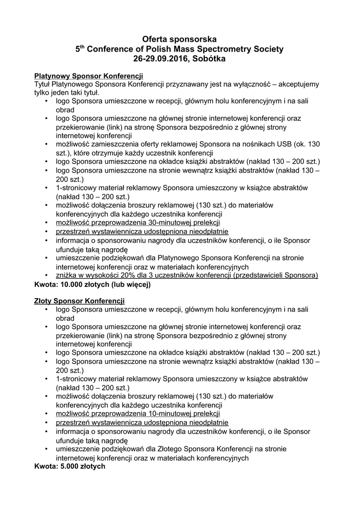 Oferta sponsorska 5 Conference of Polish Mass Spectrometry Society 26-29.09.2016, Sobótka th Platynowy Sponsor Konferencji Tytuł Platynowego Sponsora Konferencji przyznawany jest na wyłączność – akceptujemy tylko jeden taki tytuł. • logo Sponsora umieszczone w recepcji, głównym holu konferencyjnym i na sali obrad • logo Sponsora umieszczone na głównej stronie internetowej konferencji oraz przekierowanie (link) na stronę Sponsora bezpośrednio z głównej strony internetowej konferencji • możliwość zamieszczenia oferty reklamowej Sponsora na nośnikach USB (ok. 130 szt.), które otrzymuje każdy uczestnik konferencji • logo Sponsora umieszczone na okładce książki abstraktów (nakład 130 – 200 szt.) • logo Sponsora umieszczone na stronie wewnątrz książki abstraktów (nakład 130 – 200 szt.) • 1-stronicowy materiał reklamowy Sponsora umieszczony w książce abstraktów (nakład 130 – 200 szt.) • możliwość dołączenia broszury reklamowej (130 szt.) do materiałów konferencyjnych dla każdego uczestnika konferencji • możliwość przeprowadzenia 30-minutowej prelekcji • przestrzeń wystawiennicza udostępniona nieodpłatnie • informacja o sponsorowaniu nagrody dla uczestników konferencji, o ile Sponsor ufunduje taką nagrodę • umieszczenie podziękowań dla Platynowego Sponsora Konferencji na stronie internetowej konferencji oraz w materiałach konferencyjnych • zniżka w wysokości 20% dla 3 uczestników konferencji (przedstawicieli Sponsora) Kwota: 10.000 złotych (lub więcej) Złoty Sponsor Konferencji • logo Sponsora umieszczone w recepcji, głównym holu konferencyjnym i na sali obrad • logo Sponsora umieszczone na głównej stronie internetowej konferencji oraz przekierowanie (link) na stronę Sponsora bezpośrednio z głównej strony internetowej konferencji • logo Sponsora umieszczone na okładce książki abstraktów (nakład 130 – 200 szt.) • logo Sponsora umieszczone na stronie wewnątrz książki abstraktów (nakład 130 – 200 szt.) • 1-stronicowy materiał reklamowy Sponsora umieszczony w książce abstraktów (nakład 130 – 200 szt.) • możliwość dołączenia broszury reklamowej (130 szt.) do materiałów konferencyjnych dla każdego uczestnika konferencji • możliwość przeprowadzenia 10-minutowej prelekcji • przestrzeń wystawiennicza udostępniona nieodpłatnie • informacja o sponsorowaniu nagrody dla uczestników konferencji, o ile Sponsor ufunduje taką nagrodę • umieszczenie podziękowań dla Złotego Sponsora Konferencji na stronie internetowej konferencji oraz w materiałach konferencyjnych Kwota: 5.000 złotych Srebrny Sponsor Konferencji • logo Sponsora umieszczone na głównej stronie internetowej konferencji • logo Sponsora umieszczone na stronie wewnątrz książki abstraktów (nakład 130 – 200 szt.) • możliwość dołączenia broszury reklamowej (130 szt.) do materiałów konferencyjnych dla każdego uczestnika konferencji • informacja o sponsorowaniu nagrody dla uczestników konferencji, o ile Sponsor ufunduje taką nagrodę • umieszczenie podziękowań dla Srebrnego Sponsora Konferencji na stronie internetowej konferencji oraz w materiałach konferencyjnych Kwota: 3.000 złotych Sponsor • logo Sponsora umieszczone na stronie wewnątrz książki abstraktów (nakład 130 – 200 szt.) Cena – wsparcie rzeczowe do negocjacji. • • Formy sponsorowania przekazanie określonej kwoty pieniężnej wydatkowanej przez organizatorów bezgotówkowa forma dofinansowania uzgodniona bezpośrednio z Organizatorem, np. ◦ plecaki – 130 szt. ◦ inne produkty (w tym także spożywcze) zaproponowane przez Sponsora Ranga sponsora Sumaryczne kwoty obejmujące dowolną formę dofinansowania decydujące o statusie sponsora: Platynowy Sponsor Konferencji od 10.000 PLN Złoty Sponsor Konferencji 5.000 PLN Srebrny Sponsor Konferencji 3.000 PLN Cena stoiska wystawienniczego w czasie trwania konferencji: 1.000 złotych Kontakt: dr hab. Piotr Stefanowicz Uniwersytet Wrocławski, Wydział Chemii ul. Joliot-Curie 14, 50-383 Wrocław Tel: +48 71 3757213, Fax: +48 71 3282348 e-mail: [email protected]