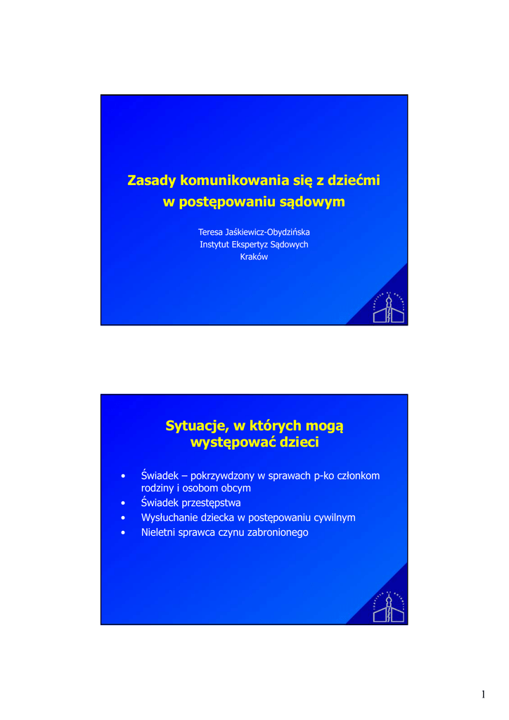 Zasady komunikowania się z dziećmi w postępowaniu sądowym Teresa Jaśkiewicz-Obydzińska Instytut Ekspertyz Sądowych Kraków Sytuacje, w których mogą występować dzieci • • • • Świadek – pokrzywdzony w sprawach p-ko członkom rodziny i osobom obcym Świadek przestępstwa Wysłuchanie dziecka w postępowaniu cywilnym Nieletni sprawca czynu zabronionego 1 Etapy rozwoju dziecka 1. 2. 3. 4. 5. Wiek niemowlęcy – do końca 1.r.ż. Wiek poniemowlęcy – 2 – r. ż. Wiek przedszkolny – 3/4 – 6/7 r. ż. Wiek szkolny – 6/7 – 10/12 r. ż. Okres dorastania – 10/12 – 18/20 r. ż. (Brzezińska, 2005) Ocena kompetencji dziecka jako świadka lub osoby wysłuchiwanej Psychologiczne kryteria oceny: -wiek rozwojowy - 4 r.ż. – wiek, w którym dziecko w określonych warunkach może być świadkiem -właściwości indywidualne --poziom rozwoju poznawczego, emocjonalnego, społecznego --podatność na sugestię --relacja ze sprawcą i okoliczności zdarzenia 2 Zmiany rozwojowe istotne dla prowadzenia przesłuchania/wysłuchania Wiek przedszkolny Dynamiczne zmiany w motoryce i zachowaniu, intensywny rozwój poznawczy, opanowana mowa. Zdolność krótkotrwałej koncentracji na określonej czynności. Zdolność szeregowania zdarzeń w kolejności występowania, ale brak możliwości precyzyjnego określenia czasu. 3 Wiek przedszkolny Zdolność klasyfikowania, grupowania np. na zasadzie podobieństwa. Początki rozpoznawania własnych emocji i zdolność mówienia o nich. Nauka kontrolowania emocji gniewu, strachu, złości. Reagowanie z troską i zrozumieniem dla uczuć innych ludzi, co może być podstawą manipulacji dziećmi. Wiek przedszkolny Istotne dla przesłuchania i diagnozy Stosować proste i zrozumiałe dla dziecka słownictwo. Umieszczać zdarzenia w ramach znanych dziecku czynności, zamiast pytać o czas. Nie pytać ile razy zdarzenie miało miejsce (dzieci rozróżniają tylko dużo-mało) Zadawać konkretne pytania dot. otoczenia, osoby i części ciała. Posługiwać się krótkimi zdaniami. Nie powtarzać pytań. Można użyć zabawek jako pomocy w komunikacji z dzieckiem. 4 Wiek szkolny Poznawcza aktywność dziecka jest selektywna, systematyczna i dowolna. Rozwój pamięci dowolnej. Umiejętność oceny zachowania w kategoriach moralnych, odnoszonych do nakazów i zakazów opiekunów i rówieśników. Wzrost znaczenia relacji rówieśniczych, które wpływają na obraz siebie. Traumatyczne przeżycia związane z przestępstwem wpływają na to co dziecko myśli o swojej roli w zdarzeniu. Wiek szkolny Istotne dla przesłuchania i diagnozy Stosować pytania otwarte, które pozwalają na swobodną relację o zdarzeniu. Wystrzegać się terminów prawnych. Podczas badania psychologicznego należy dążyć do ustalenia motywacji do składania zeznań. 5 Okres dorastania Trudny okres rozwojowy ze względu na przemiany biologiczne i emocjonalne. Rozwój sfery poznawczej wyprzedza dojrzewanie społeczne i emocjonalne. Myślenie logiczne, abstrakcyjne, w mniejszym stopniu egocentryczne. Rozwój myślenia dedukcyjnego i indukcyjnego. Duża podatność na zranienie. Kształtowanie tożsamości. Dążenie do samodzielności i uniezależnienia się od dorosłych, Wzrost znaczenia grup rówieśniczych. Okres dorastania Istotne dla przesłuchania i diagnozy Szczególne niebezpieczeństwo wtórnej wiktymizacji. Diagnoza : ustalenie czynników emocjonalnych zaburzających kontakt z osobą badającą i przesłuchującą. Ustalenie motywacji do składania zeznań, ew. powody fałszywego obciążania sprawcy. 6 PRZYGOTOWANIE DZIECKA DO ROLI ŚWIADKA W SĄDZIE Przedmiot obaw dziecka związanych z zeznawaniem • Sprawca - groźby, utrata akceptacji, • Kara – dziecko czuje się współwinne, współodpowiedzialne za udział w zdarzeniu i kłopoty rodziny wynikające z ujawnienia, • Trudne sytuacje w trakcie przesłuchania - że czegoś nie zrozumie, że będzie chciało płakać, wyjść do toalety, że inni będą nim gardzić, mieć o nim złe zdanie • Zapomnienie lub pomylenie faktów, niesprostanie oczekiwaniom dorosłych • Pogorszenie sytuacji rodzinnej – rozpad rodziny, utrata miłości, opieki, dziecko może sądzić, że przyczyniło się do zdenerwowania, smutku, złości rodziców 7 Cele przygotowania • Zwiększenie kompetencji dziecka w roli świadka (zdolności do udzielania, wyczerpujących, precyzyjnych i prawdziwych wypowiedzi), • Minimalizowanie potencjalnych negatywnych skutków uczestnictwa dziecka w postępowaniu sądowym. Na czym polega przygotowanie dziecka • Nie oznacza wyuczenia scenariusza przesłuchania, ani szkolenia, co ma mówić • Jest to udzielenie dziecku pomocy w osiągnięciu gotowości (psychicznej, emocjonalnej, umysłowej) do doświadczenia, jakim jest składanie zeznań. 8 Praktyczne sposoby • Edukacja -Kto: role i zadania wszystkich uczestników procesu -Co: oczekiwany przebieg zdarzeń, procedury sądowe (pytania od oskarżyciela, obrońcy, sędziego) -Kiedy: korzystne jest uwzględnianie zegara biologicznego dziecka, jego rytm dnia, ważne wydarzenia w życiu dziecka. PODSTAWOWE ZASADY PRZESŁUCHANIA DZIECKA 9 Zasady kontaktu z ofiarą • Stworzenie warunków pozwalających przekonać ofiarę, że chce się pomóc, a nie oskarżać, • Eksponowanie okoliczności, że jest ofiarą aktu przemocy, bez podkreślania seksualnego aspektu zajścia • Zapewnienie, że ofiara nie jest winna zajściu nawet jeżeli miała możliwość wezwania pomocy, ucieczki itp. • Odciążenie jej od poczucia odpowiedzialności za wynik procesu, ma powiedzieć prawdę, a reszta należy do dorosłych • Wzmocnienie poczucia własnych kompetencji, -”To może być trudne, ale poradzę sobie” Miejsce i warunki przesłuchania • Neutralne, ciche , bezpieczne, nie rozpraszające uwagi (najlepiej „przyjazny pokój”) • Urządzenie dostosowane do potrzeb dziecka (wielkość mebli, przybory do rysowania) • Zapewniające izolację