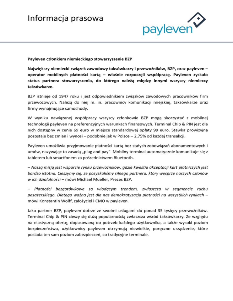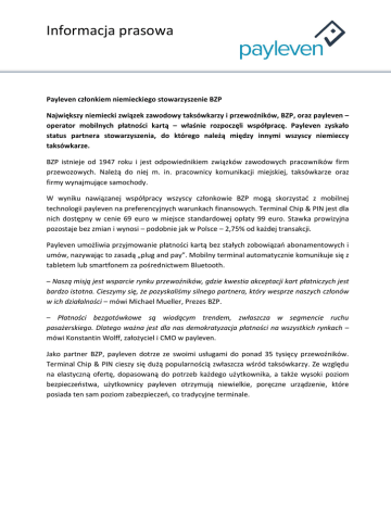 Informacja prasowa Payleven członkiem niemieckiego stowarzyszenie BZP Największy niemiecki związek zawodowy taksówkarzy i przewoźników, BZP, oraz payleven – operator mobilnych płatności kartą – właśnie rozpoczęli współpracę. Payleven zyskało status partnera stowarzyszenia, do którego należą między innymi wszyscy niemieccy taksówkarze. BZP istnieje od 1947 roku i jest odpowiednikiem związków zawodowych pracowników firm przewozowych. Należą do niej m. in. pracownicy komunikacji miejskiej, taksówkarze oraz firmy wynajmujące samochody. W wyniku nawiązanej współpracy wszyscy członkowie BZP mogą skorzystać z mobilnej technologii payleven na preferencyjnych warunkach finansowych. Terminal Chip & PIN jest dla nich dostępny w cenie 69 euro w miejsce standardowej opłaty 99 euro. Stawka prowizyjna pozostaje bez zmian i wynosi – podobnie jak w Polsce – 2,75% od każdej transakcji. Payleven umożliwia przyjmowanie płatności kartą bez stałych zobowiązań abonamentowych i umów, nazywając to zasadą „plug and pay”. Mobilny terminal automatycznie komunikuje się z tabletem lub smartfonem za pośrednictwem Bluetooth. – Naszą misją jest wsparcie rynku przewoźników, gdzie kwestia akceptacji kart płatniczych jest bardzo istotna. Cieszymy się, że pozyskaliśmy silnego partnera, który wesprze naszych członów w ich działalności – mówi Michael Mueller, Prezes BZP. – Płatności bezgotówkowe są wiodącym trendem, zwłaszcza w segmencie ruchu pasażerskiego. Dlatego ważna jest dla nas demokratyzacja płatności na wszystkich rynkach – mówi Konstantin Wolff, założyciel i CMO w payleven. Jako partner BZP, payleven dotrze ze swoimi usługami do ponad 35 tysięcy przewoźników. Terminal Chip & PIN cieszy się dużą popularnością zwłaszcza wśród taksówkarzy. Ze względu na elastyczną ofertę, dopasowaną do potrzeb każdego użytkownika, a także wysoki poziom bezpieczeństwa, użytkownicy payleven otrzymują niewielkie, poręczne urządzenie, które posiada ten sam poziom zabezpieczeń, co tradycyjne terminale.