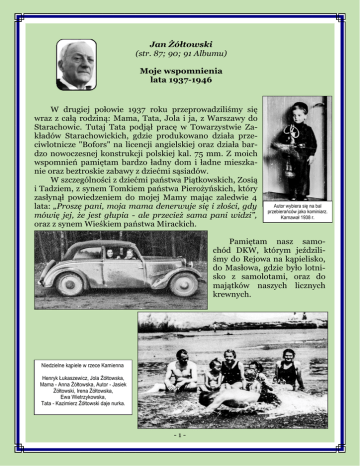 Jan Żółtowski (str. 87; 90; 91 Albumu) Moje wspomnienia lata 1937-1946 W drugiej połowie 1937 roku przeprowadziliśmy się wraz z całą rodziną: Mama, Tata, Jola i ja, z Warszawy do Starachowic. Tutaj Tata podjął pracę w Towarzystwie Zakładów Starachowickich, gdzie produkowano działa przeciwlotnicze "Bofors" na licencji angielskiej oraz działa bardzo nowoczesnej konstrukcji polskiej kal. 75 mm. Z moich wspomnień pamiętam bardzo ładny dom i ładne mieszkanie oraz beztroskie zabawy z dziećmi sąsiadów. W szczególności z dziećmi państwa Piątkowskich, Zosią i Tadziem, z synem Tomkiem państwa Pierożyńskich, który zasłynął powiedzeniem do mojej Mamy mając zaledwie 4 lata: „Proszę pani, moja mama denerwuje się i złości, gdy mówię jej, że jest głupia - ale przecież sama pani widzi”, oraz z synem Wieśkiem państwa Mirackich. Autor wybiera się na bal przebierańców jako kominiarz. Karnawał 1938 r. Pamiętam nasz samochód DKW, którym jeździliśmy do Rejowa na kąpielisko, do Masłowa, gdzie było lotnisko z samolotami, oraz do majątków naszych licznych krewnych. Niedzielne kąpiele w rzece Kamienna Henryk Łukaszewicz, Jola śółtowska, Mama - Anna śółtowska, Autor - Jasiek śółtowski, Irena śółtowska, Ewa Wietrzykowska, Tata - Kazimierz śółtowski daje nurka. -1- Pamiętam wyjazdy do majątku w Brzeziu z Ciocią Oleńką i jej córkami Ewą i Marysią i synami Wojtkiem i Włodkiem. Włodek był mało towarzyski, w przeciwieństwie do jego brata Wojtka. Odwiedzaliśmy majątek Usarzów z Babcią Marią, ciocią Wandą i synem Józefem. Był tam również pies Lord, którego bardzo się bałem, pomimo że był łagodny. Był większy ode mnie i skakał na mnie przy powitaniu. Majątek Rożki, gdzie panowała ciocia Hanna i Marian Rudzcy z trzema synami. Jeździliśmy również do Chwałowic, gdzie był wuj Zygmunt Zaleski z żoną Marią i córkami Krysią i Winią. Chwałowice były w pobliżu Iłży, gdzie PowyŜej - Brzezie; poniŜej - Usarzów chodziło się do kościoła lub jechało końmi. Pamiętam wyprawę do majątku Kanie (po drugiej stronie Wisły), gdzie władzę sprawowała ciocia Zonia. Zabudowa, która był już chyba pałacem, a nie typowym dworem. Był to jedyny majątek, który pamiętam z czasów przedwojennych, gdzie było światło elektryczne i łazienka z wodą bieżącą. Pamiętam też wyjazd do Trzyciąża, gdzie wuj Stefan Targowski był dyrektorem Szkoły Rolniczej. Tam też poznałem moje cioteczne rodzeństwo, Basię i Krzyśka. Był to chyba rok 1938. Po raz drugi odwiedziłem Trzyciąż w 2001 roku. O dziwo, bardzo dobrze zapamiętałem te miejsca, gdzie wtedy chodziłem i gdzie byłem. Przede wszystkim dom Wujostwa, który stał teraz pusty, przeznaczony do rozbiórki. Zaglądałem przez okna. Widziałem salon i miejsce, gdzie stał fortepian, gdzie była kuchnia i okno od pokoju, w którym spałem. Obok Trzyciąża jest Zadroże, gdzie jest kościół, w którym proboszczem był wuj Wacek Jabłoński. Do kościoła było ok. 3 km. Dla mnie było udręką forsowanie tego dystansu. Pociechą było to, że po mszy szło się gromadnie do wuja na pleKanie - ciocia Zonia i wujek Staszek banie na herbatę z szarlotką. Niewątpliwie ten czas mojego życia do II Wojny Światowej jest w mojej pamięci piękną, niczym nie zmąconą sielanką. W 1939 roku mieliśmy w sierpniu jechać nad morze do Orłowa. Tuż przed wyjazdem usłyszałem, jak ojciec powiedział głośno, że nie pojedziemy, bo psuje się pogoda. Sens i znaczenie tego zdania zrozumiałem oczywiście znacznie później. -2- Tymczasem wybuchła wojna. Atmosfera w domu była nerwowa, liczne rozmowy i narady. Tata zawiózł nas do Brzezia, tzn. Mamę, Jolę i mnie. Byliśmy tam parę dni. A kiedy zdecydowano ewakuować Zakłady Starachowickie na wschód, do Kowla, gdzie miała być kontynuowana produkcja armat, Rodzice postanowili nie rozstawać się i wszyscy pojechaliśmy naszym samochodem. Oczywiście nic nie wiedziałem i nic nie rozumiałem, ale, jak pamiętam, szybko zauważyłem, że nie jedziemy sami, ale w kolumnie samochodów, które należały do pracowników zakładu. Za nami jechał autobus, też z pracownikami, a w nim nasza kuzynka Irka Żółtowska, która akurat była u nas w Starachowicach. Zostawiliśmy mieszkanie, w którym została nasza pomoc domowa, Zosia Granatówna, i dwa ciemnobrązowe jamniki, Cis i Markiz. Dowiedziałem się też, że jedziemy do miasta Kowel, gdzie miały być dalej produkowane armaty. Nazwa tego miasta była mi zupełnie obca. Pamiętam, że pogoda była przez cały czas słoneczna. Po drodze przejeżdżaliśmy przez Wisłę mostem w Annopolu. Most był ogromny, ale cały drewniany. Na moście stali żołnierze z kanistrami z benzyną. Mieli oni podpalić most, jak nasza kolumna przejedzie. Czekali na nas, tak mówił wtedy Tata. Nie mogłem pojąć, taki piękny most, a na nim tacy smutni żołnierze. Zawsze widziałem wesołych żołnierzy. Dalej jadąc wstąpiliśmy do Kaniego do cioci Zoni. Zastaliśmy tam pełno ludzi, uciekinierów. Były kłopoty ze spaniem. Wyjechaliśmy następnego dnia. W czasie dalszej drogi wielokrotnie wysiadaliśmy z samochodu w pośpiechu i musieliśmy kłaść się w rowach, bo leciały niemieckie samoloty. Nie widziałem ich, ale je słyszałem. Następnym wydarzeniem, które pamiętam, to był długi postój na jakimś skrzyżowaniu. Panowie z naszej kolumny, gdzieś chodzili, rozmawiali, stali w grupkach. Dopiero parę lat później dowiedziałem się, że staliśmy wtedy na skrzyżowaniu ze słynna Szosą Zaleszczycką. Tam podejmowano decyzję, gdzie mamy jechać, czy nadal do Kowla czy do Rumuni. Zwyciężył patriotyzm i pojechaliśmy do Kowla. Biegu dalszych wydarzeń prawdopodobnie nikt się nie spodziewał. Nastąpiło spotkanie z Armią Czerwoną. Chyba to było tuż przed Kowlem. Oczywiście wszystkich aresztowano, oddzielono mężczyzn od kobiet. Znaleźli