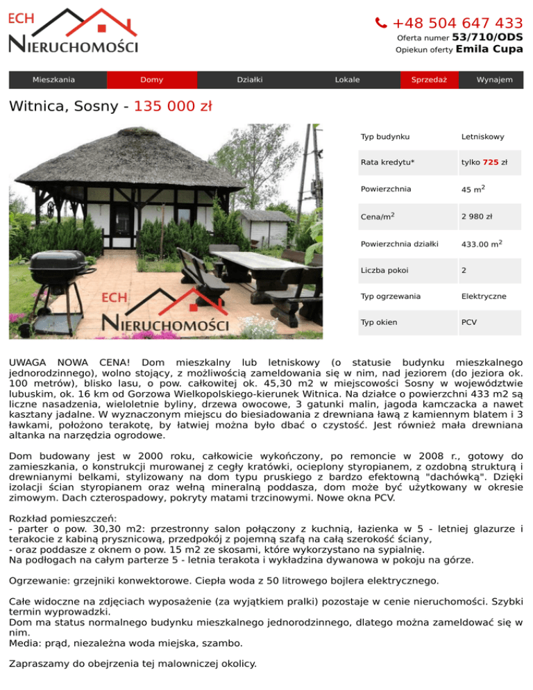 +48504647433 Ofertanumer53/710/ODS OpiekunofertyEmilaCupa Mieszkania Domy Działki Lokale Sprzedaż Wynajem Witnica,Sosny-135000zł Typbudynku Letniskowy Ratakredytu* tylko725zł Powierzchnia 45m2 Cena/m2 2980zł Powierzchniadziałki 433.00m2 Liczbapokoi 2 Typogrzewania Elektryczne Typokien PCV UWAGA NOWA CENA! Dom mieszkalny lub letniskowy (o statusie budynku mieszkalnego jednorodzinnego), wolno stojący, z możliwością zameldowania się w nim, nad jeziorem (do jeziora ok. 100 metrów), blisko lasu, o pow. całkowitej ok. 45,30 m2 w miejscowości Sosny w województwie lubuskim,ok.16kmodGorzowaWielkopolskiego-kierunekWitnica.Nadziałceopowierzchni433m2są liczne nasadzenia, wieloletnie byliny, drzewa owocowe, 3 gatunki malin, jagoda kamczacka a nawet kasztanyjadalne.Wwyznaczonymmiejscudobiesiadowaniazdrewnianaławązkamiennymblatemi3 ławkami, położono terakotę, by łatwiej można było dbać o czystość. Jest również mała drewniana altankananarzędziaogrodowe. Dom budowany jest w 2000 roku, całkowicie wykończony, po remoncie w 2008 r., gotowy do zamieszkania,okonstrukcjimurowanejzcegłykratówki,ocieplonystyropianem,zozdobnąstrukturąi drewnianymi belkami, stylizowany na dom typu pruskiego z bardzo efektowną "dachówką". Dzięki izolacji ścian styropianem oraz wełną mineralną poddasza, dom może być użytkowany w okresie zimowym.Dachczterospadowy,pokrytymatamitrzcinowymi.NoweoknaPCV. Rozkładpomieszczeń: - parter o pow. 30,30 m2: przestronny salon połączony z kuchnią, łazienka w 5 - letniej glazurze i terakociezkabinąprysznicową,przedpokójzpojemnąszafąnacałąszerokośćściany, -orazpoddaszezoknemopow.15m2zeskosami,którewykorzystanonasypialnię. Napodłogachnacałymparterze5-letniaterakotaiwykładzinadywanowawpokojunagórze. Ogrzewanie:grzejnikikonwektorowe.Ciepławodaz50litrowegobojleraelektrycznego. Całewidocznenazdjęciachwyposażenie(zawyjątkiempralki)pozostajewcenienieruchomości.Szybki terminwyprowadzki. Dommastatusnormalnegobudynkumieszkalnegojednorodzinnego,dlategomożnazameldowaćsięw nim. Media:prąd,niezależnawodamiejska,szambo. Zapraszamydoobejrzeniatejmalowniczejokolicy. NOWANIŻSZACENA:135.000ZŁ ul.MieszkaI-go2/3,66-400GorzówWlkp.,telefon:+48504647443,e-mail:[email protected]