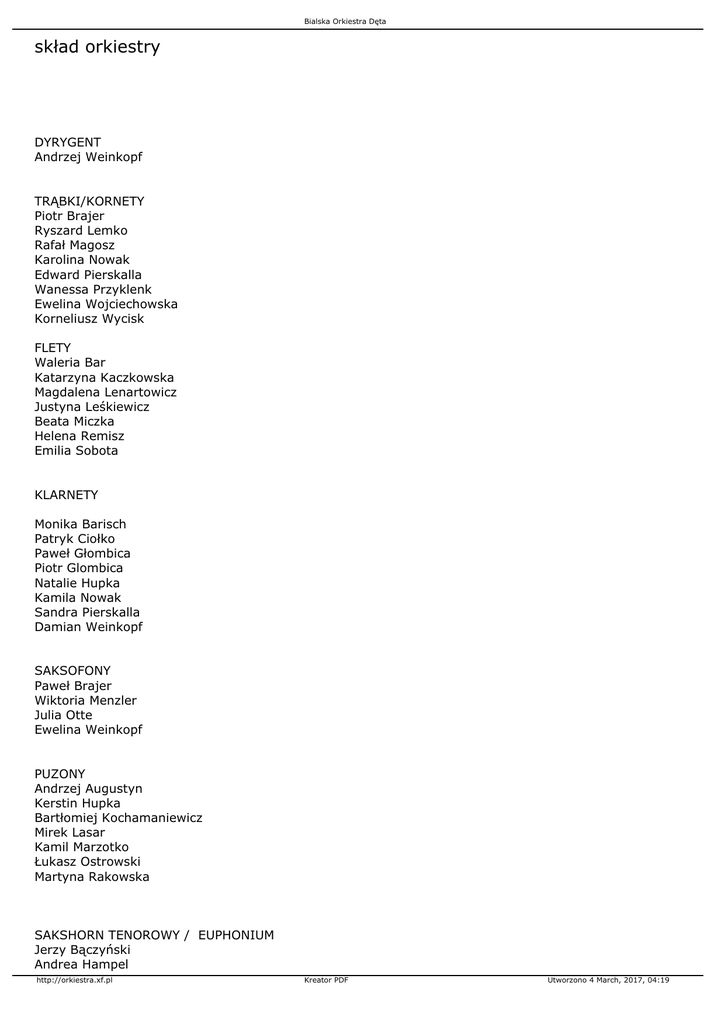 Bialska Orkiestra Dęta skład orkiestry DYRYGENT Andrzej Weinkopf TRĄBKI/KORNETY Piotr Brajer Ryszard Lemko Rafał Magosz Karolina Nowak Edward Pierskalla Wanessa Przyklenk Ewelina Wojciechowska Korneliusz Wycisk FLETY Waleria Bar Katarzyna Kaczkowska Magdalena Lenartowicz Justyna Leśkiewicz Beata Miczka Helena Remisz Emilia Sobota KLARNETY Monika Barisch Patryk Ciołko Paweł Głombica Piotr Glombica Natalie Hupka Kamila Nowak Sandra Pierskalla Damian Weinkopf SAKSOFONY Paweł Brajer Wiktoria Menzler Julia Otte Ewelina Weinkopf PUZONY Andrzej Augustyn Kerstin Hupka Bartłomiej Kochamaniewicz Mirek Lasar Kamil Marzotko Łukasz Ostrowski Martyna Rakowska SAKSHORN TENOROWY / EUPHONIUM Jerzy Bączyński Andrea Hampel http://orkiestra.xf.pl Kreator PDF Utworzono 4 March, 2017, 04:19 Bialska Orkiestra Dęta Roland Hampel Karolina Sławek BAS / TUBY Josef Goretzka Mateusz Puchalla Olaf Scholz PERKUSJA / INSTRUMENTY PERKUSYJNE Jakub Osiecki do grona stałych członków zespołu przygotowują się: 1. Enrika Hupka - flet 2. Emilia Wilde - trąbka http://orkiestra.xf.pl Kreator PDF Utworzono 4 March, 2017, 04:19
