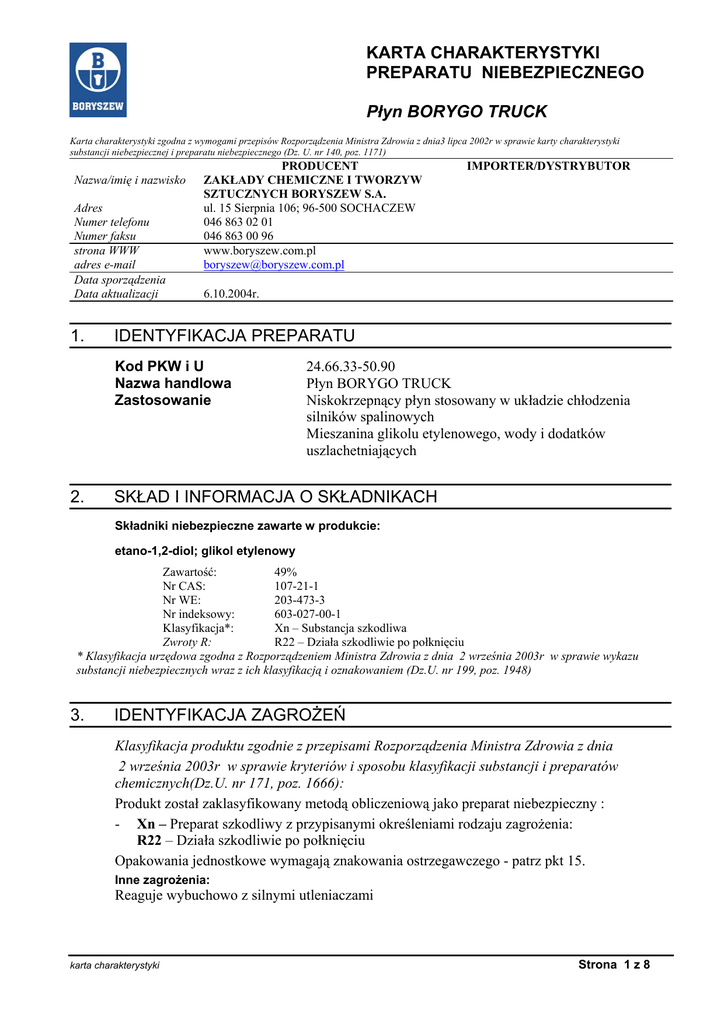 KARTA CHARAKTERYSTYKI PREPARATU NIEBEZPIECZNEGO Płyn BORYGO TRUCK Karta charakterystyki zgodna z wymogami przepisów Rozporządzenia Ministra Zdrowia z dnia3 lipca 2002r w sprawie karty charakterystyki substancji niebezpiecznej i preparatu niebezpiecznego (Dz. U. nr 140, poz. 1171) Nazwa/imię i nazwisko Adres Numer telefonu Numer faksu strona WWW adres e-mail Data sporządzenia Data aktualizacji 1. PRODUCENT ZAKŁADY CHEMICZNE I TWORZYW SZTUCZNYCH BORYSZEW S.A. ul. 15 Sierpnia 106; 96-500 SOCHACZEW 046 863 02 01 046 863 00 96 www.boryszew.com.pl [email protected] 6.10.2004r. IDENTYFIKACJA PREPARATU Kod PKW i U Nazwa handlowa Zastosowanie 2. IMPORTER/DYSTRYBUTOR 24.66.33-50.90 Płyn BORYGO TRUCK Niskokrzepnący płyn stosowany w układzie chłodzenia silników spalinowych Mieszanina glikolu etylenowego, wody i dodatków uszlachetniających SKŁAD I INFORMACJA O SKŁADNIKACH Składniki niebezpieczne zawarte w produkcie: etano-1,2-diol; glikol etylenowy Zawartość: 49% Nr CAS: 107-21-1 Nr WE: 203-473-3 Nr indeksowy: 603-027-00-1 Klasyfikacja*: Xn – Substancja szkodliwa Zwroty R: R22 – Działa szkodliwie po połknięciu * Klasyfikacja urzędowa zgodna z Rozporządzeniem Ministra Zdrowia z dnia 2 września 2003r w sprawie wykazu substancji niebezpiecznych wraz z ich klasyfikacją i oznakowaniem (Dz.U. nr 199, poz. 1948) 3. IDENTYFIKACJA ZAGROŻEŃ Klasyfikacja produktu zgodnie z przepisami Rozporządzenia Ministra Zdrowia z dnia 2 września 2003r w sprawie kryteriów i sposobu klasyfikacji substancji i preparatów chemicznych(Dz.U. nr 171, poz. 1666): Produkt został zaklasyfikowany metodą obliczeniową jako preparat niebezpieczny : - Xn – Preparat szkodliwy z przypisanymi określeniami rodzaju zagrożenia: R22 – Działa szkodliwie po połknięciu Opakowania jednostkowe wymagają znakowania ostrzegawczego - patrz pkt 15. Inne zagrożenia: Reaguje wybuchowo z silnymi utleniaczami karta charakterystyki Strona 1 z 8 KARTA CHARAKTERYSTYKI PREPARATU NIEBEZPIECZNEGO Płyn BORYGO TRUCK 4. PIERWSZA POMOC Objawy zatrucia Glikol etylenowy ma działanie narkotyczne. Powoduje uszkodzenie ośrodkowego układu nerwowego. Pierwsze objawy podobne są do upojenia alkoholowego. Bóle i zawroty głowy, uczucie upojenia, senność, objawy podrażnienia przewodu pokarmowego, wymioty i biegunka. W ciężkich przypadkach - utrata przytomności, brak reakcji źrenic na światło, przyspieszenie oddechu i tętna. Zawsze występuje kwasica metaboliczna. Uwagi ogólne W przypadku wystąpienia jakichkolwiek dolegliwości wezwać niezwłocznie lekarza lub przetransportować poszkodowanego do szpitala. Pokazać lekarzowi opakowanie lub etykietę Wdychanie Wynieść/wyprowadzić poszkodowanego ze strefy narażenia. Ułożyć w pozycji półsiedzącej. Zapewnić spokój i warunki do odpoczynku. Zwrócić się o pomoc medyczną Skóra Zdjąć skażoną odzież. Umyć skórę dużą ilością wody z mydłem. W przypadku utrzymywania się objawów podrażnienia zwrócić się o pomoc medyczną Oczy Upewnić się czy poszkodowany nie nosi szkieł kontaktowych. Natychmiast płukać oczy, przytrzymując odchylone powieki, dużą ilością czystej bieżącej wody. Płukać przez co najmniej 15 minut. W razie utrzymywania się dolegliwości (podrażnienia) zwrócić się o pomoc do lekarza okulisty Połknięcie Pod nadzorem sprowokować wymioty. Podać do wypicia alkohol etylowy (100 g wódki). Zwrócić się o pomoc medyczną 5. POSTĘPOWANIE W PRZYPADKU POŻARU Zalecane środki gaśnicze: CO2, proszki gaśnicze, piany gaśnicze, mgła wodna Nieodpowiednie środki gaśnicze: Zwarte strumienie wody podawane pod ciśnieniem Szczególne zagrożenie ze strony produktów spalania i wydzielających się gazów: W trakcie pożaru mogą wydzielać się produkty rozkładu glikolu (aldehyd octowy). Specjalne wyposażenie ochronne strażaków: Nosić izolacyjne aparaty oddechowe z niezależnym źródłem powietrza i kombinezony ochronne. Inne uwagi: Usunąć ze strefy pożaru wszystkie osoby postronne Pojemniki zagrożone pożarem chłodzić rozpyloną wodą i w miarę możliwości ewakuować je z zagrożonego rejonu Nie dopuszczać do przedostawania się skażonej wody i innych środków gaśniczych do systemu kanalizacyjnego karta charakterystyki Strona 2 z 8 KARTA CHARAKTERYSTYKI PREPARATU NIEBEZPIECZNEGO Płyn BORYGO TRUCK 6. POSTĘPOWANIE W PRZYPADKU NIEZAMIERZONEGO UWOLNIENIA DO ŚRODOWISKA Indywidualne środki ostrożności: Zapewnić odpowiednią wentylację. Nosić osobiste środki ochrony. Środki ostrożności w zakresie ochrony środowiska: Powstrzymać wyciek. Usunąć wszystkie źródła zapłonu. Nie dopuszczać do przedostawania się produktu do kanalizacji (zabezpieczyć studzienki kanalizacyjne), wód powierzchniowych i wód gruntowych. W przypadku uwolnienia dużych ilości produktu lub skażenia środowiska powiadomić odpowiednie władze i służby ratownictwa chemicznego. Metody oczyszczania/usuwania: Duże ilości uwolnionego produktu obwałować i przepompować do oznakowanych pojemników. Niewielkie ilości przesypać niepalnym materiałem pochłaniającym i zebrać do oznakowanego, szczelnie zamykanego pojemnika na odpady. Miejsce wycieku spłukać wodą. Uszkodzone opakowania umieścić w pojemniku na odpady. Usuwać zgodnie z zaleceniami przedstawionymi w punkcie 13. 7. POSTĘPOWANIE Z PREPARATEM I JEGO MAGAZYNOWANIE Postępowanie z preparatem Przestrzegać zasad i przepisów BHP dotyczących pracy z chemikaliami. Stosować w odpowiednio wentylowanym miejscu Nosić odpowiednią odzież ochronną Podczas stosowania nie jeść, nie pić i nie palić tytoniu Unikać kontaktu z ogniem i źródłami zapłonu Magazynowanie Przechowywać w szczelnie zamkniętych, odpowiednio oznakowanych pojemnikach polietylenowych. Przechowywać w miejscu odpowiednio wentylowanym W miejscu magazynowania produktu wprowadzić zakaz palenia tytoniu, używania otwartego ognia i spożywania posiłków. Rozlany produkt stwarza nie