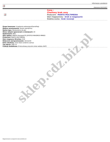 Informacje o produkcie Utworzono 04-03-2017 Cena : Chwilowy brak ceny sk le p .c iz .p dz .b Grupa towarowa: Urządzenia wskazujące\GamePady Miejsce serwisowania: Serwis zewnętrzny Nazwa typu: Manipulatory do gier Okres rękojmi (gwarancji) w miesiącach: 24 Opakowanie: BOX Opis ogólny: MANTA Gamepad PC JOYSTICK MAVERICK MM603 Producent: MANTA MULTIMEDIA Stan magazynu Wrocław: 0.00 Dołączone oprogramowanie: sterowniki Kolor obudowy: silver-black (srebrno-czarny) Typ złącza: USB 2.0 Funkcje dodatkowe: 8 kierunkowy przycisk zmian widoku (HAT) l Producent : MANTA MULTIMEDIA Stan magazynowy : brak w magazynie Średnia ocena : brak recenzji Wygenerowano w programie www.oscGold.com