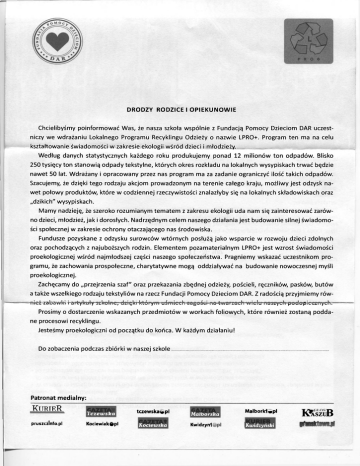 DRODZY RODZICE I OPIEKUNOWIE Chcielibyśmy poinformować Was, że nasza szkoła wspólnie z Fundacją Pomocy Dzieciom DAR uczestniczy we wdrażaniu Lokalnego Programu Recyklingu Odzieży o nazwie LPRO+. Program ten ma na celu kształtowanie świadomości w zakresie ekologii wśród dzieci i młodzieży. Według danych statystycznych każdego roku produkujemy ponad 12 milionów ton odpadów. Blisko 250 tysięcy ton stanowią odpady tekstylne, których okres rozkładu na lokalnych wysypiskach trwać będzie nawet 50 lat. Wdrażany i opracowany przez nas program ma za zadanie ograniczyć ilość takich odpadów. Szacujemy, że dzięki tego rodzaju akcjom prowadzonym na terenie całego kraju, możliwy jest odzysk nawet połowy produktów, które w codziennej rzeczywistości znalazłyby się na lokalnych składowiskach oraz „dzikich" wysypiskach. Mamy nadzieję, że szeroko rozumianym tematem z zakresu ekologii uda nam się zainteresować zarówno dzieci, młodzież, jak i dorosłych. Nadrzędnym celem naszego działania jest budowanie silnej świadomości społecznej w zakresie ochrony otaczającego nas środowiska. Fundusze pozyskane z odzysku surowców wtórnych posłużą jako wsparcie w rozwoju dzieci zdolnych oraz pochodzących z najuboższych rodzin. Elementem pozamaterialnym LPRO+ jest wzrost świadomości proekologicznej wśród najmłodszej części naszego społeczeństwa. Pragniemy wskazać uczestnikom programu, że zachowania prospołeczne, charytatywne mogą oddziaływać na budowanie nowoczesnej myśli proekologicznej. Zachęcamy do „przejrzenia szaf" oraz przekazania zbędnej odzieży, pościeli, ręczników, pasków, butów a także wszelkiego rodzaju tekstyliów na rzecz Fundacji Pomocy Dzieciom DAR. Z radością przyjmiemy również zabawki i artykttły^kokrercteiękrteórym uśmiech gegości na twarzach wielu naszych podopicegnych. Prosimy o dostarczenie wskazanych przedmiotów w workach foliowych, które również zostaną poddane procesowi recyklingu. Jesteśmy proekologiczni od początku do końca. W każdym działaniu! Do zobaczenia podczas zbiórki w naszej szkole Patronat medialny: KITRTF/R pruszczinfo.pl tczewskaw.pl Tczewska Kociewiak pl Kociewska Malborska Kwidzynl Malborki ^pl Kwidzyński K&szuB DRODZY RODZICE I OPIEKUNOWIE Chcielibyśmy poinformować Was, że nasza szkoła wspólnie z Fundacją Pomocy Dzieciom DAR uczestniczy we wdrażaniu Lokalnego Programu Recyklingu Odzieży o nazwie LPRO+. Program ten ma na celu kształtowanie świadomości w zakresie ekologii wśród dzieci i młodzieży. Według danych statystycznych każdego roku produkujemy ponad 12 milionów ton odpadów. Blisko 250 tysięcy ton stanowią odpady tekstylne, których okres rozkładu na lokalnych wysypiskach trwać będzie nawet 50 lat. Wdrażany i opracowany przez nas program ma za zadanie ograniczyć ilość takich odpadów. Szacujemy, że dzięki tego rodzaju akcjom prowadzonym na terenie całego kraju, możliwy jest odzysk nawet połowy produktów, które w codziennej rzeczywistości znalazłyby się na lokalnych składowiskach oraz „dzikich" wysypiskach. Mamy nadzieję, że szeroko rozumianym tematem z zakresu ekologii uda nam się zainteresować zarówno dzieci, młodzież, jak i dorosłych. Nadrzędnym celem naszego działania jest budowanie silnej świadomości społecznej w zakresie ochrony otaczającego nas środowiska. Fundusze pozyskane z odzysku surowców wtórnych posłużą jako wsparcie w rozwoju dzieci zdolnych oraz pochodzących z najuboższych rodzin. Elementem pozamaterialnym LPRO+ jest wzrost świadomości proekologicznej wśród najmłodszej części naszego społeczeństwa. Pragniemy wskazać uczestnikom programu, że zachowania prospołeczne, charytatywne mogą oddziaływać na budowanie nowoczesnej myśli proekologicznej. Zachęcamy do „przejrzenia szaf" oraz przekazania zbędnej odzieży, pościeli, ręczników, pasków, butów a także wszelkiego rodzaju tekstyliów na rzecz Fundacji Pomocy Dzieciom DAR. Z radością przyjmiemy rów•fite-ż zabawki i artyktłły^kołfWTtktękfktóryfyi-iiśmieeh gegooci na twarzach wielu nasgyeh podopieegnyeh. Prosimy o dostarczenie wskazanych przedmiotów w workach foliowych, które również zostaną poddane procesowi recyklingu. Jesteśmy proekologiczni od początku do końca. W każdym działaniu! Do zobaczenia podczas zbiórki w naszej szkole Patronat medialny: KYRORAR Tczewska pruszczinfo.pl Kociewiak«fpl tczewska „pl Kociewska Malborki <«pl Malborska Kwidzynl pl Kwidzyński K&szuB