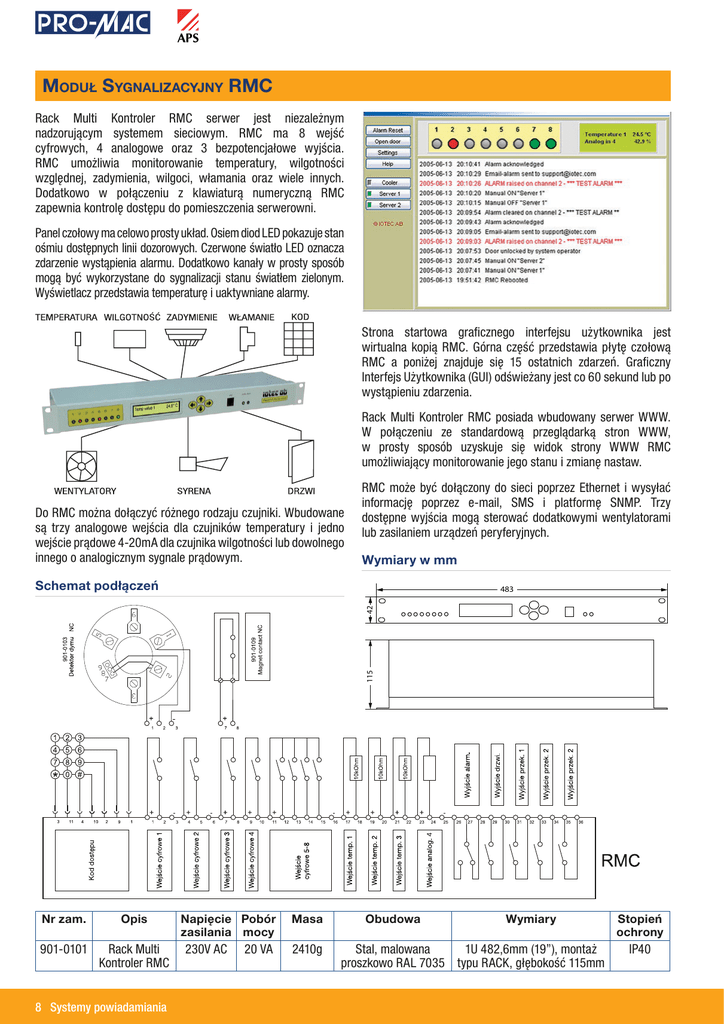 Moduł Sygnalizacyjny RMC Rack Multi Kontroler RMC serwer jest niezależnym nadzorującym systemem sieciowym. RMC ma 8 wejść cyfrowych, 4 analogowe oraz 3 bezpotencjałowe wyjścia. RMC umożliwia monitorowanie temperatury, wilgotności względnej, zadymienia, wilgoci, włamania oraz wiele innych. Dodatkowo w połączeniu z klawiaturą numeryczną RMC zapewnia kontrolę dostępu do pomieszczenia serwerowni. Panel czołowy ma celowo prosty układ. Osiem diod LED pokazuje stan ośmiu dostępnych linii dozorowych. Czerwone światło LED oznacza zdarzenie wystąpienia alarmu. Dodatkowo kanały w prosty sposób mogą być wykorzystane do sygnalizacji stanu światłem zielonym. Wyświetlacz przedstawia temperaturę i uaktywniane alarmy. Strona startowa graficznego interfejsu użytkownika jest wirtualna kopią RMC. Górna część przedstawia płytę czołową RMC a poniżej znajduje się 15 ostatnich zdarzeń. Graficzny Interfejs Użytkownika (GUI) odświeżany jest co 60 sekund lub po wystąpieniu zdarzenia. Rack Multi Kontroler RMC posiada wbudowany serwer WWW. W połączeniu ze standardową przeglądarką stron WWW, w prosty sposób uzyskuje się widok strony WWW RMC umożliwiający monitorowanie jego stanu i zmianę nastaw. Do RMC można dołączyć różnego rodzaju czujniki. Wbudowane są trzy analogowe wejścia dla czujników temperatury i jedno wejście prądowe 4-20mA dla czujnika wilgotności lub dowolnego innego o analogicznym sygnale prądowym. RMC może być dołączony do sieci poprzez Ethernet i wysyłać informację poprzez e-mail, SMS i platformę SNMP. Trzy dostępne wyjścia mogą sterować dodatkowymi wentylatorami lub zasilaniem urządzeń peryferyjnych. Wymiary w mm Schemat podłączeń 115 42 483 Nr zam. Opis 901-0101 Rack Multi Kontroler RMC 8 Systemy powiadamiania Napięcie Pobór zasilania mocy 230V AC 20 VA Masa 2410g Obudowa Wymiary Stal, malowana 1U 482,6mm (19”), montaż proszkowo RAL 7035 typu RACK, głębokość 115mm Stopień ochrony IP40