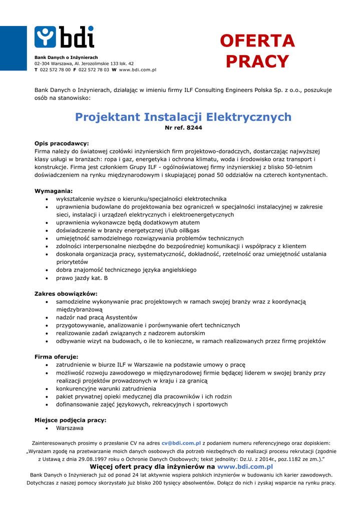 OFERTA PRACY Bank Danych o Inżynierach 02-304 Warszawa, Al. Jerozolimskie 133 lok. 42 T 022 572 78 00 F 022 572 78 03 W www.bdi.com.pl Bank Danych o Inżynierach, działając w imieniu firmy ILF Consulting Engineers Polska Sp. z o.o., poszukuje osób na stanowisko: Projektant Instalacji Elektrycznych Nr ref. 8244 Opis pracodawcy: Firma należy do światowej czołówki inżynierskich firm projektowo-doradczych, dostarczając najwyższej klasy usługi w branżach: ropa i gaz, energetyka i ochrona klimatu, woda i środowisko oraz transport i konstrukcje. Firma jest członkiem Grupy ILF - ogólnoświatowej firmy inżynierskiej z blisko 50-letnim doświadczeniem na rynku międzynarodowym i skupiającej ponad 50 oddziałów na czterech kontynentach. Wymagania: wykształcenie wyższe o kierunku/specjalności elektrotechnika uprawnienia budowlane do projektowania bez ograniczeń w specjalności instalacyjnej w zakresie sieci, instalacji i urządzeń elektrycznych i elektroenergetycznych uprawnienia wykonawcze będą dodatkowym atutem doświadczenie w branży energetycznej i/lub oil&gas umiejętność samodzielnego rozwiązywania problemów technicznych zdolności interpersonalne niezbędne do bezpośredniej komunikacji i współpracy z klientem doskonała organizacja pracy, systematyczność, dokładność, rzetelność oraz umiejętność ustalania priorytetów dobra znajomość technicznego języka angielskiego prawo jazdy kat. B Zakres obowiązków: samodzielne wykonywanie prac projektowych w ramach swojej branży wraz z koordynacją międzybranżową nadzór nad pracą Asystentów przygotowywanie, analizowanie i porównywanie ofert technicznych realizowanie zadań związanych z nadzorem autorskim odbywanie wizyt na budowach, o ile to konieczne, w ramach realizowanych przez firmę projektów Firma oferuje: zatrudnienie w biurze ILF w Warszawie na podstawie umowy o pracę możliwość rozwoju zawodowego w międzynarodowej firmie będącej liderem w swojej branży przy realizacji projektów prowadzonych w kraju i za granicą konkurencyjne warunki zatrudnienia pakiet prywatnej opieki medycznej dla pracowników i ich rodzin dofinansowanie zajęć językowych, rekreacyjnych i sportowych Miejsce podjęcia pracy: Warszawa Zainteresowanych prosimy o przesłanie CV na adres [email protected] z podaniem numeru referencyjnego oraz dopiskiem: „Wyrażam zgodę na przetwarzanie moich danych osobowych dla potrzeb niezbędnych do realizacji procesu rekrutacji (zgodnie z Ustawą z dnia 29.08.1997 roku o Ochronie Danych Osobowych; tekst jednolity: Dz.U. z 2014r., poz.1182 ze zm.).” Więcej ofert pracy dla inżynierów na www.bdi.com.pl Bank Danych o Inżynierach już od ponad 24 lat aktywnie wspiera polskich inżynierów w budowaniu ich karier zawodowych. Dotychczas z naszej pomocy skorzystało już blisko 200 tysięcy absolwentów. Dołącz do nich i zyskaj wsparcie na rynku pracy.