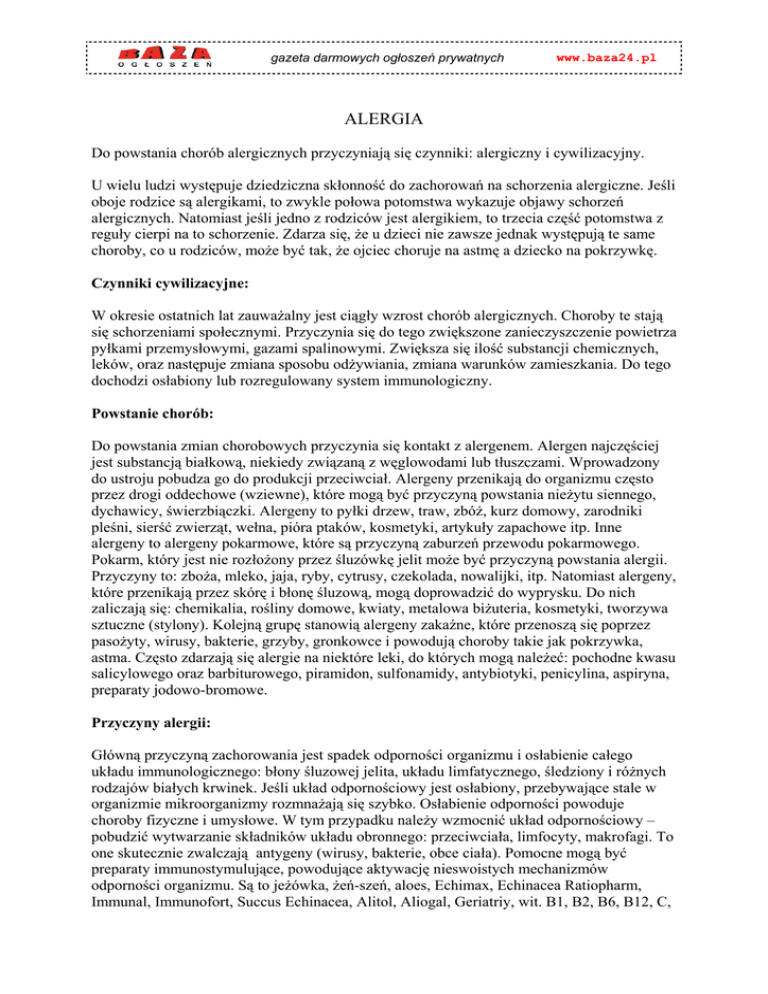 gazeta darmowych ogłoszeń prywatnych www.baza24.pl ALERGIA Do powstania chorób alergicznych przyczyniają się czynniki: alergiczny i cywilizacyjny. U wielu ludzi występuje dziedziczna skłonność do zachorowań na schorzenia alergiczne. Jeśli oboje rodzice są alergikami, to zwykle połowa potomstwa wykazuje objawy schorzeń alergicznych. Natomiast jeśli jedno z rodziców jest alergikiem, to trzecia część potomstwa z reguły cierpi na to schorzenie. Zdarza się, że u dzieci nie zawsze jednak występują te same choroby, co u rodziców, może być tak, że ojciec choruje na astmę a dziecko na pokrzywkę. Czynniki cywilizacyjne: W okresie ostatnich lat zauważalny jest ciągły wzrost chorób alergicznych. Choroby te stają się schorzeniami społecznymi. Przyczynia się do tego zwiększone zanieczyszczenie powietrza pyłkami przemysłowymi, gazami spalinowymi. Zwiększa się ilość substancji chemicznych, leków, oraz następuje zmiana sposobu odżywiania, zmiana warunków zamieszkania. Do tego dochodzi osłabiony lub rozregulowany system immunologiczny. Powstanie chorób: Do powstania zmian chorobowych przyczynia się kontakt z alergenem. Alergen najczęściej jest substancją białkową, niekiedy związaną z węglowodami lub tłuszczami. Wprowadzony do ustroju pobudza go do produkcji przeciwciał. Alergeny przenikają do organizmu często przez drogi oddechowe (wziewne), które mogą być przyczyną powstania nieżytu siennego, dychawicy, świerzbiączki. Alergeny to pyłki drzew, traw, zbóż, kurz domowy, zarodniki pleśni, sierść zwierząt, wełna, pióra ptaków, kosmetyki, artykuły zapachowe itp. Inne alergeny to alergeny pokarmowe, które są przyczyną zaburzeń przewodu pokarmowego. Pokarm, który jest nie rozłożony przez śluzówkę jelit może być przyczyną powstania alergii. Przyczyny to: zboża, mleko, jaja, ryby, cytrusy, czekolada, nowalijki, itp. Natomiast alergeny, które przenikają przez skórę i błonę śluzową, mogą doprowadzić do wyprysku. Do nich zaliczają się: chemikalia, rośliny domowe, kwiaty, metalowa biżuteria, kosmetyki, tworzywa sztuczne (stylony). Kolejną grupę stanowią alergeny zakaźne, które przenoszą się poprzez pasożyty, wirusy, bakterie, grzyby, gronkowce i powodują choroby takie jak pokrzywka, astma. Często zdarzają się alergie na niektóre leki, do których mogą należeć: pochodne kwasu salicylowego oraz barbiturowego, piramidon, sulfonamidy, antybiotyki, penicylina, aspiryna, preparaty jodowo-bromowe. Przyczyny alergii: Główną przyczyną zachorowania jest spadek odporności organizmu i osłabienie całego układu immunologicznego: błony śluzowej jelita, układu limfatycznego, śledziony i różnych rodzajów białych krwinek. Jeśli układ odpornościowy jest osłabiony, przebywające stale w organizmie mikroorganizmy rozmnażają się szybko. Osłabienie odporności powoduje choroby fizyczne i umysłowe. W tym przypadku należy wzmocnić układ odpornościowy – pobudzić wytwarzanie składników układu obronnego: przeciwciała, limfocyty, makrofagi. To one skutecznie zwalczają antygeny (wirusy, bakterie, obce ciała). Pomocne mogą być preparaty immunostymulujące, powodujące aktywację nieswoistych mechanizmów odporności organizmu. Są to jeżówka, żeń-szeń, aloes, Echimax, Echinacea Ratiopharm, Immunal, Immunofort, Succus Echinacea, Alitol, Aliogal, Geriatriy, wit. B1, B2, B6, B12, C, gazeta darmowych ogłoszeń prywatnych www.baza24.pl F, kwas foliowy, węglan wapnia, wodorowęglan potasu, węglan magnezu, miedź, fosfor, cynk, lecytyna. Zaleca się także leczenie poprzez właściwe odżywianie. Aby odżywić osłabioną błonę śluzową należy spożywać ciepłe, gotowane warzywa (kalarepa, marchew, seler, por, brokuł, buraki, szparagi). Substancjami odżywczymi dla zdrowia są: cynk (kukurydza, buraki, warzywa strączkowe, cebula, soja, szpinak, ziemniaki, kapusta), witamina C (surowe owoce). W celu polepszenia ukrwienia śledziony oraz wzmocnienia przepływu limfy należy spożywać rzodkiew, czosnek i cebulę. Warto zażywać tran, olej z rekina – preparaty pobudzające układ odpornościowy (bogate w alkiloglicerole). Zalecana jest dieta bez wędlin, wędzonego mięsa i ryb, wieprzowiny i jej przetworów, owoców południowych. Przykładowe przepisy, które pomogą uchronić nas przed alergią i jej skutkiem. 1. Pić pokrzywę (1 łyżeczka pokrzywy na szklankę wrzątku, naparzać 10 min., przecedzić i dodać ziół szwedzkich 1 łyżeczkę), pić 2-4 szklanki dziennie. 2. 60g kapusty gotowanej gotować w 1/2l wody przez godzinę. Pod koniec gotowania dodać 60g miodu. Pić 2 szklanki dziennie. 3. Pić sok z rzepy (źródło wapnia) i z liści. 4. Pić sok z marchwi (75ml), z mniszka (75ml), z rzepy (100ml). 5. Zioła do picia: 50g pokrzywy, 40g wiązówki błotnej, po 30g glistnika, przetacznika, nagietka, kory wierzby, 20g dymnicy, 10g kory dębu (zmieszać). Łyżeczka na szklankę wrzątku, krótko zagotować, przecedzić, pić łykami do 2 litrów dziennie. Poprawić samopoczucie można przez ruch, ćwiczenia, biegi, jazdę na rowerze, pływanie. Wskazane są zabiegi kręgarskie – manualne oraz masaż ciała, który pobudza układ limfatyczny i samopoczucie. Warto wspomnieć, że sprawą podstawową jest wykrycie przyczyny alergii. Nie jest to łatwe, gdyż liczba możliwych czynników alergicznych jest w zasadzie nieograniczona. W tym wypadku należy skorzystać z pomocy lekarza specjalisty. Na pewno pomocna jest odpowiednia dieta, zabiegi kręgarskie, masaż ciała, leczenie ziołami oraz zabiegi bioterapeutyczne oraz stosowanie leków homeopatycznych. Materiał odnośnie tematu alergii jest bardzo szeroki, w niniejszym artykule przedstawiono jedynie zarys problemu. Czekamy na Państwa opinie i zachęcamy do dalszej lektury. Henryk Powęska
