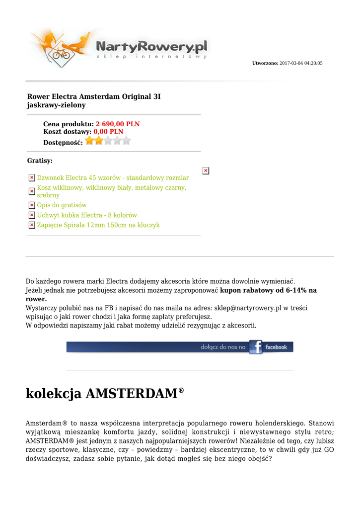 Utworzono: 2017-03-04 04:20:05 Rower Electra Amsterdam Original 3I jaskrawy-zielony Cena produktu: 2 690,00 PLN Koszt dostawy: 0,00 PLN Dostępność: Gratisy: Dzwonek Electra 45 wzorów - standardowy rozmiar Kosz wiklinowy, wiklinowy biały, metalowy czarny, srebrny Opis do gratisów Uchwyt kubka Electra - 8 kolorów Zapięcie Spirala 12mm 150cm na kluczyk Do każdego rowera marki Electra dodajemy akcesoria które można dowolnie wymieniać. Jeżeli jednak nie potrzebujesz akcesorii możemy zaproponować kupon rabatowy od 6-14% na rower. Wystarczy polubić nas na FB i napisać do nas maila na adres: [email protected] w treści wpisując o jaki rower chodzi i jaka formę zapłaty preferujesz. W odpowiedzi napiszamy jaki rabat możemy udzielić rezygnując z akcesorii. kolekcja AMSTERDAM® Amsterdam® to nasza współczesna interpretacja popularnego roweru holenderskiego. Stanowi wyjątkową mieszankę komfortu jazdy, solidnej konstrukcji i niewystawnego stylu retro; AMSTERDAM® jest jednym z naszych najpopularniejszych rowerów! Niezależnie od tego, czy lubisz rzeczy sportowe, klasyczne, czy – powiedzmy – bardziej ekscentryczne, to w chwili gdy już GO doświadczysz, zadasz sobie pytanie, jak dotąd mogłeś się bez niego obejść? DANE TECHNICZNE Rama - aluminiowa 6061-T6 Widelec - stalowy Obręcze - dwukomorowe aluminiowe, polerowane Opony - city 700 x 40c Mechanizm korbowy - aluminiowy 170mm 38 zębów Dźwignie zmiany biegów - shimano revo 3-biegowe Przerzutka przód - brak Przerzutka tył - shimano nexus 3-biegowa Zębatka tył - shimano 19 zębów Łańcuch - taya 1/2" x 1/8" Hamulce - przód - aluminowy szczękowy , tył - hamulec w piaście Siodło - retro skóropodobne z dwiema sprężynami Wspornik siodła - aluminiowy 27,2mm x 300mm Wspornik kierownicy - aluminiowy 1 1/8" Kolor - zielony Wyposażenie specjalne - malowane błotniki pod kolor ramy, pełna osłona łańcucha, aluminiowa podpora boczna, mocowanie do zabezpieczenia szczękowego Dlaczego warto wybrać sklep NartyRowery.pl ? ● ● ● ● ● ● ● ● ● ● ● ● Darmowa Przesyłka Kurierska dla zamówień już od 400 PLN Szybka dostawa w 24h Możliwość zwrotu lub wymiany towaru w ciągu 10 dni od zakupu W naszym sklepie internetowym są tylko aktualnie dostępne produkty (zredukowaliśmy do minimum ryzyko braku dostępności zamówionego towaru) Możliwość negocjacji cen Częste promocje i rabaty ( obniżki cen, rabat na akcesoria, gratisy do rowerów) Fachowe doradztwo Pozytywne opinie w niezależnych serwisach m.in. Opineo, Allegro i porównywarkach cen Możliwość zakupu na raty - obsługujemy systemy Żagiel i Cetelem Sprzedajemy rowery wyregulowane i przesmarowane Do każdego zamówienia otrzymasz paragon lub fakturę stanowiący podstawę gwarancji Szczegółowe informacje o statusie zamówienia i wysyłce na adres e-mail podany ● w zamówieniu Obsługujemy płatności internetowe i Paypal Dołożono wszelkich starań, aby opisy i zdjęcia produktów były dokładne i aktualne. Specyfikacje i ceny mogą ulec zmianie bez uprzedzenia Płeć Damski Przeznaczenie City/ urban, Miejski, Cruiser Widelec/ amortyzator stalowy Manetki shimano revo 3-biegowe Przerzutka przód - Przerzutka tył shimano nexus 3-biegowa Kaseta/ wolnobieg Korbowód Pedały Hamulce shimano 19 zębów aluminiowy 170mm 38 zębów przód - aluminowy szczękowy , tył hamulec w piaście Piasta przód - Piasta tył - Obręcze dwukomorowe aluminiowe, polerowane Szprychy - Kolekcja 2015 Opony city 700 x 40c Stery - Mostek aluminiowy 1 1/8" Kierownica - Chwyty - Siodło retro skóropodobne z dwiema sprężynami Sztyca aluminiowy 27,2mm x 300mm Waga - Rama aluminiowa 6061-T6 Hamulce Torpedo, U-brake Damper - Pegi - Ilość biegów 3 Łańcuch Gwarancja Adres: http://nartyrowery.pl/ taya 1/2" x 1/8" 2 lata Telefon: 34 365 66 09, 793 61 04 29 Email: [email protected] Gadu-Gadu: Skype: