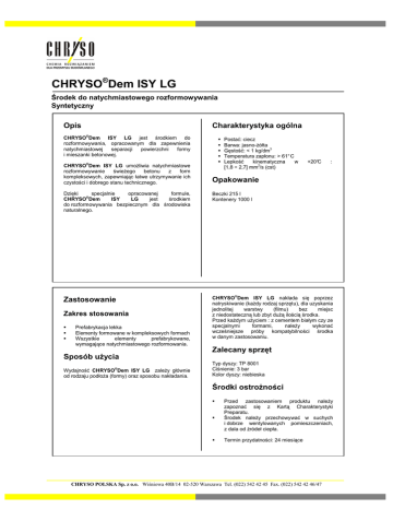 CHRYSO®Dem ISY LG Środek do natychmiastowego rozformowywania Syntetyczny Opis Charakterystyka ogólna ® CHRYSO Dem ISY LG jest środkiem do rozformowywania, opracowanym dla zapewnienia natychmiastowej separacji powierzchni formy i mieszanki betonowej. CHRYSO®Dem ISY LG umoŜliwia natychmiastowe rozformowywanie świeŜego betonu z form kompleksowych, zapewniając łatwe utrzymywanie ich czystości i dobrego stanu technicznego. Postać: ciecz Barwa: jasno-Ŝółta Gęstość: < 1 kg/dm3 Temperatura zapłonu: > 61° C Lepkość kinematyczna w [1,8 ÷ 2,7] mm2/s (cst) +20°C : Opakowanie Dzięki specjalnie opracowanej formule, CHRYSO®Dem ISY LG jest środkiem do rozformowywania bezpiecznym dla środowiska naturalnego. Beczki 215 l Kontenery 1000 l Zastosowanie CHRYSO®Dem ISY LG nakłada się poprzez natryskiwanie (kaŜdy rodzaj sprzętu), dla uzyskania jednolitej warstwy (filmu) bez miejsc z niedostateczną lub zbyt duŜą ilością środka. Przed kaŜdym uŜyciem : z cementem białym czy ze specjalnymi formami, naleŜy wykonać wcześniejsze próby kompatybilności środka w danym zastosowaniu. Zakres stosowania Prefabrykacja lekka Elementy formowane w kompleksowych formach Wszystkie elementy prefabrykowane, wymagające natychmiastowego rozformowania. Zalecany sprzęt Sposób uŜycia Wydajność CHRYSO®Dem ISY LG zaleŜy głównie od rodzaju podłoŜa (formy) oraz sposobu nakładania. Typ dyszy: TP 8001 Ciśnienie: 3 bar Kolor dyszy: niebieska Środki ostroŜności Przed zastosowaniem produktu naleŜy zapoznać się z Kartą Charakterystyki Preparatu. Środek naleŜy przechowywać w suchych i dobrze wentylowanych pomieszczeniach, z dala od źródeł ciepła. Termin przydatności: 24 miesiące CHRYSO POLSKA Sp. z o.o. Wiśniowa 40B/14 02-520 Warszawa Tel. (022) 542 42 45 Fax. (022) 542 42 46/47 CHRYSO®Dem LG Środek do natychmiastowego rozformowywania Syntetyczny BEZPIECZEŃSTWO CHRYSO®Dem LG jest produktem szkodliwym. Kontakt środka ze skórą i oczami moŜe powodować podraŜnienia. NaleŜy stosować odzieŜ ochronną. Nie wdychać oparów w zbyt długim okresie czasu. Szczegółowe informacje z zakresu higieny i środków bezpieczeństwa znajdują się w Karcie Charakterystyki Preparatu. W przypadku dodatkowych pytań, prosimy o kontakt: (+ 48 22) 542 42 45. Niniejsza instrukcja ma charakter informacyjny. Przy jej sporządzaniu korzystaliśmy z naszego wieloletniego doświadczenia przy produkcji domieszek. Jako producent nie ponosimy jednak odpowiedzialności za stosowanie niezgodne z instrukcją. Próby przeprowadzone przed kaŜdorazowym zastosowaniem pozwolą na odpowiednie zweryfikowanie sposobu uŜycia z konkretnymi warunkami pracy. CHRYSO POLSKA Sp. z o.o. Wiśniowa 40B/14 02-520 Warszawa Tel. (022) 542 42 45 Fax. (022) 542 42 46/47