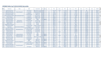 OPONEO Rally Cup'15 (01.03.2015) Generalka Msc. Kierowca 1 2 3 4 5 6 7 8 9 10 11 12 13 14 15 16 17 18 19 20 21 22 23 24 25 26 27 28 29 30 Topolewski Dariusz Witkowski Mirosław Bartoszewsicz Paweł Lewandowski Wiktor Poczwardowski Hubert Erdman Maciej Lewandowski Robert Struensee Dawid Wodarczyk Marek Makowski Bartosz Ziegler Michał Rybałtowski Krzysztof Prusakowski Oskar Sieja Karol Kocemba Arkadiusz Wyrzykowski Daniel Pietrzak Andrzej Szejerka Dariusz Sobkowiak Michał Grochola Marcin Olszewski Piotr Laskowski Tomasz Mencel Krzysztof Wachholz Rafał Wójcicki Przemysław Rosiński Arkadiusz Tyma Krzysztof Kozłowski Radosław Jaworski Przemysław Topolewski Wojciech Pilot Kierus Krzysztof Poczwardowski Kamil Konop Anna Rogowski Jerzy Lewandowski Mikołaj Wyrzyowska Ewa Sołtysiak Michał Szydłowska Marta Olszewski Oskar Rosińska Magdalena Suszek Krzysztof Klub Samochód LKT Wyczół Mitsubishi Lancer A. Toruński Mitsubishi EVO 9 A. Bydgoski Honda Civic A. Wielkopolski BMW E 30 A. Toruński Renault Clio A. Bydgoski BMW TI 318 A. Wielkopolski BMW E 30 A. Bydgoski BMW A. Nowomiejski Honda Civic A. Toruński Peugeot 206 A. Toruński Citroen A. Toruński Honda A. Nowomiejski Subaru Impreza A. Bydgoski Ford Fiesta LKT Wyczół (Oponeo) Astra GSI A. Nowomiejski Honda Civic A. Włocławek Honda CRX A. Nowomiejski Honda Civic A. Wielkopolski Fiat LKT Wyczół BMW A. Toruński BMW A. Toruński Nissan Sunny GTI A. Wielkopolski Fiat A. Bydgoski BMW E36 AKKP BMW E36 A. Toruński Skoda Felicja LKT Wyczół ( Oponeo) BMW E 36 A. Nowomiejski Ford Fiesta Ford Escort LKT Wyczół BMW E36 Poj. Klasa Nr PS 1 kara PS 2 kara PS 3 kara PS 4 kara SUMA 3400 3400 1580 2800 1998 1800 2800 1800 1595 1587 1587 1595 2000 2000 1997 1797 1597 1800 1200 1968 2000 1989 1108 2000 2000 1598 2000 1999 1998 2000 1 31 18 26 58 47 25 29 36 5 17 49 51 35 20 50 57 12 38 27 6 14 34 30 22 11 23 53 15 2 174,79 176,4 179,48 182,48 184,17 185,92 192,83 188,75 189,95 189,32 188,52 189,42 191,63 194,41 191,9 192,62 194,24 196,29 195,47 196,75 195,36 197,12 198,55 199,17 196,46 227,01 201,34 200,27 201,03 204,56 0,00 0 0 0 0 0 0 0 0 0,00 0 0 0 0 0 0 0 0,00 0 0 0,00 0 0 0 0 0,00 0 0 0 0,00 171,46 175,78 179,65 183,89 184,63 187,13 184,68 186,99 187,78 190,15 186,91 187,27 191,87 188,42 190,54 189,88 188,3 190,01 192,64 191,04 192,49 199,67 197,09 195,29 198,39 194,11 196,36 199,73 200,99 199,56 0,00 0,00 0,00 0,00 0,00 0,00 0,00 0,00 0,00 0,00 0,00 0,00 0,00 0,00 0,00 0,00 0,00 0,00 0,00 0,00 0,00 0,00 0,00 0,00 0,00 0,00 0,00 0,00 0,00 0,00 170,62 174,6 178,16 181,08 179,84 185,3 182,77 184,7 185,07 186,2 187,73 188,2 182,24 188,73 187,71 188,93 188,96 189,49 191,14 191 194,9 187,61 191,97 193,13 195,54 183,39 195,25 194,88 196,88 198,77 0,00 0,00 0,00 0,00 0,00 0,00 0,00 0,00 0,00 0,00 0,00 0,00 0,00 0,00 0,00 0,00 0,00 0,00 0,00 0,00 0,00 0,00 0,00 0,00 0,00 0,00 0,00 0,00 0,00 0,00 167 171,79 178,29 180,34 180,69 184,98 183,64 183,79 187,85 185,49 188,25 186,73 186,91 186,96 189,27 188,92 189,62 190,69 190,55 192,09 189,67 189,71 190,03 195,11 193,71 180,34 192,6 193,97 195,27 196,64 0,00 0,00 0,00 0,00 0,00 0,00 0,00 0,00 0,00 0,00 0,00 0,00 0,00 0,00 0,00 0,00 0,00 0,00 0,00 0,00 0,00 0,00 0,00 0,00 0,00 0,00 0,00 0,00 0,00 0,00 683,87 698,57 715,58 727,79 729,33 743,33 743,92 744,23 750,65 751,16 751,41 751,62 752,65 758,52 759,42 760,35 761,12 766,48 769,80 770,88 772,42 774,11 777,64 782,70 784,10 784,85 785,55 788,85 794,17 799,53 4 4 2 4 3 3 4 BMW 2 2 2 2 4 3 3 3 2 3 1 BMW BMW 3 1 BMW BMW 2 BMW 3 3 BMW 31 32 33 34 35 36 37 38 39 40 41 42 43 44 45 46 47 48 49 50 51 52 53 54 55 56 57 58 59 60 Kozłowski Krzysztof Szczęchuła Marcin Kurosiński Wojciech Pniewski Tomasz Kusek Wojciech Swedura Artur Dobrowolski Paweł Laskowski Rafał Krygier Piotr Suszek Paweł Osmański Łukasz Fałkowski Piotr Kochański Dariusz Stefańska Agnieszka Pietrzak Michał Nawrocki Marcin Witkowski Wiktor Suszek Michał Adelman Łukasz Adelman Przemysław Domagalski Tomasz Woziński Patryk Michalska Adela Martuszewski Błażej Ogonowski Radosław Kiliński Krystian Duszyński Dariusz Jagielski Krystian Wiśniewski Piotr Prus Wojciech Czechowska Paulina Suszek Michał Adamski Krzysztof Kochańska Małgorzata Kuźlak Ieneusz Guzowski Marcin Kiliński Krystian Suszek Paweł Adelman Przemysław Adlman Łukasz A. Nowomiejski A. Toruński A. Wielkopolski A. Nowomiejski ATG ATG ATG A. Bydgoski A. Toruński A. Bydgoski A. Nowomiejski A. Toruński A. Toruński ATG A. Toruński A. Bydgoski A. Bydgoski A. Toruński A. Toruński Domagała Damian Witkowski Wiktor Przeszak Anna A. Toruński LKT Wyczół A. Bydgoski A. Toruński A. Toruński A. Nowomiejski A. Toruński Ford Fiesta Fiat 1400 Honda Civic Toyota Fiat Opel Corsa Ford Fiesta AUDI 90 Skoda Fabia Peugeot 106 Opel Corsa Ford Fiesta Fiat 126p Fiat 126p Ford Escort AUDI 90 BMW E 30 BMW E30 Ford Fiesta Alfa Romeo 156 Honda VW Polo Ford Focus Ford Escort Kia Pro Cee'd Suzuki Swift Ford 1999 1600 1108 1400 1797 2000 1747 1598 1300 2300 1800 1360 1389 1598 1108 1108 1996 2300 2000 2000 1999 2492 1590 1400 1998 1996 2000 1298 2000 1395 3 2 1 1 3 3 3 2 1 4 4 1 1 2 1 1 3 4 4 4 3 4 2 1 3 3 3 1 4 1 52 59 39 3 41 43 45 28 21 40 54 48 24 7 46 44 16 33 9 4 37 8 10 13 19 32 42 55 56 113 199,89 206,09 202,46 206,69 229,95 242,94 213,62 224,46 209,93 209,34 194,53 205,78 210,81 221,28 219,15 247,83 198,72 221,99 209,15 213,2 212,99 225,41 227,41 nkl nkl 208,49 340,13 233,97 185,84 209,04 0 0 0 0,00 0 0 0 0 0 0 5 0 0 0,00 0 0 0 0 0,00 0,00 0 0,00 0,00 nkl nkl 0 0 0 0 0 195,44 201,46 208,95 203,3 197,57 196,05 208,93 205,49 209,25 209,27 182,67 219,19 207,84 215,25 213,35 204,98 195,13 215,88 210,17 209,14 274,01 218,75 277,46 nkl nkl 206,33 nkl 216,27 224,61 NKL 0,00 0,00 0,00 0,00 0,00 0,00 0,00 0,00 0,00 0,00 0,00 0,00 0,00 0,00 0,00 0,00 0,00 0,00 0,00 0,00 0,00 0,00 0,00 nkl nkl 0,00 0,00 0,00 0,00 NKL 213,27 200,15 198,67 204,01 194,34 195,98 202,88 202,97 205,77 205,87 181,15 204,24 210,16 195,76 207,79 203,14 1