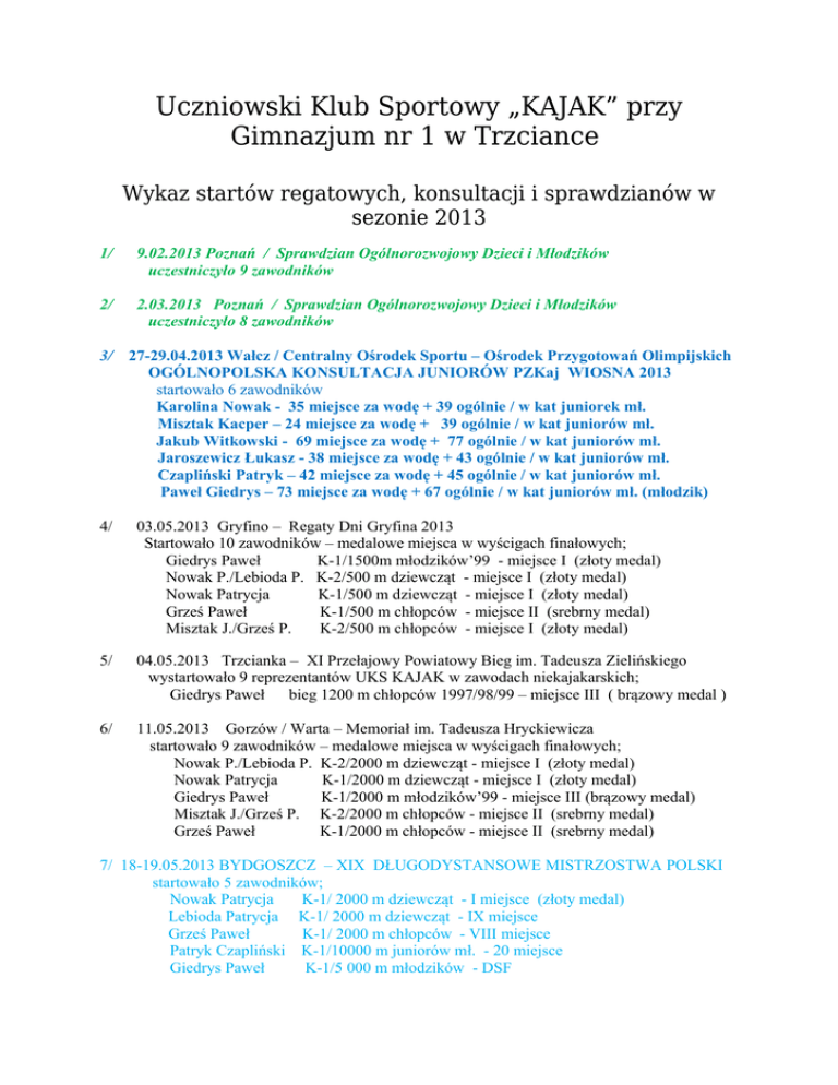 Uczniowski Klub Sportowy „KAJAK” przy Gimnazjum nr 1 w Trzciance Wykaz startów regatowych, konsultacji i sprawdzianów w sezonie 2013 1/ 9.02.2013 Poznań / Sprawdzian Ogólnorozwojowy Dzieci i Młodzików uczestniczyło 9 zawodników 2/ 2.03.2013 Poznań / Sprawdzian Ogólnorozwojowy Dzieci i Młodzików uczestniczyło 8 zawodników 3/ 27-29.04.2013 Wałcz / Centralny Ośrodek Sportu – Ośrodek Przygotowań Olimpijskich OGÓLNOPOLSKA KONSULTACJA JUNIORÓW PZKaj WIOSNA 2013 startowało 6 zawodników Karolina Nowak - 35 miejsce za wodę + 39 ogólnie / w kat juniorek mł. Misztak Kacper – 24 miejsce za wodę + 39 ogólnie / w kat juniorów mł. Jakub Witkowski - 69 miejsce za wodę + 77 ogólnie / w kat juniorów mł. Jaroszewicz Łukasz - 38 miejsce za wodę + 43 ogólnie / w kat juniorów mł. Czapliński Patryk – 42 miejsce za wodę + 45 ogólnie / w kat juniorów mł. Paweł Giedrys – 73 miejsce za wodę + 67 ogólnie / w kat juniorów mł. (młodzik) 4/ 03.05.2013 Gryfino – Regaty Dni Gryfina 2013 Startowało 10 zawodników – medalowe miejsca w wyścigach finałowych; Giedrys Paweł K-1/1500m młodzików’99 - miejsce I (złoty medal) Nowak P./Lebioda P. K-2/500 m dziewcząt - miejsce I (złoty medal) Nowak Patrycja K-1/500 m dziewcząt - miejsce I (złoty medal) Grześ Paweł K-1/500 m chłopców - miejsce II (srebrny medal) Misztak J./Grześ P. K-2/500 m chłopców - miejsce I (złoty medal) 5/ 04.05.2013 Trzcianka – XI Przełajowy Powiatowy Bieg im. Tadeusza Zielińskiego wystartowało 9 reprezentantów UKS KAJAK w zawodach niekajakarskich; Giedrys Paweł bieg 1200 m chłopców 1997/98/99 – miejsce III ( brązowy medal ) 6/ 11.05.2013 Gorzów / Warta – Memoriał im. Tadeusza Hryckiewicza startowało 9 zawodników – medalowe miejsca w wyścigach finałowych; Nowak P./Lebioda P. K-2/2000 m dziewcząt - miejsce I (złoty medal) Nowak Patrycja K-1/2000 m dziewcząt - miejsce I (złoty medal) Giedrys Paweł K-1/2000 m młodzików’99 - miejsce III (brązowy medal) Misztak J./Grześ P. K-2/2000 m chłopców - miejsce II (srebrny medal) Grześ Paweł K-1/2000 m chłopców - miejsce II (srebrny medal) 7/ 18-19.05.2013 BYDGOSZCZ – XIX DŁUGODYSTANSOWE MISTRZOSTWA POLSKI startowało 5 zawodników; Nowak Patrycja K-1/ 2000 m dziewcząt - I miejsce (złoty medal) Lebioda Patrycja K-1/ 2000 m dziewcząt - IX miejsce Grześ Paweł K-1/ 2000 m chłopców - VIII miejsce Patryk Czapliński K-1/10000 m juniorów mł. - 20 miejsce Giedrys Paweł K-1/5 000 m młodzików - DSF 8-9/ 25.05.2013 Wałcz / COS/OPO – XIII Memoriał im. M. Matłoki i XXXII Memoriał im. K. Góreckiego - startowało 13 zawodników - medalowe miejsca w wyścigach finałowych; Grześ Paweł K-1/1000m chłopców - miejsce I (złoty medal) Nowak Patrycja K-1/1000m dziewcząt - miejsce I (złoty medal) Nowak Karolina K-1/ 200 m juniorek mł. - miejsce II (srebrny medal) Nowak P./Gawrońska J. K-2/1000m dziewcząt - miejsce I (złoty medal) Misztak J./ Grześ P. K-2/1000m chłopców - miejsce I (złoty medal) Misztak K./Jaroszewicz Ł. K-2/1000m OPEN - miejsce III (brązowy medal) Misztak K./Witkowski J. K-2/ 200m juniorów mł. - miejsce II (srebrny medal) 10/ 26.05.2012 Poznań/Malta – Otwarte Mistrzostwa Miasta Poznania startowało 13 zawodników – medalowe miejsca w wyścigach finałowych; Nowak Patrycja K-1/500 m dziewcząt - miejsce I (złoty medal) Nowak P/Lebioda P. K-2/500 m dziewczat - miejsce I (złoty medal) Witkowski/Czapliński/Jaroszewicz/Misztak K-4/500m juniorów mł. - miejsce I ( złoty medal ) 11/ 31.05-2.06.2013 Bydgoszcz – REGATY ELIMINACYJNE JUNIORÓW i Młodzików startowało 6 zawodników Karolina Nowak wyścigi K-1/ 500 m juniorek mł. – miejsce 32 Kacper Misztak wyścigi K-1/1000m juniorów mł. – miejsce 15 Łukasz Jaroszewicz wyścigi K-1/1000m juniorów mł. – miejsce 33 Patryk Czapliński wyścigi K-1/1000m juniorów mł. – miejsce 54 Jakub Witkowski wyścigi K-1/1000m juniorów mł. – miejsce 83 ( wszyscy juniorzy młodsi zakwalifikowali się do startu na OOM ) Paweł Giedrys wyścigi K-1/1000 m młodzików'99 - miejsce 16 12/ 9.06.2013 jez. Pamiątkowo – XI Memoriał im. Andrzeja Kulczaka startowało 13 zawodników - medalowe miejsca w wyścigach finałowych; Nowak P. /Lebioda P. K-2/500 m dziewcząt - miejsce I ( złoty medal ) Nowak Patrycja K-1/1000 m dziewcząt - miejsce I ( złoty medal ) Witkowski/Czapliński/Jaroszewicz/Misztak K-4/500 m juniorów mł. – miejsce III ( brązowy medal ) 13/ 22.06.2013 Poznań/Malta – Długodystansowe Regaty im. Rafała Piszcza startowało 2 zawodników – bez sukcesów medalowych 14/ 22.06.2013 Poznań - MIĘDZYWOJEWÓDZKIE MISTRZOSTWA MŁODZIKÓW startowało 5 zawodników - medalowe i punktowane miejsca w wyścigach finałowych; Gawrońska Julia K-1/500 m dziewcząt - miejsce II (srebrny medal–bieg niepunktowany) Nowak Patrycja K-1 /2000 m młodzików - miejsce IX ( 1 pkt. PFSM + 1 pkt. PZKaj) Giedrys Paweł K-1 /2000 m młodzików - miejsce VII ( 1 pkt. PFSM + 1 pkt. PZKaj) 15/ 20-21.07.2013 Bydgoszcz - II MISTRZOSTWA POLSKI MŁODZIKÓW startowało 2 zawodników – miejsca w wyścigach finałowych; Konrad Grześ K-1/2000m młodzików'00 - miejsce XX Paweł Giedrys K-1/2000m młodzików’99 – miejsce IX ( 1 pkt w rankingu PZKaj ) 16/ 15-18.08.2013 Bydgoszcz – XIX OGÓLNOPOLSKA OLIMPIADA MŁODZIEŻY Startowało 5 zawodników – medalowe i punktowane miejsca w wyścigach finałowych; - osada Kacper Misztak / Patryk Czapliński / Jakub Witkowski / Łukasz Jaroszewicz wyścig K-1/500 m juniorów mł. – miejsce I ( złoty medal - 9 pkt PFSM + 10 pkt PZKaj ) - osada Kacper Misztak / Łukasz Jaroszewicz wyścig K-2/1000 m juniorów mł.- miejsce II ( srebrny medal – 7 pkt PFSM + 8 pkt PZKaj ) - Karolina Nowak wyścig K-1/3000 m juniorek mł. - miejsce XI ( 2 punkty w rankingu PFSM ) 17/ 09.09.2013 jez. Pamiątkowo - Mistrzostwa o Puchar Wójta Gminy Rokietnica startowało 12 zawodników - medalowe mie
