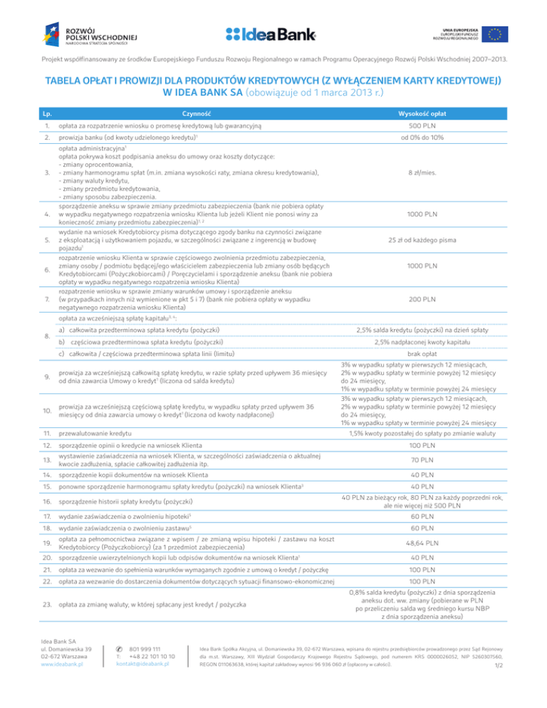 k. Jedna firma.Wspieramy Jeden bank. przedsiębiorczych. Projekt współfinansowany ze środków Europejskiego Funduszu Rozwoju Regionalnego w ramach Programu Operacyjnego Rozwój Polski Wschodniej 2007–2013. TABELA OPŁAT I PROWIZJI dla produktów kredytowych (z wyłączeniem karty kredytowej) w Idea Bank SA (obowiązuje od 1 marca 2013 r.) Lp. Czynność 1. opłata za rozpatrzenie wniosku o promesę kredytową lub gwarancyjną 2. prowizja banku (od kwoty udzielonego kredytu)1 3. 4. 5. 6. 7. Wysokość opłat 500 PLN od 0% do 10% opłata administracyjna1 opłata pokrywa koszt podpisania aneksu do umowy oraz koszty dotyczące: - zmiany oprocentowania, - zmiany harmonogramu spłat (m.in. zmiana wysokości raty, zmiana okresu kredytowania), - zmiany waluty kredytu, - zmiany przedmiotu kredytowania, - zmiany sposobu zabezpieczenia. sporządzenie aneksu w sprawie zmiany przedmiotu zabezpieczenia (bank nie pobiera opłaty w wypadku negatywnego rozpatrzenia wniosku Klienta lub jeżeli Klient nie ponosi winy za konieczność zmiany przedmiotu zabezpieczenia)1, 2 wydanie na wniosek Kredytobiorcy pisma dotyczącego zgody banku na czynności związane z eksploatacją i użytkowaniem pojazdu, w szczególności związane z ingerencją w budowę pojazdu1 rozpatrzenie wniosku Klienta w sprawie częściowego zwolnienia przedmiotu zabezpieczenia, zmiany osoby / podmiotu będącej/ego właścicielem zabezpieczenia lub zmiany osób będących Kredytobiorcami (Pożyczkobiorcami) / Poręczycielami i sporządzenie aneksu (bank nie pobiera opłaty w wypadku negatywnego rozpatrzenia wniosku Klienta) rozpatrzenie wniosku w sprawie zmiany warunków umowy i sporządzenie aneksu (w przypadkach innych niż wymienione w pkt 5 i 7) (bank nie pobiera opłaty w wypadku negatywnego rozpatrzenia wniosku Klienta) 8 zł/mies. 1000 PLN 25 zł od każdego pisma 1000 PLN 200 PLN opłata za wcześniejszą spłatę kapitału3, 4: 8. a) całkowita przedterminowa spłata kredytu (pożyczki) 2,5% salda kredytu (pożyczki) na dzień spłaty b) częściowa przedterminowa spłata kredytu (pożyczki) 2,5% nadpłaconej kwoty kapitału c) całkowita / częściowa przedterminowa spłata linii (limitu) brak opłat 9. prowizja za wcześniejszą całkowitą spłatę kredytu, w razie spłaty przed upływem 36 miesięcy od dnia zawarcia Umowy o kredyt1 (liczona od salda kredytu) 10. prowizja za wcześniejszą częściową spłatę kredytu, w wypadku spłaty przed upływem 36 miesięcy od dnia zawarcia umowy o kredyt1 (liczona od kwoty nadpłaconej) 11. przewalutowanie kredytu 3% w wypadku spłaty w pierwszych 12 miesiącach, 2% w wypadku spłaty w terminie powyżej 12 miesięcy do 24 miesięcy, 1% w wypadku spłaty w terminie powyżej 24 miesięcy 3% w wypadku spłaty w pierwszych 12 miesiącach, 2% w wypadku spłaty w terminie powyżej 12 miesięcy do 24 miesięcy, 1% w wypadku spłaty w terminie powyżej 24 miesięcy 1,5% kwoty pozostałej do spłaty po zmianie waluty 12. sporządzenie opinii o kredycie na wniosek Klienta 13. 100 PLN wystawienie zaświadczenia na wniosek Klienta, w szczególności zaświadczenia o aktualnej kwocie zadłużenia, spłacie całkowitej zadłużenia itp. 70 PLN 14. sporządzenie kopii dokumentów na wniosek Klienta 15. 40 PLN 40 PLN ponowne sporządzenie harmonogramu spłaty kredytu (pożyczki) na wniosek Klienta 3 16. sporządzenie historii spłaty kredytu (pożyczki) Idea Bank Spółka Akcyjna, ul. Domaniewska 39, 02-672 Warszawa, wpisana do rejestru przedsiębiorców prowadzonego przez Sąd Rejonowy 801 999 111 5 Sądowego, pod numerem KRS 0000026052, NIP 5260307560, REGON T: +48 22 288 m.st. Warszawy, XIII Wydział Gospodarczy Krajowego Rejestru 17.80 12wydaniedla zaświadczenia o zwolnieniu hipoteki F: +48 22 288 82 11 011063638, której kapitał zakładowy wynosi 77 346 316 zł (opłacony w całości). [email protected] 18. wydanie zaświadczenia o zwolnieniu zastawu5 40 PLN za bieżący rok, 80 PLN za każdy poprzedni rok, ale nie więcej niż 500 PLN 60 PLN 60 PLN opłata za pełnomocnictwa związane z wpisem / ze zmianą wpisu hipoteki / zastawu na koszt 19. Kredytobiorcy (Pożyczkobiorcy) (za 1 przedmiot zabezpieczenia) 48,64 PLN 20. sporządzenie uwierzytelnionych kopii lub odpisów dokumentów na wniosek Klienta 40 PLN 21. 100 PLN 1 opłata za wezwanie do spełnienia warunków wymaganych zgodnie z umową o kredyt / pożyczkę 22. opłata za wezwanie do dostarczenia dokumentów dotyczących sytuacji finansowo-ekonomicznej 23. opłata za zmianę waluty, w której spłacany jest kredyt / pożyczka Idea Bank SA ul. Domaniewska 39 02-672 Warszawa www.ideabank.pl 801 999 111 +48 22 101 10 10 [email protected] T: 100 PLN 0,8% salda kredytu (pożyczki) z dnia sporządzenia aneksu dot. ww. zmiany (pobierane w PLN po przeliczeniu salda wg średniego kursu NBP z dnia sporządzenia aneksu) Idea Bank Spółka Akcyjna, ul. Domaniewska 39, 02-672 Warszawa, wpisana do rejestru przedsiębiorców prowadzonego przez Sąd Rejonowy dla m.st. Warszawy, XIII Wydział Gospodarczy Krajowego Rejestru Sądowego, pod numerem KRS 0000026052, NIP 5260307560, REGON 011063638, której kapitał zakładowy wynosi 96 936 060 zł (opłacony w całości). 1/2 k. Jedna firma.Wspieramy Jeden bank. przedsiębiorczych. Projekt współfinansowany ze środków Europejskiego Funduszu Rozwoju Regionalnego w ramach Programu Operacyjnego Rozwój Polski Wschodniej 2007–2013. 24. inspekcja nieruchomości przed wypłatą transzy kredytu 300 PLN 25. opłata za monitoring, inspekcja realizacji inwestycji deweloperskiej 3 26. opłata za monitoring zabezpieczeń kredytu / pożyczki 27. nie więcej niż 4000,00 PLN nie więcej niż 500,00 PLN opłata za monitoring Kredytobiorcy nie więcej niż 500,00 PLN 28. opłaty za podwyższone ryzyko z tytułu udzielenia kredytu z niskim wkładem własnym 29. opłata z tytułu podwyższonego ryzyka do czasu ustanowienia hipoteki 1,99% podstawy wyliczenia opłaty (podstawa wyliczenia opłaty = = kwota kredytu w 