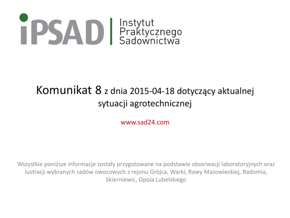 Komunikat 8 z dnia 2015-04-18 dotyczący aktualnej sytuacji agrotechnicznej www.sad24.com Wszystkie poniższe informacje zostały przygotowane na podstawie obserwacji laboratoryjnych oraz lustracji wybranych sadów owocowych z rejonu Grójca, Warki, Rawy Mazowieckiej, Radomia, Skierniewic, Opola Lubelskiego Parch Jabłoni, ocena bieżącej sytuacji Oceniamy, że od początku sezonu wegetacyjnego dojrzało nie więcej niż 25% zarodników workowych parcha jabłoni. Trwające obecnie przesuszenie skutecznie blokowało ich wysiewy, które tylko w znikomych ilościach pojawiły się w niektórych regionach. Warto przypomnieć, że do wysiewów askospor konieczny jest deszcz. Zwilżenie pochodzące z rosy, czy mgły, nie jest w stanie doprowadzić do wyrzutu zarodników workowych. Dopiero w czasie deszczu, który wystąpi po okresie przesuszenia, dochodzi do silnych wysiewów. Są one zwykle początkiem groźnych infekcji. Podobną sytuację mamy obecnie. Znaczna ilość zarodników workowych, dojrzałych i gotowych do wysiewów, ciągle „czeka” w owocnikach na deszcz, by wydostać się na zewnątrz i rozpocząć proces infekcji. Z posiadanych prognoz programu RIM widać, że przewidywany obecnie deszcz może wywołać dziś, (sobota 18 kwietnia) lub jutro, (niedziela 19 kwietnia) w wielu regionach silne wysiewy ascospor. Jednak ze względu na panujące ochłodzenie, infekcje (kiełkowanie wysianych zarodników) mogą rozwijać się powoli. Jeśli nastąpi wysuszenie paków, może okazać się, że do infekcji z wysiewanych obecnie zarodników w ogóle nie dojdzie. Należy na bieżące śledzić wskazania RIM. Trwające ochłodzenie, ponownie wyhamowało przyrost liści. Wydłużyło to istotnie działanie preparatów zapobiegawczych. W obecnych warunkach, czynnikiem określającym długość działania zapobiegawczego fungicydów stają się opady atmosferyczne. Jeśli ostatni zabieg zapobiegawczy (Delan) wykonany był w piątek 17 kwietnia, z całą pewnością ochroni on drzewa przed możliwymi infekcjami. Jeśli zabieg wykonano wcześniej, sugerujemy powtórkę (Delan) , jak tylko pozwoli na to pogoda. Zabieg taki powinien być wykonany ze względu na dodatkową ochronę wnętrza paków, miejsc gdzie wilgoć utrzymuje się najdłużej. Ze względu na trwające ochłodzenie, rozwój zagrożenia przebiegać będzie wolno i zabieg taki może być z powodzeniem wykonany nawet jeszcze w poniedziałek do południa. O dalszych możliwościach ochrony przed parchem jabłoni, poinformujemy w kolejnych komunikatach. UWAGA, ze względu na bardzo wysokie zagrożenie ze strony mączniaka jabłoni, zalecamy stały dodatek produktów siarkowych do fungicydów zwalczających parcha. Zarodnik workowy Worek z zarodnikami Owocnik parcha jabłoni Antenki spustowe Do wysiewów zarodników workowych KONIECZNY JEST DESZCZ. Jedynie zarodniki konidialne (te wytwarzane latem z plam na liściach, szypułkach i owocach) mogą infekować już w warunkach wilgoci z rosy czy mgły. Oprócz wilgoci, która prowadzi do napęcznienia wyrosłych na opadłych zimą liściach owocników, wysiew ostatecznie stymulowany jest przez uderzenie wielu kropel o specjalne „antenki” wyrastające z owocników parcha Pewne znaczenie w procesie uwalniania zarodników workowych ma również światło słoneczne i temperatura. Zwilżenia pochodzące z rosy czy mgły, nie są w stanie doprowadzić do wysiewów askospor!!! Na grafice obok przedstawiony jest schemat opisywanego zjawiska. UWAGA, w rzeczywistości krople wody są kilkadziesiąt razy większe od owocników parcha jabłoni. Antenki spustowe Otwór wyrzutowy ukryty pomiędzy antenkami Na zdjęciu, powiększony 1000 x, wypreparowany z zeszłorocznego liścia owocnik parcha jabłoni. To w nim wytwarzane są worki i zarodniki workowe. Owocnik posiada zwartą budowę, dobrze chroniącą swoje wnętrze i znajdujące się w nim zarodniki. Otwór wyrzutowy W środowisku naturalnym zarodniki workowe mogą wydostać się tylko poprzez specjalny otwór wyrzutowy umieszczony w szczytowej części owocnika. Otwór ten posiada oryginalny mechanizm spustowy, uruchamiany jedynie wówczas, gdy krople deszczu zaczną uderzać o znajdujące się wokół niego, specjalne antenki. Mechanizm uwalniania zarodników workowych parcha jabłoni ma duże konsekwencje dla rozwoju choroby. Mechanizm ten musi być też brany pod uwagę przy opracowywaniu strategii ochrony jabłoni przed parchem. • • • • • • • Jeśli głównym czynnikiem odpowiedzialnym za wysiewy zarodników workowych jest deszcz to znaczy, że w okresach przesuszenia zarodniki workowe nie są uwalniane i nie dochodzi do infekcji. Z tego powodu w okresach bezdeszczowych nie wykonujemy zabiegów, nawet jeśli odstępy pomiędzy poszczególnymi opryskami są znaczne. Zarodniki w okresie trwania wegetacji cały czas dojrzewają. Jeśli nie dochodzi do wysiewów, dojrzałe zarodniki kumulują się w owocnikach. W okresie przesuszenia, kumulacja zarodników gotowych do wysiewu może być znaczna. Deszcz, który wystąpi po okresie przesuszenia, wyzwala w powietrze zwykle olbrzymie ilości zarodników. Jeśli po takim wysiewie utrzymują się korzystne warunki do kiełkowania askospor, może dochodzić do wyjątkowo silnych infekcji. W przypadku wystąpienia masowych wysiewów, a w ich konsekwencji silnego zagrożenia infekcyjnego, należy niezależnie od terminu stosowania preparatów zapobiegawczych , wykonać dodatkowe zabiegi interwencyjne, lub przerywające infekcje (stop spray). Należy pamiętać, że na zjawisko wysiewów zarodników workowych parcha jabłoni i na późniejszy rozwój infekcji, wpływ mają również inne czynniki, jak temperatura powietrza, czy pora doby (w ciągu nocy wysiewa się znacznie mniej zarodników niż w ciągu dnia). Dlatego aby precyzyjnie określić momenty największych wysiewów i najsilniejszych infekcji, należy systematycznie korzystać z programu RIMpro, który jest zdecydowanie naj