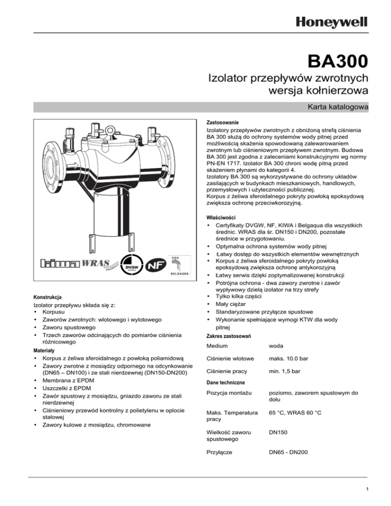 BA300 Izolator przepływów zwrotnych wersja kołnierzowa Karta katalogowa Zastosowanie Izolatory przepływów zwrotnych z obniżoną strefą ciśnienia BA 300 służą do ochrony systemów wody pitnej przed możliwością skażenia spowodowaną zalewarowaniem zwrotnym lub ciśnieniowym przepływem zwrotnym. Budowa BA 300 jest zgodna z zaleceniami konstrukcyjnymi wg normy PN-EN 1717. Izolator BA 300 chroni wodę pitną przed skażeniem płynami do kategorii 4. Izolatory BA 300 są wykorzystywane do ochrony układów zasilających w budynkach mieszkaniowych, handlowych, przemysłowych i użyteczności publicznej. Korpus z żeliwa sferoidalnego pokryty powłoką epoksydową zwiększa ochronę przeciwkorozyjną. Konstrukcja Izolator przepływu składa się z: • Korpusu • Zaworów zwrotnych: wlotowego i wylotowego • Zaworu spustowego • Trzech zaworów odcinających do pomiarów ciśnienia różnicowego Materiały • Korpus z żeliwa sferoidalnego z powłoką poliamidową • Zawory zwrotne z mosiądzy odpornego na odcynkowanie (DN65 – DN100) i ze stali nierdzewnej (DN150-DN200) • Membrana z EPDM • Uszczelki z EPDM • Zawór spustowy z mosiądzu, gniazdo zaworu ze stali nierdzewnej • Ciśnieniowy przewód kontrolny z polietylenu w oplocie stalowej • Zawory kulowe z mosiądzu, chromowane Właściwości • Certyfikaty DVGW, NF, KIWA i Belgaqua dla wszystkich średnic. WRAS dla śr. DN150 i DN200, pozostałe średnice w przygotowaniu. • Optymalna ochrona systemów wody pitnej • Łatwy dostęp do wszystkich elementów wewnętrznych • Korpus z żeliwa sferoidalnego pokryty powłoką epoksydową zwiększa ochronę antykorozyjną • Łatwy serwis dzięki zoptymalizowanej konstrukcji • Potrójna ochrona - dwa zawory zwrotne i zawór wypływowy dzielą izolator na trzy strefy • Tylko kilka części • Mały ciężar • Standaryzowane przyłącze spustowe • Wykonanie spełniające wymogi KTW dla wody pitnej Zakres zastosowań Medium woda Ciśnienie wlotowe maks. 10.0 bar Ciśnienie pracy min. 1,5 bar Dane techniczne Pozycja montażu poziomo, zaworem spustowym do dołu Maks. Temperatura pracy 65 °C, WRAS 60 °C Wielkość zaworu spustowego DN150 Przyłącze DN65 - DN200 1 BA300 Izolator przepływu Działanie Izolatory przepływów zwrotnych typu BA podzielone są na trzy strefy. Ciśnienie w komorze wlotowej (strefa 1) jest wyższe niż w komorze środkowej (strefa 2), które jest z kolei wyższe niż w komorze wylotowej (strefa 3). Spadek ciśnienia pomiędzy poszczególnymi strefami jest dokładnie określony. Jeśli różnica ciśnień pomiędzy strefami 1 i 2 (komorą wlotową i komorą środkową) spadnie do granicy 0,14 bar (poniżej której istnieje ryzyko zalewarowania zwrotnego lub przepływu zwrotnego ciśnieniowego), zawór w komorze środkowej otwiera się do atmosfery a zawory zwrotne zamykają. Woda z komory środkowej wypływa na zewnątrz izolatora, zasilanie w wodę zostaje przerwane i instalacja wodociągowa zabezpieczona. Oznaczenie BA300-... A = Wersja standardowa , wielkość przyłączy kołnierzowych DN 65 – 200, PN 10 Przyłącze Waga Wymiary DN 65 80 100 150 200 kg 23,9 32,7 44,6 70,9 114,1 L 356 440 530 630 763 H 152 167 185 219 254 h 246 275 296 314 346 T 77 77 77 77 77 *F 185 200 220 285 340 35.8 54.3 108 190.9 339.3 35 35 35 35 35 mm Nominalny przepływ przy p = 1 bar 3 m /h Wielkość zrzutu w przypadku awarii m3/h *F - szerokość Akcesoria 5 0 bar 15 16 FY69P Filtr skośny Z podwójnym sitem, korpus z żeliwa szarego, powlekany proszkowo na zewnąrz i wewnątrz. A = wielkość oczek 0.5 mm F76S-F FY69P F76S-F Filtr z płukaniem wstecznym Korpus i osłona siatki wykonane z brązu. Dostępność w przyłączach DN 65 do DN 100, Z wielkością oczek siatki 100 µm lub 200 µm TK295 Zestaw testowy Komputer pomiarowy z odczytem cyfrowym, zasilany bateryjne. Dostarczany w futerale z akcesoriami, idealny do serwisu urządzeń klasy BA. TKA295 Zestaw testowy TKA295 2 TK295 Komputer pomiarowy z odczytem cyfrowym ciśnienia różnicowego. Dostarczany w futerale z akcesoriami, idealny do serwisu urządzeń klasy BA. BA300 Izolator przepływu Przykład montażu Przyłącze DN 65 80 100 150 200 Minimalny prześwit ponad zaworem (mm) 650 650 650 650 650 Prześwit od ściany (mm) 160 160 160 200 200 Zasady instalacji Typowe zastosowania • Zainstalować zawory odcinające z obu stron zaworu Izolatory przepływów zwrotnych BA są zalecane do zastosowań w układach zasilania budynków i obiektów produkcyjno-usługowo-handlowych. Instaluje się w instalacjach wody pitnej w miejscach narażonych na kontakt z płynem zaliczanym do 4 kategorii. Stosowane jako zabezpieczenie główne na przyłączu instalacji do sieci wodociągowej. Powinny być instalowane w układach zasilania m.in.: - obiektów przemysłowych - obiektów produkcyjnych - obiektów usługowych - obiektów handlowych - budynków mieszkalnych wielorodzinnych z częścią produkcyjno-usługowo-handlową • Przed zaworem zainstalować filtr drobnosiatkowy lub filtr skośny o Zainstalowanie filtra potwierdzone wymogami normy PN-EN 1717 • Instalacja na przewodzie poziomym z zaworem spustowym ku dołowi • Zapewnić łatwy dostęp w celu łatwego serwisu i inspekcji • Nie montować w miejscach potencjalnie zagrożonych zalaniem • Pomieszczenie, w którym zamontowano zawór powinno być chronione przed mrozem i dobrze wentylowane • Zapewnić odpowiedniej wielkości odpływ Spadek ciśnienia na zaworze p (bar) Diagram przepływu Przepływ V (m3/godz.) 3 BA300 Izolator przepływu Części zamienne Izolator przepływu BA300, od 2011 Nr Opis Wielkość Nr części 1 DN65 0904052 Zawór zwrotny wlotowy 5 2 5 5 1 3 2 Zawór zwrotny wylotowy 5 DN80 0904053 DN100 0904054 DN150 0904055 DN200 0904056 DN65 0904057 DN80 0904058 DN100 0904059 DN150 0904060 DN200 0904061 DN65 -200 0904062 3 Zawór spustowy 4 Przewód ciśnieniowy DN65 0904063 DN80 0904064 DN100 0904065 DN150 0904066 DN200 090406