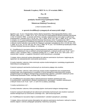 Dziennik Urzędowy MEN Nr 4 z 15 września 2000 r. Poz. 20 Porozumienie pomiędzy Konferencją Episkopatu Polski oraz Ministrem Edukacji Narodowej z dnia 6 września 2000 r. w sprawie kwalifikacji wymaganych od nauczycieli religii Zgodnie z art. 12 ust. 3 Konkordatu między Stolicą Apostolską i Rzecząpospolitą Polską z dnia 28 lipca 1993r. (Dz.U. z 1998r. Nr 51, poz. 318) oraz § 6 rozporządzenia Ministra Edukacji Narodowej z dnia 14 kwietnia 1992r. w sprawie warunków i sposobu organizowania nauki religii w publicznych przedszkolach i szkołach (Dz.U. Nr 36, poz. 155, z 1993r. Nr 83, poz. 380 i z 1999r. Nr 67, poz. 753), w związku z § 10 rozporządzenia Ministra Edukacji Narodowej z dnia 10 października 1991r. w sprawie szczegółowych kwalifikacji wymaganych od nauczycieli oraz określenia szkół i wypadków, w których moŜna zatrudnić nauczycieli nie mających wyŜszego wykształcenia (Dz.U. Nr 98, poz. 433, z 1994r. Nr 5, poz. 19 i Nr 109, poz. 521 oraz z 1999r. Nr 14, poz. 127) Konferencja Episkopatu Polski i Minister Edukacji Narodowej ustalają, co następuje: § 1. Kwalifikacje do nauczania religii w dotychczasowych szkołach średnich ogólnokształcących i średnich zawodowych oraz w szkołach ponad-gimnazjalnych, o których mowa w art. 9 ust. 1 pkt 3 ustawy z dnia 7 września 1991r. o systemie oświaty (Dz. U. z 1996r. Nr 67, poz. 329 z późn. zm.) zwanej dalej "ustawą", z wyjątkiem dwuletnich szkół zawodowych, posiadają: 1) księŜa, którzy ukończyli wyŜsze diecezjalne lub zakonne seminarium duchowne i legitymują się dyplomem lub zaświadczeniem ukończenia seminarium, 2) osoby świeckie i zakonne, które ukończyły wyŜsze studia teologiczne i posiadają przygotowanie katechetyczno-pedagogiczne, 3) alumni wyŜszych seminariów duchownych po ukończeniu piątego roku studiów, 4) osoby świeckie i zakonne, które ukończyły wyŜsze studia magisterskie bez przygotowania teologicznego, ale przygotowanie to uzupełniły w formie teologiczno-katechetycznych studiów podyplomowych lub kolegium teologicznego prowadzonego zgodnie z zasadami ustalonymi przez Konferencję Episkopatu Polski, zwanego dalej "kolegium teologicznym". § 2. Kwalifikacje do nauczania religii w dotychczasowych szkołach zasadniczych oraz w przedszkolach, sześcioletnich szkołach podstawowych, gimnazjach i szkołach zawodowych, o których mowa w art. 9 ust. 1 pkt 1, 2 i pkt 3 lit. b) ustawy, posiadają: 1) osoby wymienione w § 1, 2) osoby świeckie i zakonne, które posiadają dyplom ukończenia kolegium teologicznego, 3) alumni wyŜszych diecezjalnych lub zakonnych seminariów duchownych oraz studenci wyŜszych studiów teologicznych po ukończeniu czwartego roku - jeśli kontynuują studia. § 3. Kwalifikacje do nauczania religii w przedszkolach i szkołach specjalnych, posiadają: 1) księŜa, którzy ukończyli wyŜsze diecezjalne lub zakonne seminarium duchowne i zaliczyli w trakcie studiów zajęcia z zakresu pedagogiki specjalnej i katechezy specjalnej, 2) osoby świeckie i zakonne, które ukończyły wyŜsze studia teologiczne lub kolegium teologiczne i zaliczyły w trakcie studiów zajęcia z zakresu pedagogiki specjalnej i katechezy specjalnej, 3) osoby, spełniające wymagania kwalifikacyjne dla danego typu szkoły określone w § 1 i 2 niniejszego porozumienia, które ponadto ukończyły studia podyplomowe lub kurs kwalifikacyjny w zakresie pedagogiki specjalnej o specjalności nadającej kwalifikacje do pracy w określonym typie szkoły. § 4. 1. Ilekroć w niniejszym porozumieniu jest mowa o przygotowaniu katechetyczno-pedagogicznym naleŜy przez to rozumieć nabycie wiedzy i umiejętności z zakresu pedagogiki, psychologii, katechetyki i dydaktyki, nauczanych w powiązaniu z teologią w wymiarze nie mniejszym niŜ 270 godzin oraz odbycie pozytywnie ocenionych praktyk pedagogicznych w wymiarze nie mniejszym niŜ 150 godzin. 2. O posiadaniu przygotowania katechetyczno-pedagogicznego świadczy dokument ukończenia wyŜszego seminarium duchownego albo dyplom (zaświadczenie) innej szkoły wyŜszej, kolegium teologicznego albo świadectwo ukończenia kursu katechetyczno-pedagogicznego prowadzonego przez kolegium teologiczne, wyŜsze seminarium duchowne lub inną szkołę wyŜszą. 3. Skierowanie nauczyciela religii do danej szkoły, wydane przez właściwego biskupa diecezjalnego zaświadcza o posiadaniu kwalifikacji do nauczania religii. § 5. Nauczyciele religii zatrudnieni w dniu wejścia w Ŝycie porozumienia, którzy legitymują się świadectwem dojrzałości i ukończyli instytut wyŜszej kultury religijnej, studium katechetyczne lub kursy katechetyczne mogą nauczać religii w przedszkolach i szkołach, o których mowa w § 2 do dnia 31 sierpnia 2006r. § 6. Traci moc porozumienie pomiędzy Konferencją Episkopatu Polski oraz Ministrem Edukacji Narodowej z dnia 8 czerwca 1993r. w sprawie kwalifikacji zawodowych wymaganych od nauczycieli religii (Dz. Urz. MEN Nr 6, poz. 21). § 7. Porozumienie wchodzi w Ŝycie z dniem podpisania. w imieniu Konferencji Episkopatu Polski Ks. Biskup Kazimierz Nycz w z. Sekretarza Konferencji Episkopatu Polski Ks. Lucjan Skolik Minister Edukacji Narodowej Edmund Wittbrodt