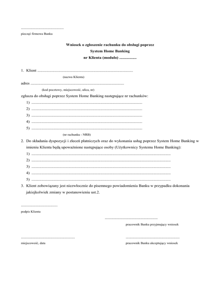 .......................................... pieczęć firmowa Banku Wniosek o zgłoszenie rachunku do obsługi poprzez System Home Banking nr Klienta (modulo) ................. 1. Klient .............................................................................................. (nazwa Klienta) adres ............................................................................................ (kod pocztowy, miejscowość, ulica, nr) zgłasza do obsługi poprzez System Home Banking następujące nr rachunków: 1) ............................................................................................................. 2) ............................................................................................................. 3) ............................................................................................................. 4) ............................................................................................................. 5) ............................................................................................................. (nr rachunku - NRB) 2. Do składania dyspozycji i zleceń płatniczych oraz do wykonania usług poprzez System Home Banking w imieniu Klienta będą upoważnione następujące osoby (Użytkownicy Systemu Home Banking): 1) ......................................................................................................................................... 2) ......................................................................................................................................... 3) ......................................................................................................................................... 4) ......................................................................................................................................... 5) ......................................................................................................................................... 3. Klient zobowiązany jest niezwłocznie do pisemnego powiadomienia Banku w przypadku dokonania jakiejkolwiek zmiany w postanowieniu ust.2. .................................... podpis Klienta .................................................... pracownik Banku przyjmujący wniosek ..................................................... ..................................................... miejscowość, data pracownik Banku akceptujący wniosek