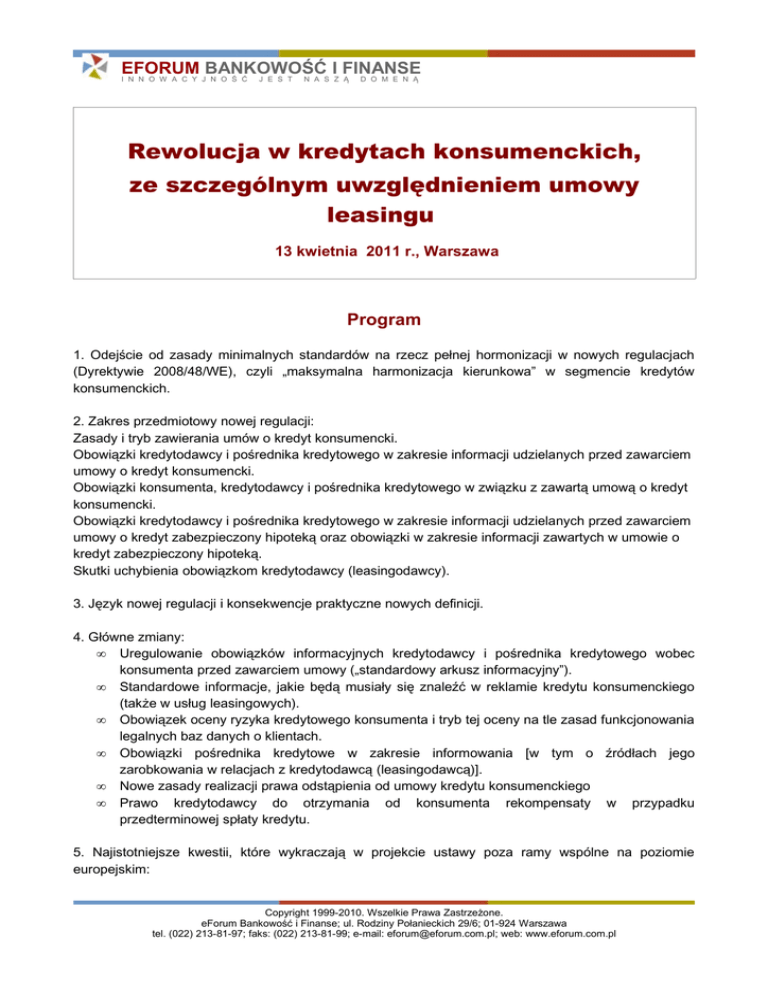 EFORUM BANKOWOŚĆ I FINANSE I N N O W A C Y J N O Ś Ć J E S T N A S Z Ą D O M E N Ą Rewolucja w kredytach konsumenckich, ze szczególnym uwzględnieniem umowy leasingu 13 kwietnia 2011 r., Warszawa Program 1. Odejście od zasady minimalnych standardów na rzecz pełnej hormonizacji w nowych regulacjach (Dyrektywie 2008/48/WE), czyli „maksymalna harmonizacja kierunkowa” w segmencie kredytów konsumenckich. 2. Zakres przedmiotowy nowej regulacji: Zasady i tryb zawierania umów o kredyt konsumencki. Obowiązki kredytodawcy i pośrednika kredytowego w zakresie informacji udzielanych przed zawarciem umowy o kredyt konsumencki. Obowiązki konsumenta, kredytodawcy i pośrednika kredytowego w związku z zawartą umową o kredyt konsumencki. Obowiązki kredytodawcy i pośrednika kredytowego w zakresie informacji udzielanych przed zawarciem umowy o kredyt zabezpieczony hipoteką oraz obowiązki w zakresie informacji zawartych w umowie o kredyt zabezpieczony hipoteką. Skutki uchybienia obowiązkom kredytodawcy (leasingodawcy). 3. Język nowej regulacji i konsekwencje praktyczne nowych definicji. 4. Główne zmiany: • Uregulowanie obowiązków informacyjnych kredytodawcy i pośrednika kredytowego wobec konsumenta przed zawarciem umowy („standardowy arkusz informacyjny”). • Standardowe informacje, jakie będą musiały się znaleźć w reklamie kredytu konsumenckiego (także w usług leasingowych). • Obowiązek oceny ryzyka kredytowego konsumenta i tryb tej oceny na tle zasad funkcjonowania legalnych baz danych o klientach. • Obowiązki pośrednika kredytowe w zakresie informowania [w tym o źródłach jego zarobkowania w relacjach z kredytodawcą (leasingodawcą)]. • Nowe zasady realizacji prawa odstąpienia od umowy kredytu konsumenckiego • Prawo kredytodawcy do otrzymania od konsumenta rekompensaty w przypadku przedterminowej spłaty kredytu. 5. Najistotniejsze kwestii, które wykraczają w projekcie ustawy poza ramy wspólne na poziomie europejskim: Copyright 1999-2010. Wszelkie Prawa Zastrzeżone. eForum Bankowość i Finanse; ul. Rodziny Połanieckich 29/6; 01-924 Warszawa tel. (022) 213-81-97; faks: (022) 213-81-99; e-mail: [email protected]; web: www.eforum.com.pl EFORUM BANKOWOŚĆ I FINANSE I N N O W A C Y J N O Ś Ć J E S T N A S Z Ą D O M E N Ą • • • • • Umowy o kredyt, na mocy których termin spłaty nie przekracza trzech miesięcy a konsument zobowiązany jest uiścić jedynie „nieznaczne opłaty”, o których mowa w art. 2 ust. 2 lit. f dyrektywy. Umowy o kredyt zabezpieczony hipoteką, o których mowa w art. 2 ust. 2 lit a dyrektywy. Umowy o kredyt w kwocie niższej niż 200 Euro, o których mowa w art. 2 ust. 2 lit. c dyrektywy (leasing niskokwotowy). Umowy o kredyt, przy których od konsumenta wymaga się złożenia tytułem zabezpieczenia przedmiotu u kredytodawcy, o których mowa w art. 2 ust. 2 lit. k dyrektywy. 6. Przypadki wyłączenia umów kredytowych z pod reżimu dyrektywy i projektu ustawy, ze szczególnym akcentem na umowę leasingu, jeżeli umowa ta nie przewiduje obowiązku przeniesienia własności przedmiotu umowy na konsumenta. 7. Kategorie ekonomiczne w nowych regulacjach: • • • • • Całkowity koszt kredytu, czyli wszelkie koszty, które konsument zobowiązany jest ponieść w związku z umową o kredyt, w szczególności odsetki, opłaty, prowizje, podatki i marże jeżeli są znane kredytodawcy oraz koszty usług dodatkowych (w tym ubezpieczeń). Całkowita kwota kredytu. Całkowita kwota do zapłaty przez konsumenta. Stopa referencyjna a stopa oprocentowania kredytu (w tym stałej stopy oprocentowania kredytu). Rzeczywista roczna stopa oprocentowania, czyli całkowity koszt kredytu ponoszony przez konsumenta, wyrażony jako wartość procentowa całkowitej kwoty kredytu w stosunku rocznym. Sposób implementacji art. 3 lit. i dyrektywy. 8. Umowy zawierane z wykorzystaniem komunikacji elektronicznej, ze szczególnym akcentem na obowiązki informacyjne i czas ich wykonywania. 9. Walutowy kredyt konsumencki 10. Zlikwidowanie lub zmniejszenie asymetrii informacji przez zapewnienie konsumentom dostępu do bardziej przejrzystej, rzetelnej i pełniejszej informacji na temat oferty kredytu konsumenckiego. 11. Szczegółowe zasady dotyczące reklamowania umowy kredytu konsumenckiego (w tym usługi leasingowej). 12. Reprezentatywność konsumenckiego. przykładów wykorzystywanych do prezentowania warunków 13. Podsumowanie zmian. 14. Pytania i dyskusja. Copyright 1999-2010. Wszelkie Prawa Zastrzeżone. eForum Bankowość i Finanse; ul. Rodziny Połanieckich 29/6; 01-924 Warszawa tel. (022) 213-81-97; faks: (022) 213-81-99; e-mail: [email protected]; web: www.eforum.com.pl kredytu