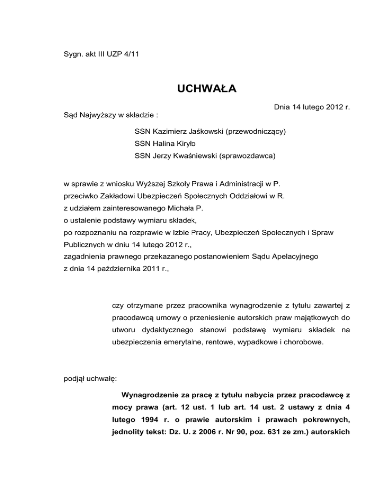 Sygn. akt III UZP 4/11 UCHWAŁA Dnia 14 lutego 2012 r. Sąd Najwyższy w składzie : SSN Kazimierz Jaśkowski (przewodniczący) SSN Halina Kiryło SSN Jerzy Kwaśniewski (sprawozdawca) w sprawie z wniosku Wyższej Szkoły Prawa i Administracji w P. przeciwko Zakładowi Ubezpieczeń Społecznych Oddziałowi w R. z udziałem zainteresowanego Michała P. o ustalenie podstawy wymiaru składek, po rozpoznaniu na rozprawie w Izbie Pracy, Ubezpieczeń Społecznych i Spraw Publicznych w dniu 14 lutego 2012 r., zagadnienia prawnego przekazanego postanowieniem Sądu Apelacyjnego z dnia 14 października 2011 r., czy otrzymane przez pracownika wynagrodzenie z tytułu zawartej z pracodawcą umowy o przeniesienie autorskich praw majątkowych do utworu dydaktycznego stanowi podstawę wymiaru składek na ubezpieczenia emerytalne, rentowe, wypadkowe i chorobowe. podjął uchwałę: Wynagrodzenie za pracę z tytułu nabycia przez pracodawcę z mocy prawa (art. 12 ust. 1 lub art. 14 ust. 2 ustawy z dnia 4 lutego 1994 r. o prawie autorskim i prawach pokrewnych, jednolity tekst: Dz. U. z 2006 r. Nr 90, poz. 631 ze zm.) autorskich 2 praw majątkowych do utworu stworzonego przez pracownika w wyniku wykonywania obowiązków ze stosunku pracy stanowi podstawę wymiaru składek na ubezpieczenie emerytalne, rentowe, wypadkowe i chorobowe określone w art. 18 ust. 1 w związku z art. 6 ust. 1 pkt 1, art. 4 pkt 9. art. 11 ust.1 i art. 12 ust. 1 ustawy z dnia 13 października 1998 r. o systemie ubezpieczeń społecznych (jednolity tekst: Dz. U. z 2009 r. Nr 205, poz. 1585 ze zm.). UZASADNIENIE W stanie faktycznym, w którym strony oprócz umowy o pracę zawarły także umowę o przeniesienie autorskich praw majątkowych, organ rentowy – Zakład Ubezpieczeń Społecznych Oddział w R. wydał decyzję z dnia 15 września 2010 r. zobowiązującą płatnika – Wyższą Szkołę Prawa i Administracji w P. – do zapłacenia od wynagrodzenia wypłaconego pracownikowi z tytułu zawartej umowy o przeniesienie autorskich praw majątkowych do utworu dydaktycznego składki na wszystkie rodzaje ubezpieczenia. Organ rentowy uznał bowiem że zawarta przez strony stosunku pracy umowa o przeniesienie autorskich praw majątkowych stanowi w rzeczywistości umowę o dzieło, o której mowa w art. 8 ust. 2a ustawy z 13 października 1998 r. o systemie ubezpieczeń społecznych (Dz. U. z 2009 r. Nr 205, poz. 1585). W odwołaniu od tej decyzji płatnik zakwestionował jej podstawę; jego zdaniem umowa o przeniesienie praw autorskich do utworu dydaktycznego jest odmienną rodzajowo umową od umowy o dzieło, i nie podpada pod zakres składki z art. 8 ust. 2a ustawy o systemie ubezpieczeń społecznych. Wyrokiem z dnia 1 czerwca 2011 r. Sąd Okręgowy – Sąd Pracy i Ubezpieczeń Społecznych w P. oddalił odwołanie. Sąd Okręgowy ustalił, że Wyższą Szkołę Prawa i Administracji w P. (płatnik) oraz Michała P. (zainteresowanego) łączyła umowa o pracę w pełnym wymiarze czasu pracy na stanowisku profesora uczelni. Zgodnie z jej treścią wysokość wynagrodzenia została ustalona w załączniku do umowy. W aneksach do umowy o 3 pracę ustalono wysokość wynagrodzenia zasadniczego, na które składało się honorarium z tytułu przeniesienia autorskich praw majątkowych do utworu naukowego w postaci wyników badań niezbędnych do przeprowadzenia procesu dydaktycznego, honorarium z tytułu przeniesienia autorskich praw majątkowych do utworu dydaktycznego w postaci przygotowania i wygłoszenia wykładów oraz opracowania zajęć dydaktycznych, a także wynagrodzenie za pracę dydaktyczną i organizacyjną nie objętą ochroną wynikającą z prawa autorskiego. W umowach o przeniesienie praw autorskich zainteresowany zobowiązał się wykonać utwór dydaktyczny tj. wygłosić wykład, utrwalić program zajęć, przeprowadzić zaliczenia sesyjne, prowadzić promotorstwo prac dyplomowych jak i dokonać recenzji tych prac; ponadto zobowiązał się przenieść na uczelnię przysługujące mu do utworu dydaktycznego prawa majątkowe, a uczelnia zobowiązała się do dokonania zapłaty przy przyjęciu zasad wskazanych w umowie (honorarium jako iloczyn ilości prac, godzin, recenzji egzaminowanych i stawki ustalonej dla danego utworu po przedstawieniu rachunków). Honorarium miało być płacone miesięcznie od wygłoszonego wykładu i utrwalenia zajęć, a ostateczne rozliczenia następowało na zakończenie roku akademickiego po przedstawieniu rachunku. Z ustaleń tych – według Sądu - nie wynika, aby zajęcia, o których mowa w umowie o przeniesienie autorskich praw majątkowych były realizowane poza programem nauczania. Także system wynagradzania w tym względzie nie jest jasny. Na wynagrodzenie zasadnicze ze stosunku pracy nakłada się honorarium z tytułu przeniesienia praw autorskich. Nie można uznać wszystkich czynności opisanych w umowach o przeniesienie autorskich praw majątkowych jako utworów w rozumieniu przepisów prawa autorskiego. Nie są przejawem indywidualnego ujęcia tematu czynności rutynowe i powtarzające się jak np. przeprowadzenie egzaminów i zaliczeń. Do tego typu utworów należało stosować przepisy Kodeksu cywilnego o umowach o świadczenie usług, a w szczególności umowy o dzieło. Przychód osiągnięty z tytułu wykonywania tych czynności należy wobec tego kwalifikować jako podlegający oskładkowaniu na podstawie art. 18 w związku z art. 6 ust. 1 pkt 1 i art. 8 ust. 2 a ustawy o systemie ubezpieczeń społecznych. Mając na uwadze to, że umowę o przeniesienie praw autorskich zawarto po zmianie ustawy o systemie ubezpieczeń społecznych polegającej na wprowadzeniu art. 8 ust. 2a, 4 Sąd Okręgowy uznał ją – w ustalonych okolicznościach – za podjętą z zamiarem obejścia prawa, co czyni tę umowę nieważną na podstawie art. 58 § 1 k.c. Apelacja płatnika oparta została na zarzucie naruszenia prawa materialnego przez niezasadne przyjęcie, iż do umowy o przeniesie