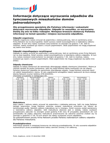 Informacje dotyczące wyrzucania odpadków dla tymczasowych mieszkańców domów jednorodzinnych Oto przygotowane specjalnie dla Państwa informacje i wskazówki dotyczące wyrzucania odpadków. Odpadki to wszystko, co wyrzucamy. Dzielą się one na kilka rodzajów. Niniejsza broszura dostarczy Państwu informacji na temat sposobu i miejsca wyrzucania odpadków. Odpadki organiczne Odpadki organiczne należy wrzucać do pojemnika z zieloną pokrywą. Jest on opróżniany przez firmę Netwerk raz na dwa tygodnie. Dzień wywozu został wyszczególniony w kalendarzu odbioru odpadów. W tym dniu należy wystawić swój kontener na zewnątrz do godziny 7.30. Jeśli to możliwe, należy wystawić go razem z innymi pojemnikami. Obok pojemników nie mogą znajdować się żadne inne śmieci. Odpadki niepodlegające recyklingowi Odpadki te należy wrzucać do pojemnika z szarą pokrywą. Jest on opróżniany przez firmę Netwerk raz na dwa tygodnie. Dzień wywozu został wyszczególniony w kalendarzu odbioru odpadów. W tym dniu należy wystawić swój kontener na zewnątrz do godziny 7.30. Jeśli to możliwe, należy wystawić go razem z innymi pojemnikami. Obok pojemników nie mogą znajdować się żadne inne śmieci. Odpady chemiczne Odpady te należy dostarczyć do samochodu zbierającego odpady chemiczne (chemokar). Można je również zanieść do punku sortowania. Jeśli nie mają Państwo takiej możliwości lub nie zdążyli Państwo dostarczyć odpadów do samochodu zbierającego odpady, mogą Państwo wówczas zlecić ich odbiór bezpośrednio z domu. W celu uzgodnienia szczegółów należy zadzwonić do biura obsługi klienta Netwerk (numer telefonu 078-6222244). Chemokar przyjeżdża w następujące dni. Maasplaza 9:00 - 13.00 6-12-08 03-01-09 07-02-09 07-03-09 04-04-09 02-05-09 06-06-09 04-07-09 01-08-09 05-09-09 03-10-09 07-11-09 05-12-09 Sterrenburgplein 9:00 - 13.00 13-12-08 10-01-09 14-02-09 14-03-09 11-04-09 09-05-09 13-06-09 11-07-09 08-08-09 12-09-09 10-10-09 14-11-09 12-12-09 Bieshof 9:00 - 13.00 20-12-08 17-01-09 21-02-09 21-03-09 18-04-09 16-05-09 20-06-09 18-07-09 15-08-09 19-09-09 17-10-09 21-11-09 19-12-09 Damplein 9:00 - 13.00 16-12-08 20-01-09 17-02-09 17-03-09 21-04-09 19-05-09 16-06-09 21-07-09 18-08-09 15-09-09 20-10-09 17-11-09 15-12-09 Admiraalsplein 13:00 – 17:00 03-12-08 07-01-09 04-02-09 04-03-09 01-04-09 06-05-09 03-06-09 01-07-09 05-08-09 02-09-09 07-10-09 04-11-09 02-12-09 Makulatura Stary papier i tekturę należy wrzucać do pojemnika z niebieską pokrywą. Jeśli nie mają Państwo takiego pojemnika, mogą Państwo wówczas związać makulaturę sznurkiem lub włożyć do kartonowego pudła. Netwerk odbiera makulaturę raz w miesiącu. Dzień wywozu został zaznaczony w kalendarzu odbioru odpadów. Jeśli makulatura zbierana jest w sobotę, należy wystawić przygotowany pakunek na zewnątrz przed godziną 9.00 rano. W przypadku pozostałych dni (od poniedziałku do piątku włącznie) makulatura przeznaczona do zabrania powinna znaleźć się na zewnątrz o godzinie 17.30. W tych dniach nie należy wystawiać innych odpadków. Za pośrednictwem poczty firma Netwerk prześle Państwu kalendarium odbioru odpadów dla Państwa mieszkania. Przedsiębiorstwa Informacje zawarte w niniejszej broszurze nie dotyczą przedsiębiorstw. W celu usuwania odpadków wytwarzanych przez przedsiębiorstwa należy zawrzeć umowę z ich odbiorcą. Pools, laagbouw, versie 15 december 2008 Informacje dotyczące wyrzucania odpadków dla tymczasowych mieszkańców domów jednorodzinnych Odpadki budowlane i rozbiórkowe Odpady powstałe podczas prac budowlanych przeprowadzanych we własnych domach należy dostarczyć do punktu sortowania (Baanhoekweg 8-12, Dordrecht). Można również wynająć specjalny kontener. Aby go zamówić należy zadzwonić do działu obsługi przedsiębiorstw w firmie Netwerk (numer telefonu 078-6222247). Jeśli wykonują Państwo prace budowlane na czyjeś zlecenie, wówczas śmieci, które Państwo wyrzucają są traktowane jako odpady wytwarzane przez przedsiębiorstwa. W sklepie z materiałami budowlanymi należy kupić tzw. „big bag”. Mogą Państwo również wynająć duży kontener od jednego z odbiorców odpadków. Jeśli zamierzają Państwo usuwać azbest, muszą Państwo każdorazowo uzyskać pozwolenie od gminy. W tym celu należy zadzwonić pod numer 078 639 89 89. Azbest należy dostarczyć do punktu sortowania. Konieczne jest, aby był on dostarczony w specjalnym plastikowym opakowaniu. Darmowe opakowania można odbierać w punkcie sortowania. Szkło Puste opakowania szklane po produktach spożywczych, napojach, kosmetykach i lekarstwach należy wrzucać do pojemnika na szkło. Pozostałe odpady szklane powinny trafiać do kontenerów na odpady niepodlegające recyklingowi. Pojemniki na szkło znajdują się w centrach handlowych. Duże kawałki szkła, szyby i lustra należy dostarczyć do punktu sortowania (Baanhoekweg 8-12, Dordrecht). Urządzenia elektryczne Urządzenia elektryczne należy oddać do sklepu, w którym kupują Państwo nowe urządzenie. Można je również dostarczyć do punktu sortowania (Baanhoekweg 8-12, Dordrecht). Mniejsze urządzenia zbiera również samochód zbierający odpadki chemiczne (chemokar). Jeśli jednak nie zdążyli Państwo dostarczyć ich do samochodu zbierającego odpadki lub nie mają Państwo możliwości przewiezienia ich do punktu sortowania, mogą Państwo zlecić odbiór zużytych urządzeń elektrycznych bezpośrednio z domu. W celu uzgodnienia szczegółów należy zadzwonić do biura obsługi klienta Netwerk (numer telefonu 078-6222244). Duże odpady z gospodarstw domowych Duże odpady należy dostarczyć do punktu sortowania (Baanhoekweg 812, Dordrecht). Jeśli nie mają Państwo takiej możliwości, mogą Państwo zamówić darmowy wywóz. W tym celu należy skontaktować się przez Internet z odbiorcą odpadów. Adres strony internetowej to www.grofvuil.net. Jeśli nie maja Pań