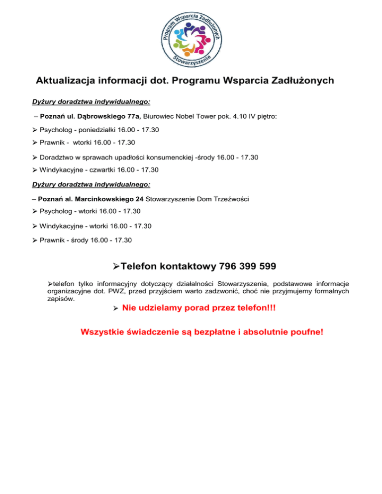 Aktualizacja informacji dot. Programu Wsparcia Zadłużonych Zadłu Dyżury ury doradztwa indywidualnego indywidualnego: browskiego 77a, 77a Biurowiec Nobel Tower pok. 4.10 IV piętro: ętro: – Poznań ul. Dąbrowskiego Psycholog - poniedziałki 16.00 - 17.30 Prawnik - wtorki 16.00 - 17.30 Doradztwo w sprawach upadłości upadłoś konsumenckiej -środy 16.00 - 17.30 Windykacyjne - czwartki 16.00 - 17.30 Dyżury ury doradztwa indywidualnego indywidualnego: – Poznań al. Marcinkowskiego 24 Stowarzyszenie Dom Trzeźwości Psycholog - wtorki 16.00 - 17.30 Windykacyjne - wtorki 16.00 - 17.30 Prawnik - środy 16.00 - 17.30 Telefon kontaktowy 796 399 599 telefon tylko informacyjny dotyczący dotycz działalności ci Stowarzyszenia, podstawowe informacje organizacyjne dot. PWZ, przed przyjściem przyj warto zadzwonić, choćć nie przyjmujemy formalnych zapisów. Nie udzielamy porad przez telefon!!! Wszystkie świadczenie s są bezpłatne i absolutnie poufne! poufne