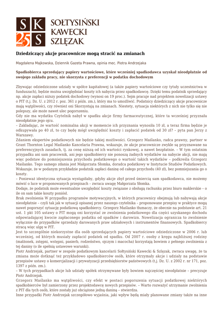 Dziedziczący akcje pracownicze mogą stracić na zmianach Magdalena Majkowska, Dziennik Gazeta Prawna, opinia mec. Piotra Andrzejaka Spadkobierca sprzedający papiery wartościowe, które wcześniej spadkodawca uzyskał nieodpłatnie od swojego zakładu pracy, nie skorzysta z preferencji w podatku dochodowym Zbywając odziedziczone udziały w spółce kapitałowej (a także papiery wartościowe czy tytuły uczestnictwa w funduszach), będzie można uwzględniać koszty ich nabycia przez spadkodawcę. Dzięki temu podatnik sprzedający np. akcje zapłaci niższy podatek dochodowy (wynosi on 19 proc.). Sejm pracuje nad projektem nowelizacji ustawy o PIT (t.j. Dz. U. z 2012 r. poz. 361 z późn. zm.), który ma to umożliwić. Podatnicy dziedziczący akcje pracownicze mają wątpliwości, czy również oni Skorzystają na zmianach. Niestety, sytuacja niektórych z nich nie tylko się nie polepszy, ale może nawet ulec pogorszeniu. Gdy nie ma wydatku Czytelnik nabył w spadku akcje firmy farmaceutycznej, które ta wcześniej przyznała nieodpłatnie jego ojcu. – Zakładając, że wartość nominalna akcji w momencie ich przyznania wynosiła 10 zł, a teraz firma będzie je odkupywała po 40 zł, to czy będę mógł uwzględnić koszty i zapłacić podatek od 30 zł? – pyta pan Jerzy z Warszawy. Zdaniem ekspertów podatkowych nie będzie takiej możliwości. Grzegorz Maślanko, radca prawny, partner w Grant Thornton Legal Maślanko Kancelaria Prawna, wskazuje, że akcje pracownicze zwykle są przyznawane na preferencyjnych zasadach, tj. za cenę niższą od ich wartości rynkowej, a nawet bezpłatnie. – W tym ostatnim przypadku ani sam pracownik, ani jego spadkobiercy nie ponoszą żadnych wydatków na nabycie akcji, nie mają więc podstaw do pomniejszenia przychodu podatkowego o wartość takich wydatków – podkreśla Grzegorz Maślanko. Tego samego zdania jest Małgorzata Słomka, doradca podatkowy w Instytucie Studiów Podatkowych. Wskazuje, że w podanym przykładzie podatnik zapłaci daninę od całego przychodu (40 zł), bez pomniejszania go o koszty. – Ponieważ identyczna sytuacja wystąpiłaby, gdyby akcje zbył przed śmiercią sam spadkodawca, nie możemy mówić o luce w proponowanych przepisach – zwraca uwagę Małgorzata Słomka. Dodaje, że podatnik może ewentualnie uwzględnić koszty związane z obsługą rachunku przez biuro maklerskie – o ile on sam takie koszty poniósł. Brak zwolnienia W przypadku programów motywacyjnych, w których pracownicy obejmują lub nabywają akcje nieodpłatnie – czyli tak jak w sytuacji opisanej przez naszego czytelnika – proponowane przepisy w praktyce mogą nawet pogorszyć sytuację podatkową spadkobiercy. Grzegorz Maślanko tłumaczy, że obecnie na podstawie art. 21 ust. 1 pkt 105 ustawy o PIT mogą oni korzystać ze zwolnienia podatkowego dla części uzyskanego dochodu odpowiadającej kwocie zapłaconego podatku od spadków i darowizn. Nowelizacja ogranicza to zwolnienie wyłącznie do przypadków sprzedaży darowanych praw udziałowych i instrumentów finansowych. Spadkobiercy stracą więc ulgę w PIT. Jest to szczególnie niekorzystne dla osób sprzedających papiery wartościowe odziedziczone w 2006 r. lub wcześniej, od których musiały zapłacić podatek od spadku. Od 2007 r. osoby z kręgu najbliższej rodziny (małżonek, zstępni, wstępni, pasierb, rodzeństwo, ojczym i macocha) korzystają bowiem z pełnego zwolnienia z tej daniny (o ile spełnią ustawowe warunki). Piotr Andrzejak, partner w zespole podatkowym kancelarii Sołtysiński Kawecki & Szlęzak, zwraca uwagę, że ta zmiana może dotknąć też przykładowo spadkobierców osób, które otrzymały akcje i udziały na podstawie przepisów ustawy o komercjalizacji i prywatyzacji przedsiębiorstw państwowych (t.j. Dz. U. z 2002 r. nr 171, poz. 1397 z późn. zm.). – W tych przypadkach akcje lub udziały spółek otrzymywane były bowiem najczęściej nieodpłatnie – precyzuje Piotr Andrzejak. Grzegorz Maślanko ma wątpliwości, czy efekt w postaci pogorszenia sytuacji podatkowej niektórych spadkobierców był zamierzony przez projektodawcę nowych przepisów. – Warto rozważyć utrzymanie zwolnienia z PIT dla tych osób, które zostały już obciążone jedną daniną – stwierdza. Inne przypadki Piotr Andrzejak szczegółowo wyjaśnia, jaki wpływ będą miały planowane zmiany także na inne formy programów akcjonariatu pracowniczego. Ekspert wskazuje, że najczęściej występujące w Polsce rozwiązania zakładają objęcie lub nabycie akcji (udziałów) po cenie referencyjnej (rynkowej) lub zdyskontowanej (tj. obniżonej względem ceny referencyjnej). W tych wypadkach nowelizacja istotnie zmniejszy obciążenia podatkowe spadkobierców. – Oznaczać to będzie rzeczywiste opodatkowanie tylko wzrostu wartości udziałów lub akcji ustalonej na dzień sprzedaży ponad historyczne koszty poniesione przez spadkodawcę, a związane z ich zakupem i posiadaniem – mówi Piotr Andrzejak. Rzadziej spotykaną formą akcjonariatu pracowniczego w naszym kraju są przypadki nabywania innych niż akcje papierów wartościowych, a także jednostek uczestnictwa, tytułów uczestnictwa lub certyfikatów inwestycyjnych w funduszach kapitałowych. – W efekcie możliwość potrącenia przez spadkobierców wydatków ponoszonych na nabycie tego typu praw majątkowych przez spadkodawców będzie miała ograniczone znaczenie – uważa Piotr Andrzejak. Na zmianach skorzystają jednak spadkobiercy osób, które nabyły takie prawa majątkowe bez związku z wykonywaną pracą. – Z kolei w programach opcyjnych, gdzie pracownikom nie są przyznawane papiery wartościowe, a bonusem są np. niezbywalne opcje, nowe regulacje nie znajdą zastosowania – podkreśla ekspert kancelarii Sołtysiński Kawecki & Szlęzak. Takich przypadków nowelizacja nie obejmuje. Oznacza to, że w momencie np. zamiany opcji niezbywalnych na akcje spadkobierca nie będzie mia