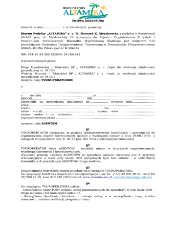 UMOWA AGENCYJNA Zawarta w dniu ……………… r. w Katowicach, pomiędzy: Biurem Podróży „ALTAMIRA” s. c. W. Mroczek K. Myszkowska z siedzibą w Katowicach 40-487 przy ul. Mysłowickiej 26 wpisanym do Rejestru Organizatorów Turystyki i Pośredników Turystycznych Marszałka Województwa Śląskiego pod numerem 812 posiadającym Gwarancję Ubezpieczeniową Turystyczną w Towarzystwie Ubezpieczeniowym SIGNAL IDUNA Polska pod nr M 256457 NIP: 954-26-85-298 REGON: 241361843 reprezentowanym przez: Kingę Myszkowską – Właściciel BP „ ALTAMIRA” s. c. /wpis do ewidencji działalności gospodarczej nr 18132/ Wiolettę Mroczek – Właściciel BP „ ALTAMIRA” s. c. /wpis do ewidencji działalności gospodarczej nr 18131/ zwanym dalej TOUROPERATOREM a ………………………………………………………………………………………………………………………. z siedzibą ………………………………………ul…………………………………………………… REGON…………………………………… NIP………………..…………………………………..… Zezwolenie na prowadzoną działalność nr………………, wydanie dnia………………….. przez……………………………………………………………………………………………………………… telefon……………………………………………………, fax……………………………………….. adres e-mail……………………………………………., strona www …………………………… nazwa banku i nr rachunku:…………………. …………………………………………………. reprezentowanym przez …………………..……………………………………………………….. zwanym dalej AGENTEM. §1 TOUROPERTATOR oświadcza, że posiada udokumentowane kwalifikacje i uprawnienia do organizowania imprez turystycznych zgodnie z wymogami ustawy z dnia 29.08.1997r. o usługach turystycznych (Dz. U. Nr 31 poz. 301 wraz z późniejszymi zmianami). §2 TOUROPERATOR zleca AGENTOWI sprzedaż miejsc w imprezach organizowanych, współorganizowanych i koordynowanych. Wysokość prowizji należnej AGENTOWI za sprzedane miejsca określana jest w systemie rezerwacyjnym a także przy okazji ofert specjalnych typu last minute - w oddzielnych komunikatach przesyłanym AGENTOWI drogą mailową. §3 Dokumentacja wszystkich imprez znajduje się w siedzibie TOUROPERATORA. Do dyspozycji AGENTA i innych biur współpracujących są: tel. (+48) 32 209 30 66, fax (+48) 32/760 22 38, kom 510 910 100 Internet: www.altamira.net.pl, [email protected] §4 Do obowiązku TOUROPERATORA należy: - Dostarczenie AGENTOWI wykazu usług przeznaczonych do sprzedaży, w tym także ofert – drogą mailową i lub katalogów/ulotek itp. - Szczegółowe określenie charakteru i rodzaju usług, a w szczególności trasy, środka transportu, terminu realizacji, programu i ceny. §5 AGENT nie ponosi odpowiedzialności za wykonanie usług lub wadliwe wykonanie usług przez TOUROPERATORA oraz za szkody wynikłe z dostarczenia przez TOUOPERATORA niepełnych lub błędnych informacji o usługach. §6 AGENT zobowiązuje się do: - Dokonania sprzedaży tylko i wyłącznie w oparciu o system rezerwacyjny TOUROPERATORA. Agent zobowiązany jest do dołączenia– warunków uczestnictwa Touroperatora. - W przypadku rezygnacji Klienta z imprezy turystycznej – należy o tym fakcie niezwłocznie poinformować Touroperatora w formie pisemnej z podpisem Klienta. W przypadku rezygnacji z imprezy przez Klienta, już po przelaniu pełnej kwoty po potrąceniu prowizji na konto Touroperatora – Touroperator na konto Agenta dokonana zwrotu kosztów po potrąceniu kosztów związanych z anulacją. Kwotę tą Agent zobowiązany jest niezwłocznie zwrócić Klientowi. Za imprezy anulowane nie przysługuje AGENTOWI prowizja. - Zapoznania się z „Warunkami Uczestnictwa” w imprezach organizowanych przez TOUROPERATORA. - Dbania o dobre imię TOUROPERATORA. - Należyte wykonywanie innych poleceń i wskazówek TOUROPERATORA – związanych z wykonaniem niniejszej umowy. Druk umowy zgłoszenia – jest to pobrania na stronie internetowej Touroperatora oraz w systemie rezerwacyjnym. §7 AGENT zobowiązuje się do tego że Klient wykupujący miejsca na imprezie, zapozna się z „Warunkami Uczestnictwa” i potwierdzi ich akceptację własnoręcznym podpisem. Zasady płatności i anulacji imprez podane są w „Warunkach Uczestnictwa”. W szczególnych przypadkach terminy anulacji, warunki tychże anulacji mogą być korygowane za obopólnym porozumieniem. §8 Rozliczenia pomiędzy AGENTEM a TOUROPERATOREM. Agent zobowiązany jest do wpłaty na konto Touroperatora pełnej kwoty wartości imprezy po potrąceniu ustalonej prowizji. - Zaliczka /min. 30% /ceny imprezy - kwota zaliczki winna być przelana niezwłocznie przez AGENTA w całości na rachunek bankowy TOUROPERATORA w terminie do 3 dni od daty podpisania umowy zgłoszenia. - Dopłata do pełnej należności: - 30 dni przed rozpoczęciem imprezy W przypadku imprez typu Last minute lub imprez, które rozpoczynają się w terminie krótszym niż 30 dni od dnia podpisania umowy kwota wpłacona przez Klienta pomniejszona o prowizję powinna być niezwłocznie przelana przez AGENTA na rachunek bankowy TOUROPERATORA. Numer konta: ING BANK ŚLĄSKI 48 1050 1214 1000 0090 7057 8951 Numer konta walutowego: ING Bank Śląski PL 40 1050 1214 1000 0090 7140 7184 SWIFT ING BP LPW §9 W razie opóźnienia z zapłatą AGENT zobowiązany będzie do uiszczenia na rzecz Touroperatora ustawowych odsetek. § 10 W celu ujednolicenia ceny dla Klienta prowizja AGENTA uwzględniona jest w cenie katalogowej i AGENT nie ma prawa oferowania oraz sprzedaży miejsc w imprezach TOUROPERATORA po cenach wyższych niż w tych katalogowych. § 11 W związku z wejściem w życie Ustawy o usługach turystycznych sta