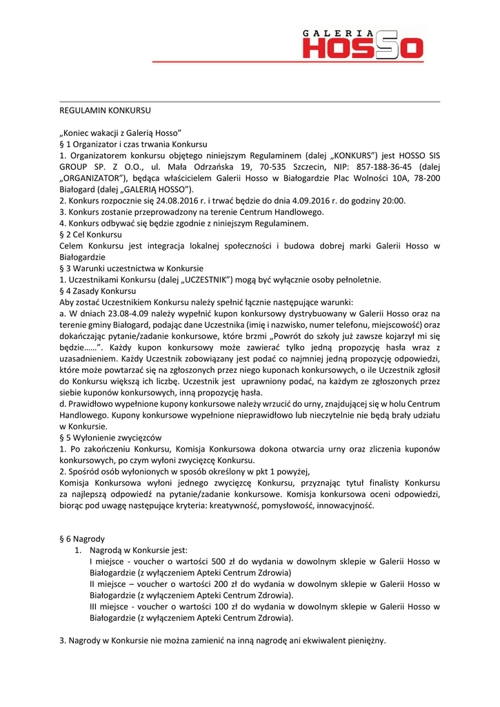 REGULAMIN KONKURSU „Koniec wakacji z Galerią Hosso” § 1 Organizator i czas trwania Konkursu 1. Organizatorem konkursu objętego niniejszym Regulaminem (dalej „KONKURS”) jest HOSSO SIS GROUP SP. Z O.O., ul. Mała Odrzańska 19, 70-535 Szczecin, NIP: 857-188-36-45 (dalej „ORGANIZATOR”), będąca właścicielem Galerii Hosso w Białogardzie Plac Wolności 10A, 78-200 Białogard (dalej „GALERIĄ HOSSO”). 2. Konkurs rozpocznie się 24.08.2016 r. i trwać będzie do dnia 4.09.2016 r. do godziny 20:00. 3. Konkurs zostanie przeprowadzony na terenie Centrum Handlowego. 4. Konkurs odbywać się będzie zgodnie z niniejszym Regulaminem. § 2 Cel Konkursu Celem Konkursu jest integracja lokalnej społeczności i budowa dobrej marki Galerii Hosso w Białogardzie § 3 Warunki uczestnictwa w Konkursie 1. Uczestnikami Konkursu (dalej „UCZESTNIK”) mogą być wyłącznie osoby pełnoletnie. § 4 Zasady Konkursu Aby zostać Uczestnikiem Konkursu należy spełnić łącznie następujące warunki: a. W dniach 23.08-4.09 należy wypełnić kupon konkursowy dystrybuowany w Galerii Hosso oraz na terenie gminy Białogard, podając dane Uczestnika (imię i nazwisko, numer telefonu, miejscowość) oraz dokańczając pytanie/zadanie konkursowe, które brzmi „Powrót do szkoły już zawsze kojarzył mi się będzie……”. Każdy kupon konkursowy może zawierać tylko jedną propozycję hasła wraz z uzasadnieniem. Każdy Uczestnik zobowiązany jest podać co najmniej jedną propozycję odpowiedzi, które może powtarzać się na zgłoszonych przez niego kuponach konkursowych, o ile Uczestnik zgłosił do Konkursu większą ich liczbę. Uczestnik jest uprawniony podać, na każdym ze zgłoszonych przez siebie kuponów konkursowych, inną propozycję hasła. d. Prawidłowo wypełnione kupony konkursowe należy wrzucić do urny, znajdującej się w holu Centrum Handlowego. Kupony konkursowe wypełnione nieprawidłowo lub nieczytelnie nie będą brały udziału w Konkursie. § 5 Wyłonienie zwycięzców 1. Po zakończeniu Konkursu, Komisja Konkursowa dokona otwarcia urny oraz zliczenia kuponów konkursowych, po czym wyłoni zwycięzcę Konkursu. 2. Spośród osób wyłonionych w sposób określony w pkt 1 powyżej, Komisja Konkursowa wyłoni jednego zwycięzcę Konkursu, przyznając tytuł finalisty Konkursu za najlepszą odpowiedź na pytanie/zadanie konkursowe. Komisja konkursowa oceni odpowiedzi, biorąc pod uwagę następujące kryteria: kreatywność, pomysłowość, innowacyjność. § 6 Nagrody 1. Nagrodą w Konkursie jest: I miejsce - voucher o wartości 500 zł do wydania w dowolnym sklepie w Galerii Hosso w Białogardzie (z wyłączeniem Apteki Centrum Zdrowia) II miejsce – voucher o wartości 200 zł do wydania w dowolnym sklepie w Galerii Hosso w Białogardzie (z wyłączeniem Apteki Centrum Zdrowia). III miejsce - voucher o wartości 100 zł do wydania w dowolnym sklepie w Galerii Hosso w Białogardzie (z wyłączeniem Apteki Centrum Zdrowia). 3. Nagrody w Konkursie nie można zamienić na inną nagrodę ani ekwiwalent pieniężny. 4. Organizator nie ponosi odpowiedzialności za zakupiony za pomocą vouchera towar. Wszelkie reklamacje dotyczące nagrody należy zgłaszać do właściwego zakupowi sklepu. Zwycięzcy Konkursu nie mogą przenieść prawa do otrzymania nagrody na osoby trzecie. Wraz z wręczeniem nagrody Organizator wyda zwycięzcy Konkursu voucher uprawniający do odbioru nagrody § 7 Ogłoszenie zwycięzców 1. Zwycięzcy zostaną ogłoszeni 6 września 2016 o godz. 13:00 na stronie www Galerii, poprzez podanie imienia i nazwiska laureata oraz brzmienia zwycięskiej odpowiedzi na pytanie/zadanie konkursowe. 2. Nagrodę należy odebrać osobiście, po uprzednim kontakcie z osobą wskazaną przez Organizatora Konkursu. 3. Nagroda zostanie wydana zwycięzcy po okazaniu dowodu tożsamości oraz po potwierdzeniu prawdziwości danych. § 8 Komisja konkursowa 1. Organizator powoła komisję konkursową 2. Komisja nadzorować będzie zgodność przeprowadzenia konkursu zgodnie z zasadami wynikającymi z niniejszego regulaminu. 4. Komisja będzie organem przeprowadzającym postępowanie reklamacyjne. § 9 Reklamacje Wszelkie reklamacje dotyczące Konkursu należy zgłaszać do Organizatora w formie pisemnej na adres jego siedziby w terminie 14 dni od zakończenia Konkursu, pod rygorem utraty wszelkich roszczeń Uczestnika z tytułu udziału w Konkursie. § 10 Postanowienia końcowe 1. Regulamin niniejszego Konkursu jest do wglądu w siedzibie Organizatora, na stronie internetowej: www a także u Kierownika Galerii. 2. Dane osobowe Uczestników będą zbierane i przetwarzane zgodnie z Ustawą z dnia 29 sierpnia 1997 o ochronie danych osobowych przez Organizatora (lub jego podwykonawców) dla celów związanych z organizacją i przeprowadzeniem Konkursu. Uczestnicy wyrażają zgodę (dobrowolność) na wykorzystanie i przetwarzanie przez Organizatora swoich danych uzyskanych w związku z organizacją i przeprowadzeniem Konkursu. Uczestnicy mają prawo wglądu w swoje dane oraz prawo do ich poprawiania. 3. Organizator zastrzega sobie prawo do zmiany Regulaminu Konkursu w trakcie jego trwania, jeżeli nie wpłynie to na pogorszenie warunków uczestnictwa w Konkursie. 4. Prawa i obowiązki Organizatora oraz Uczestników określone są wyłącznie w niniejszym Regulaminie; wszelkie informacje o Konkursie dostępne w materiałach reklamowych mają charakter jedynie informacyjny. 5. Poprzez zgłoszenie do Konkursu w sposób określony w § 4 Uczestnik potwierdza, że zapoznał się z niniejszym Regulaminem, rozumie jego postanowienia oraz wyraża zgodę na wszystkie zasady Konkursu zawarte w niniejszym Regulaminie i zobowiązuje się do ich przestrzegania.